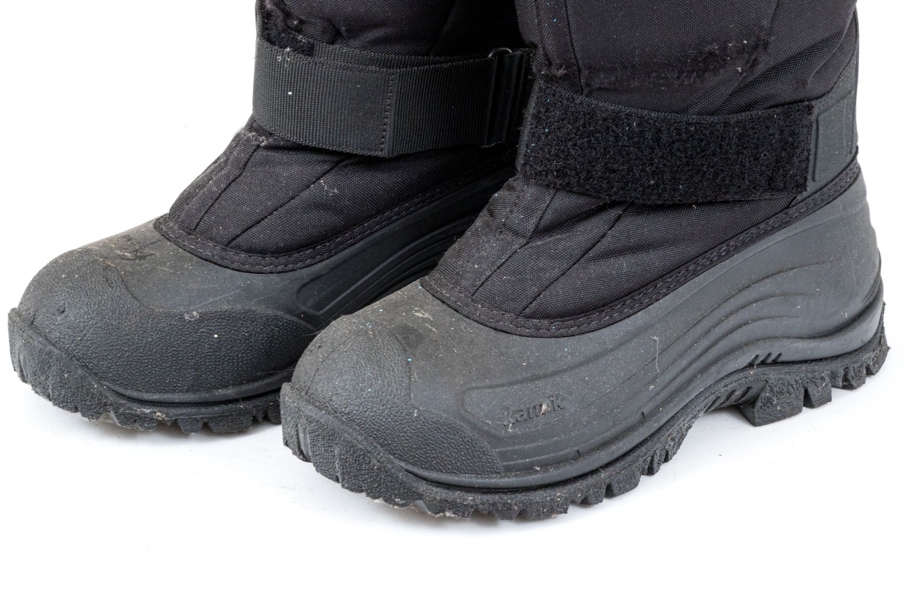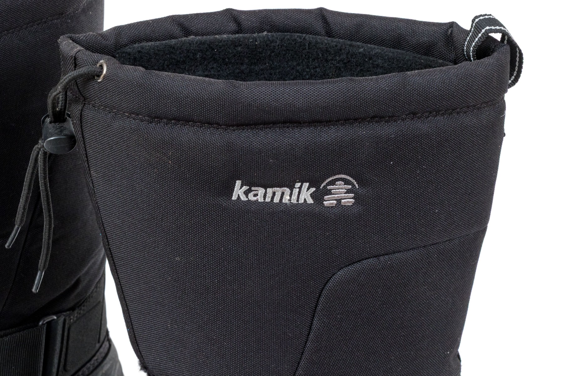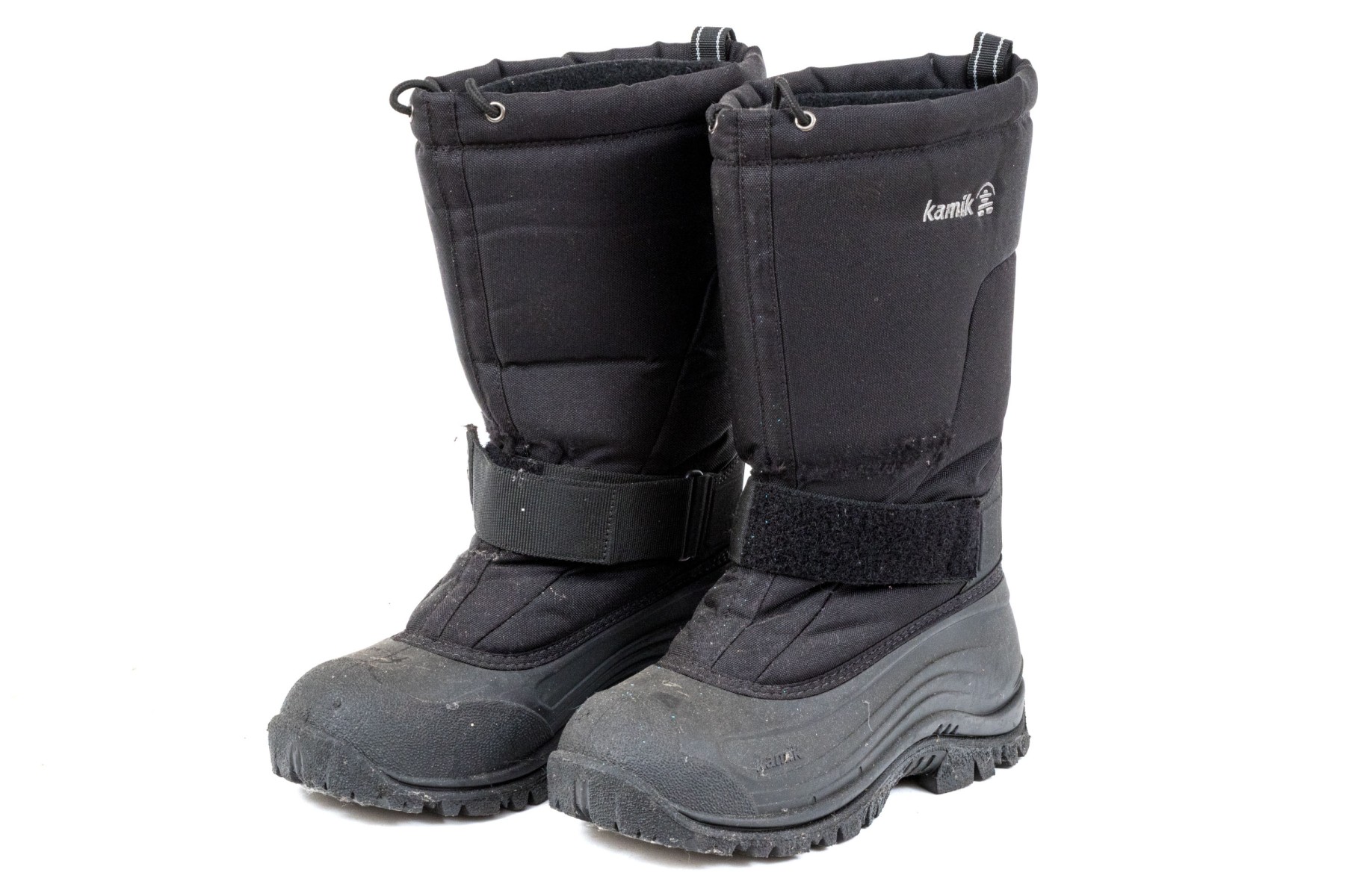 A great pair of Kamik Greenbay winter boots designed with drawstrings at the top rim and velcro straps at the front ankles for a snug fit in comfortable nylon, and lower heels and toes in sturdy black rubber.