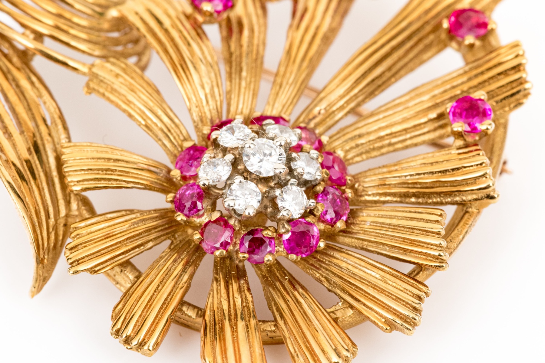 Karbra 14k yellow gold magnificent vintage ruby and diamond flower cluster brooch. This stunning vintage brooch, signed 1963, features a daisy style flower with a center cluster of round brilliant cut diamonds, app. 0.28 TCW, surrounded by a halo of round faceted rubies, app. 0.48 TCW, all prong set.