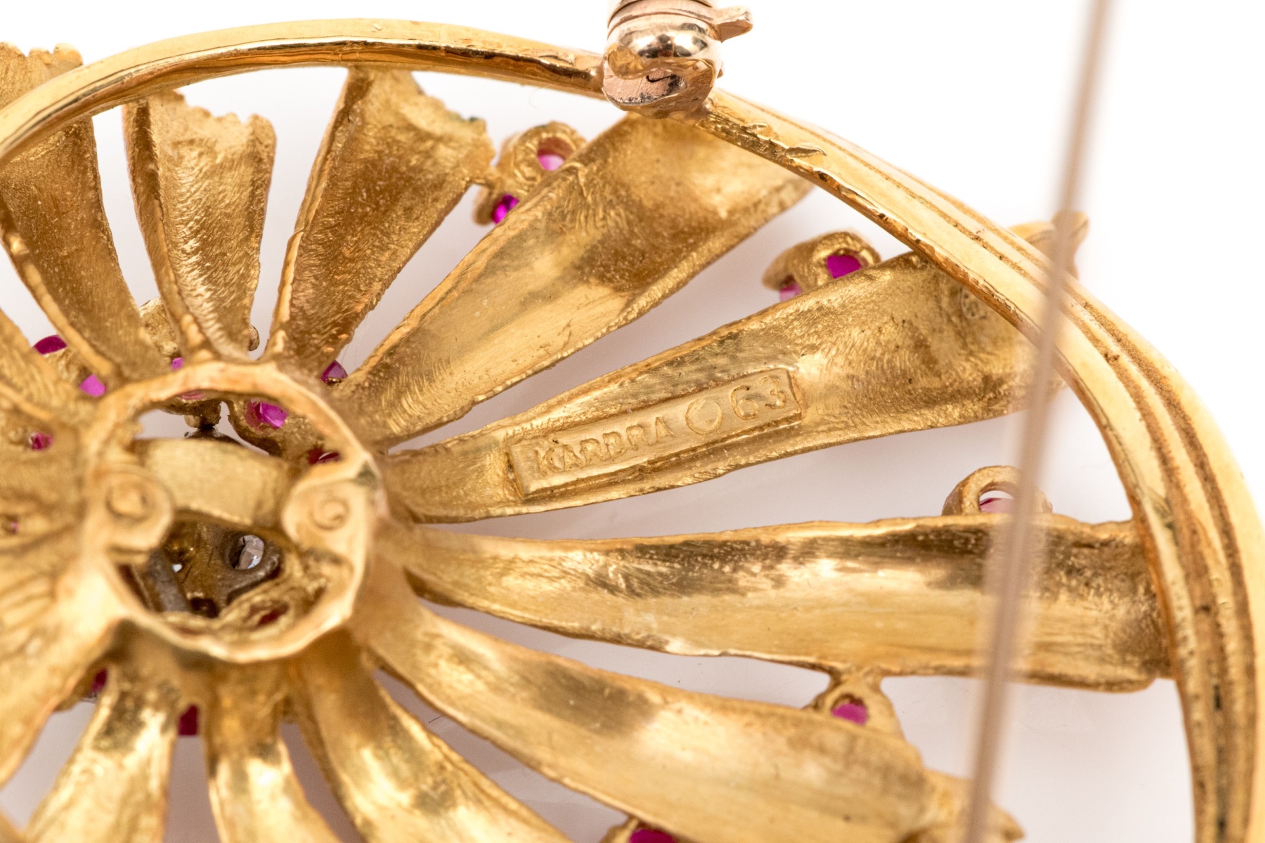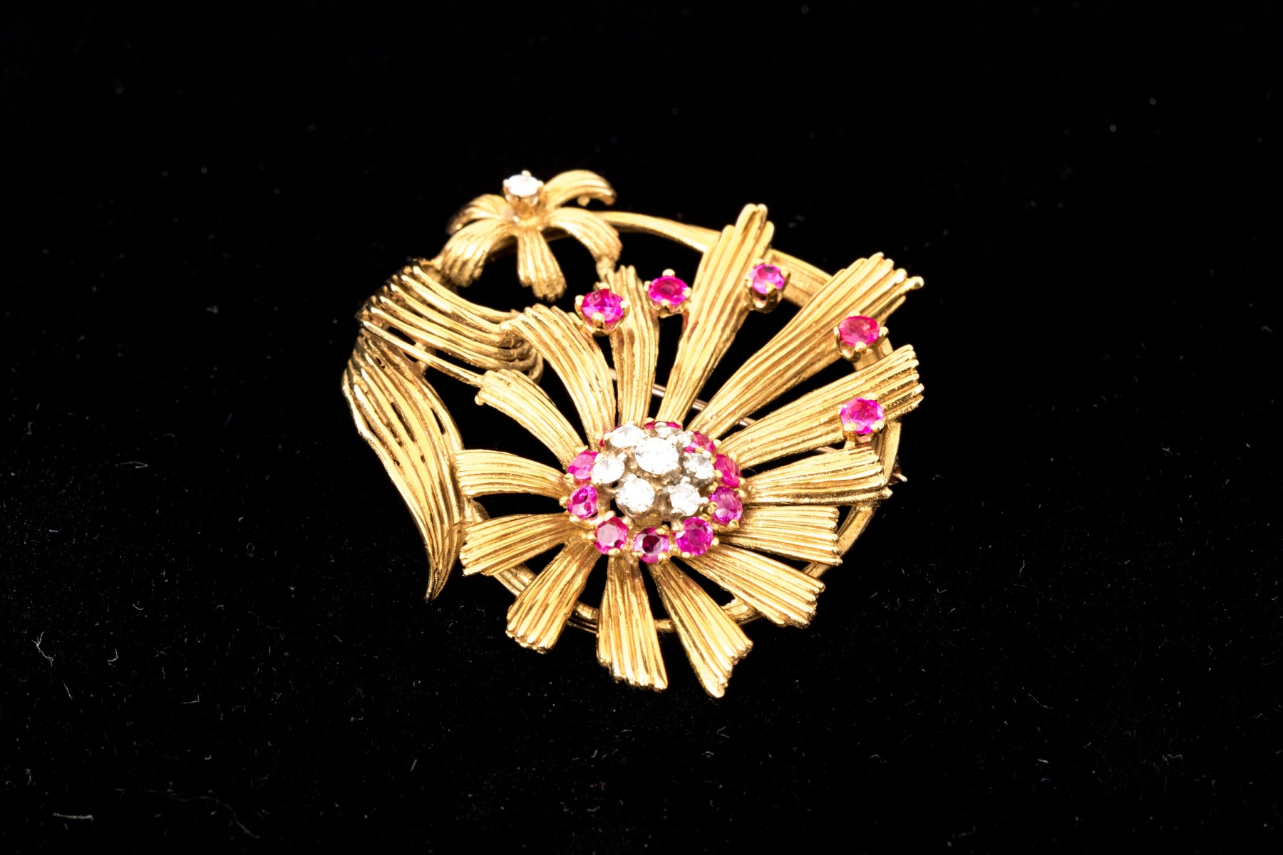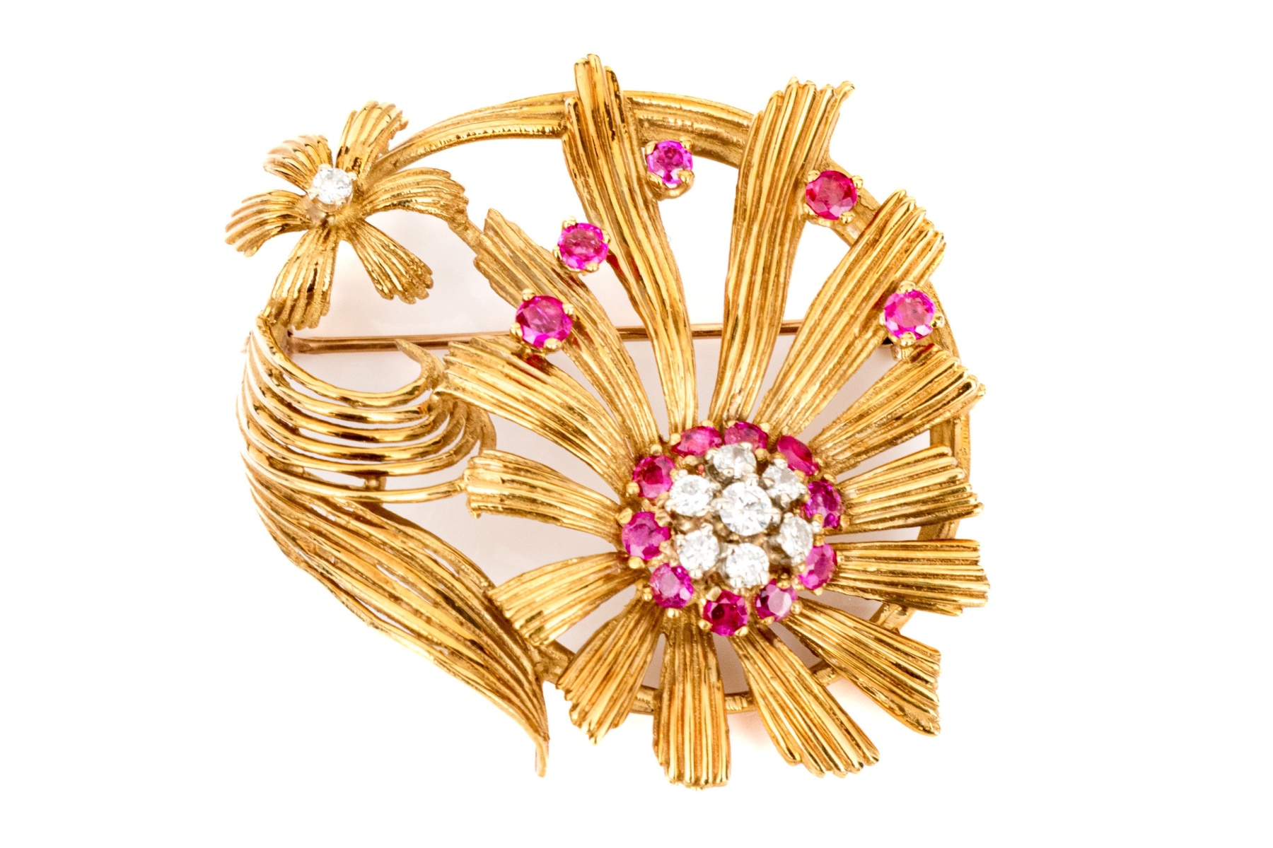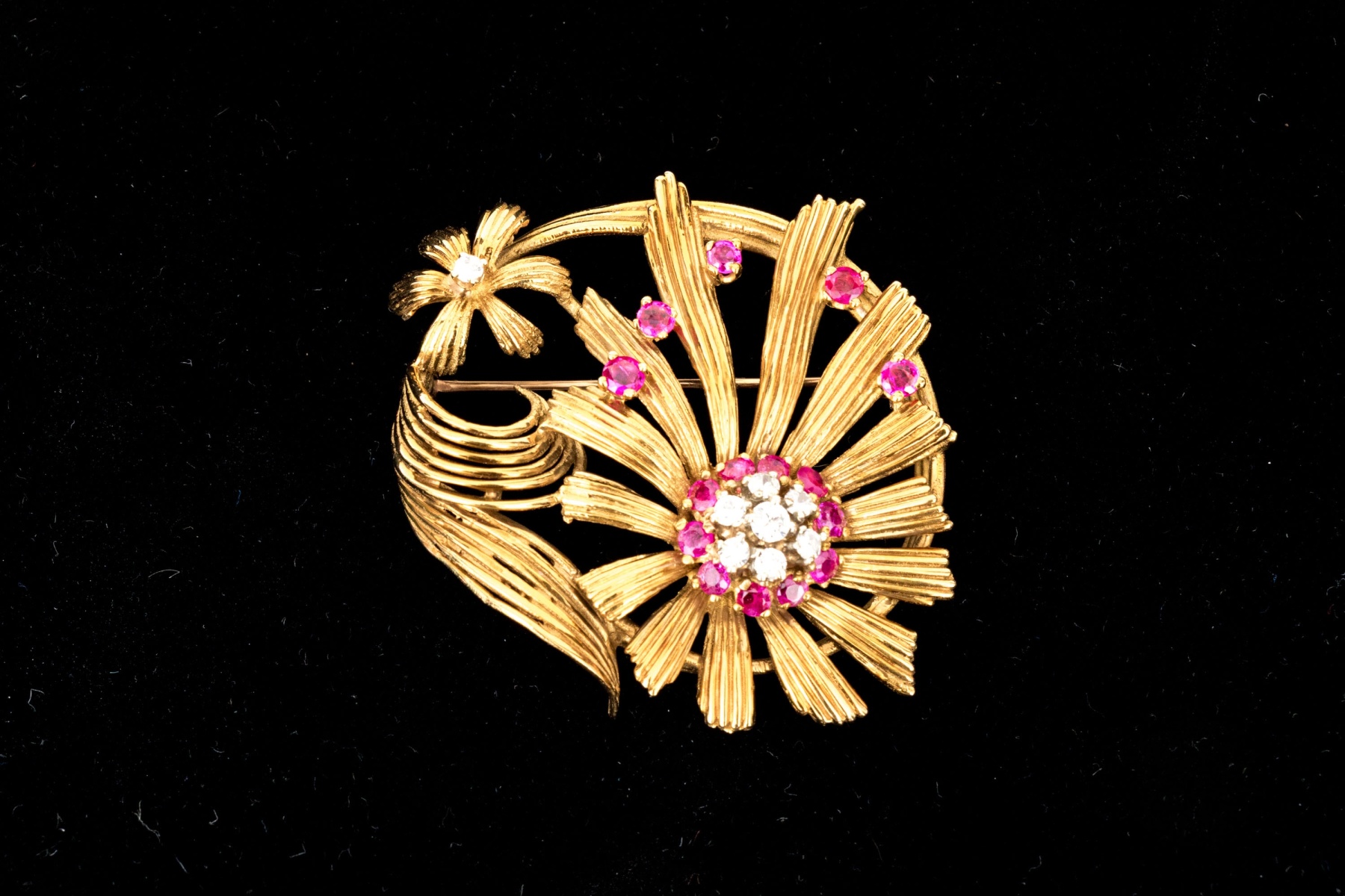 Karbra yellow gold magnificent vintage ruby and diamond flower cluster brooch. This stunning vintage brooch, signed 1963, features a daisy style flower with a center cluster of round brilliant cut diamonds, app. 0.28 TCW, surrounded by a halo of round faceted rubies, app. 0.48 TCW, all prong set.
