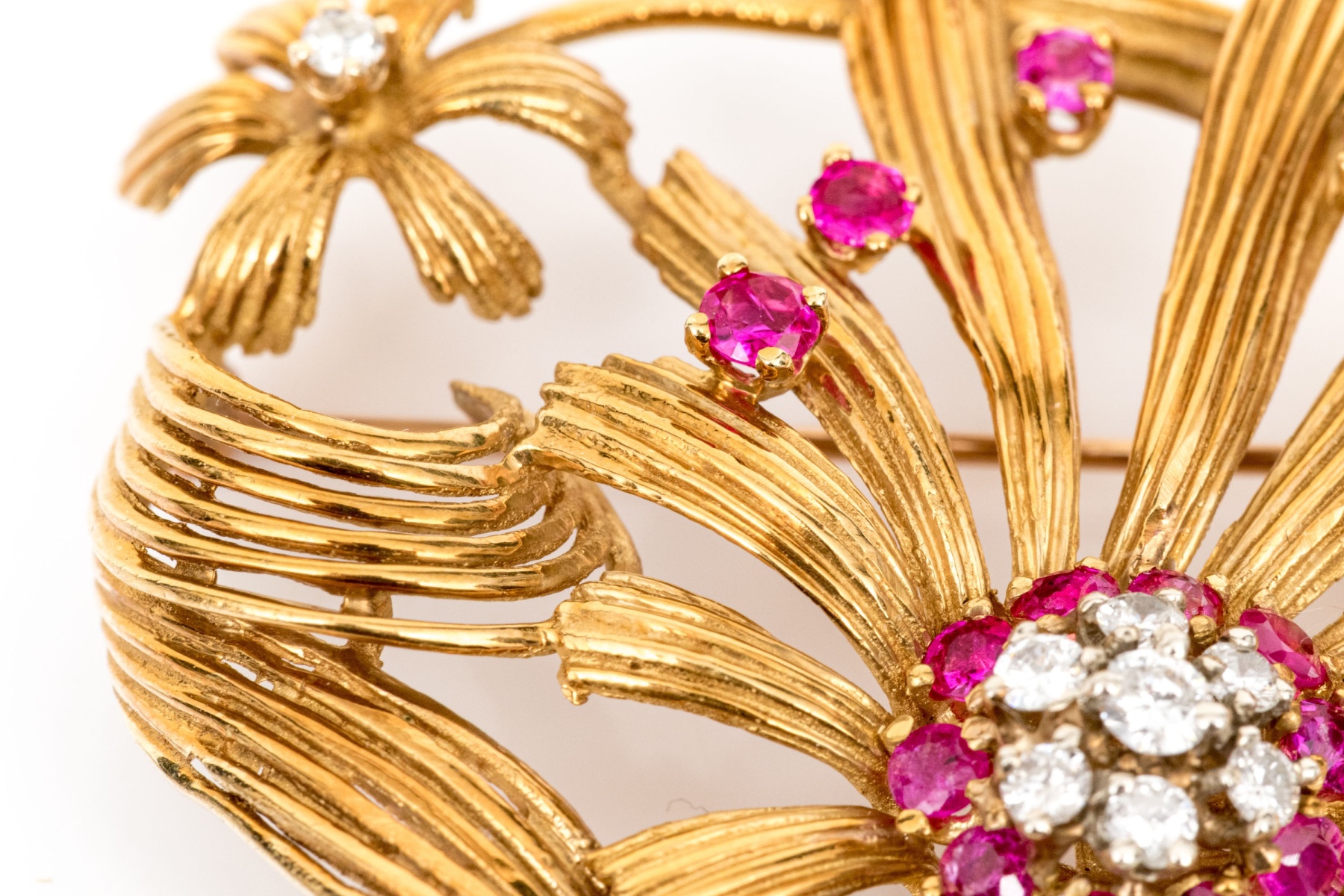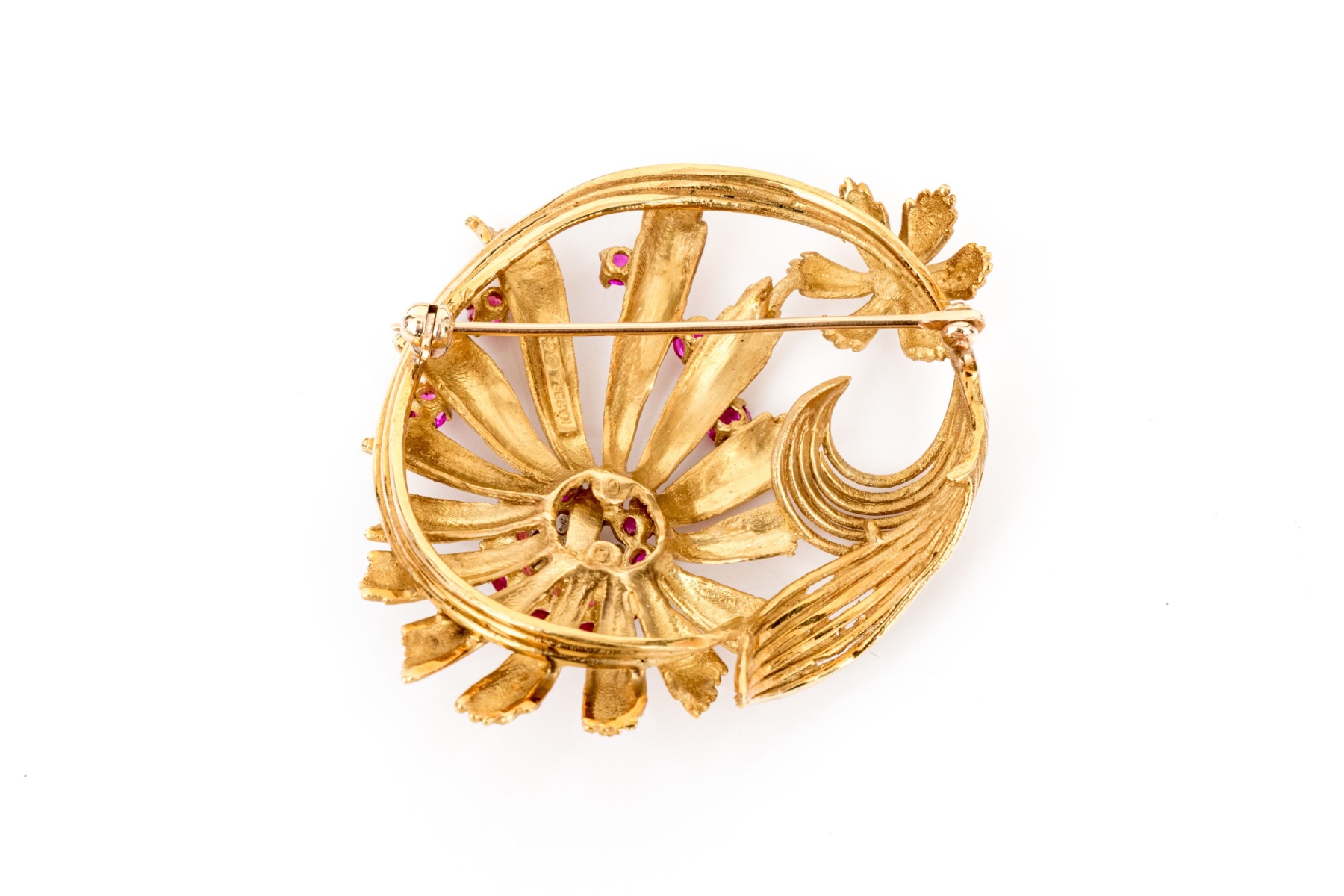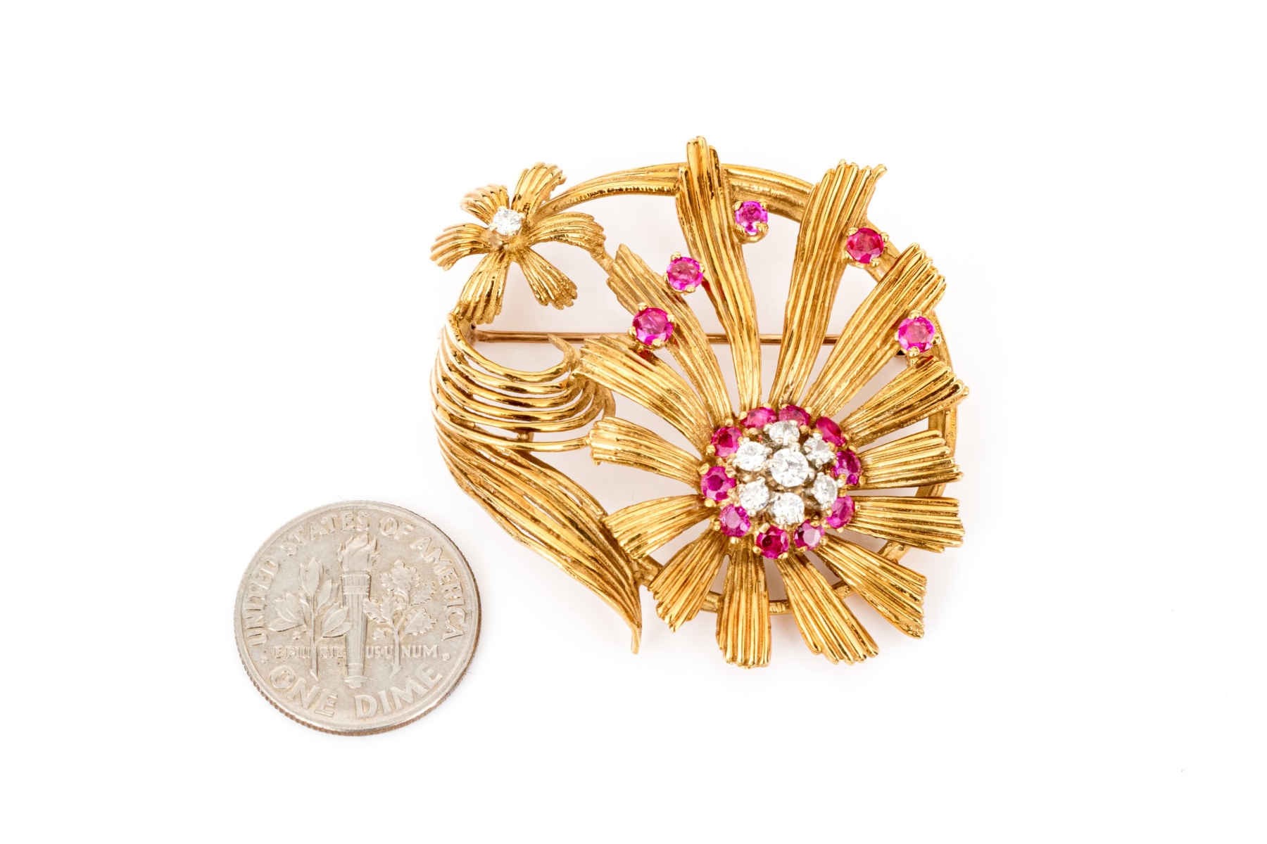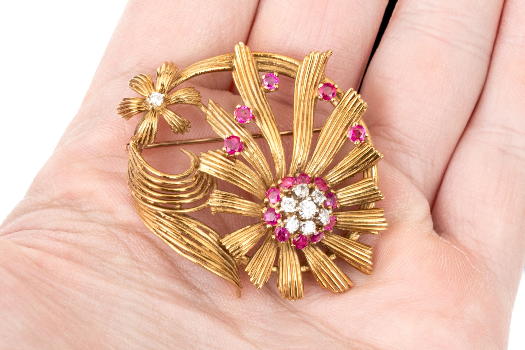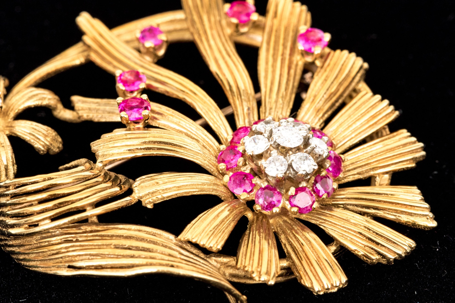 Karbra yellow gold magnificent vintage ruby and diamond flower cluster brooch. This stunning vintage brooch, signed 1963, features a daisy style flower with a center cluster of round brilliant cut diamonds, app. 0.28 TCW, surrounded by a halo of round faceted rubies, app. 0.48 TCW, all prong set.