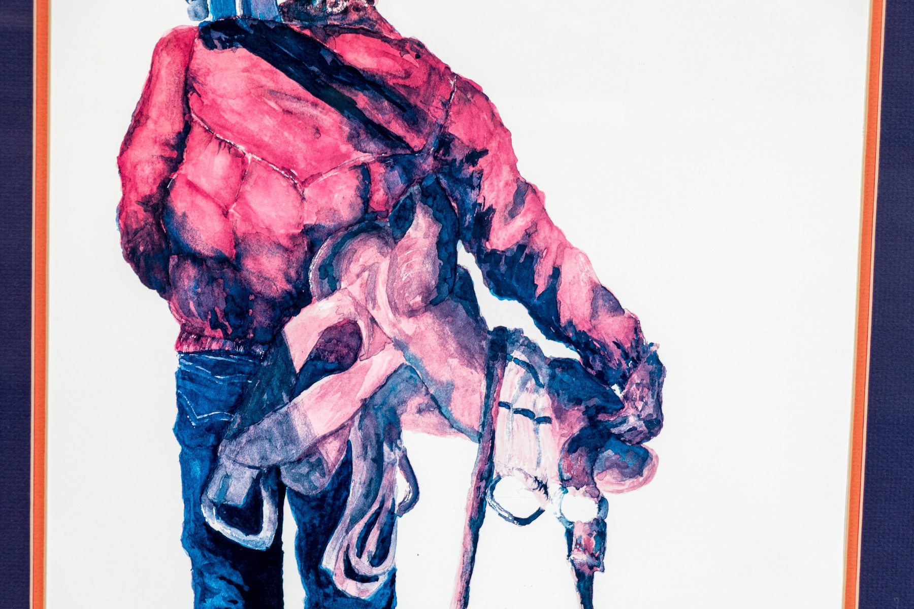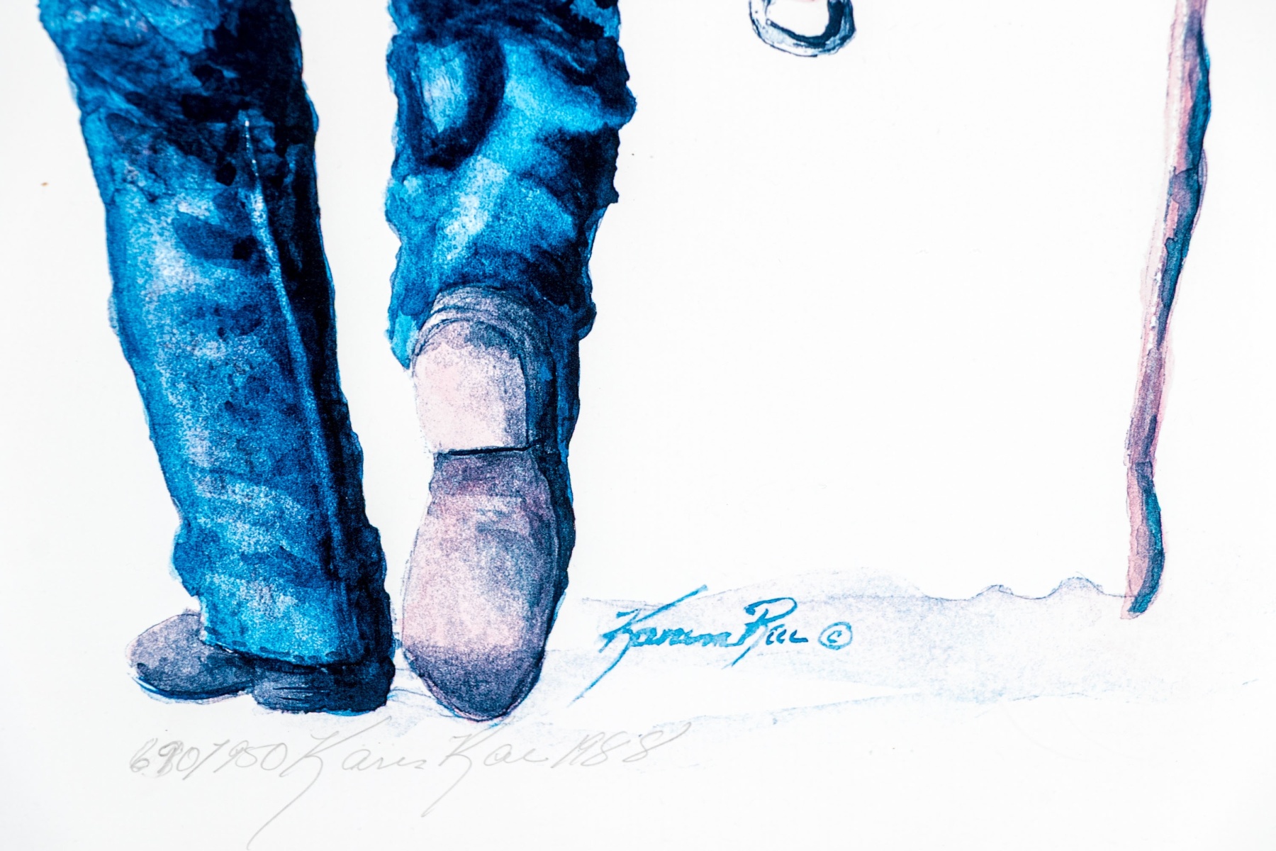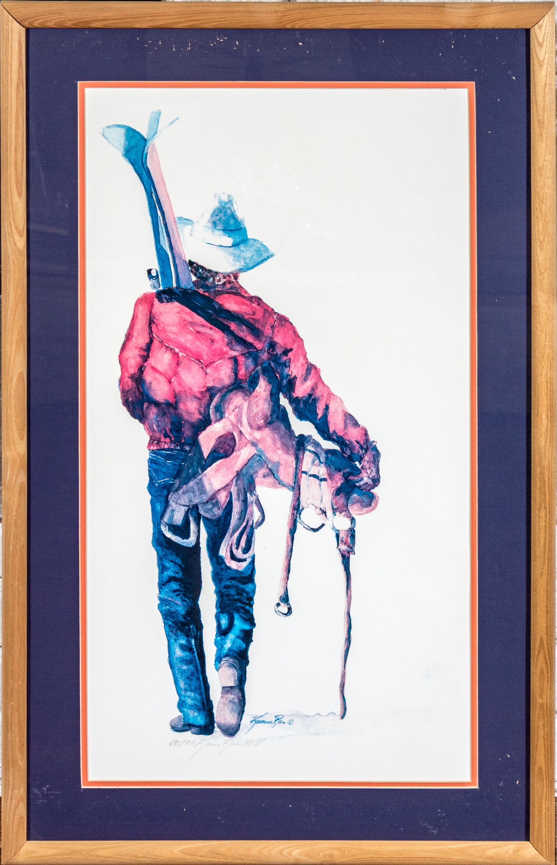 A wonderful Karen Rae "Skiing Cowboy" print depicting a cowboy in a white hat, red shirt, denim jeans, and boots carrying a saddle beneath one arm and a pair of skiiboards in the other walking away from the viewer against a white ground. Pencil signed and numbered 690/950 out of plate and signed in plate.