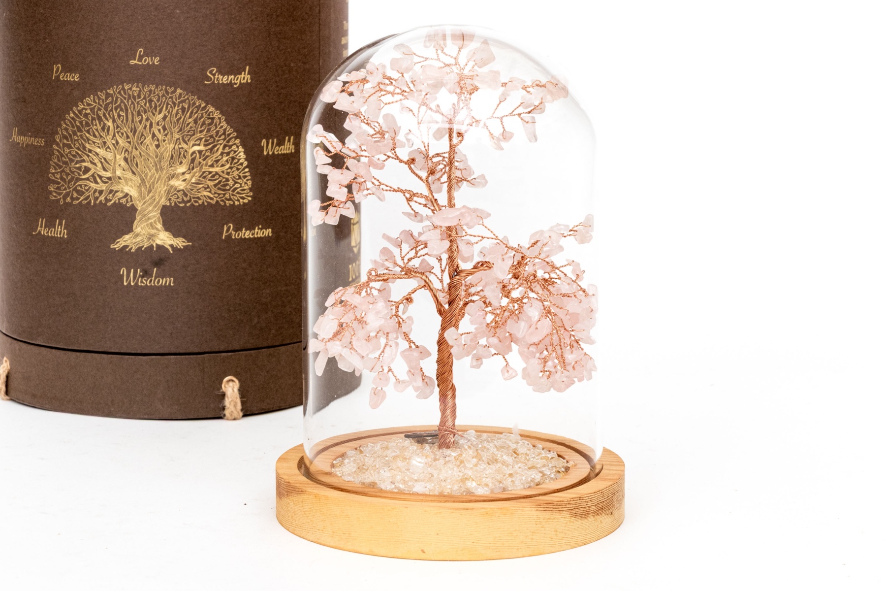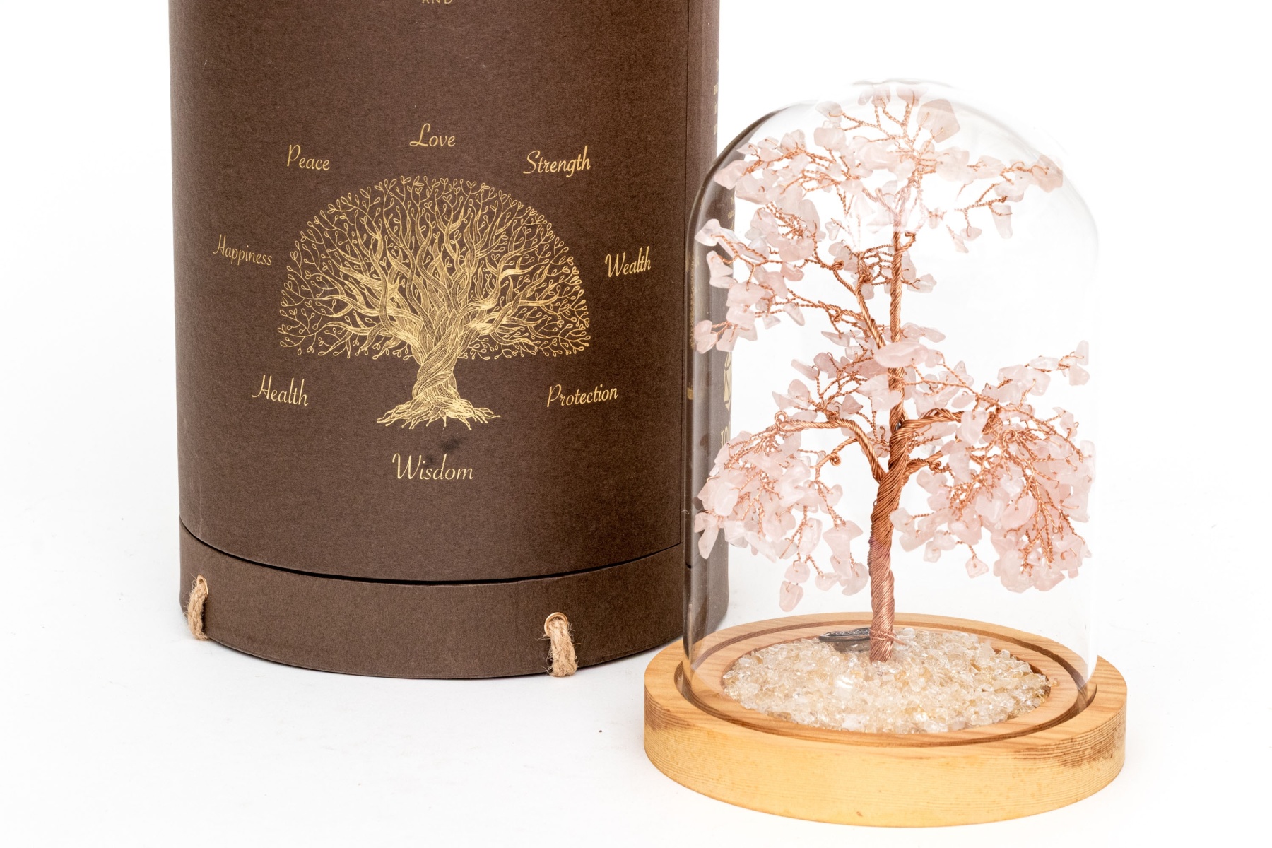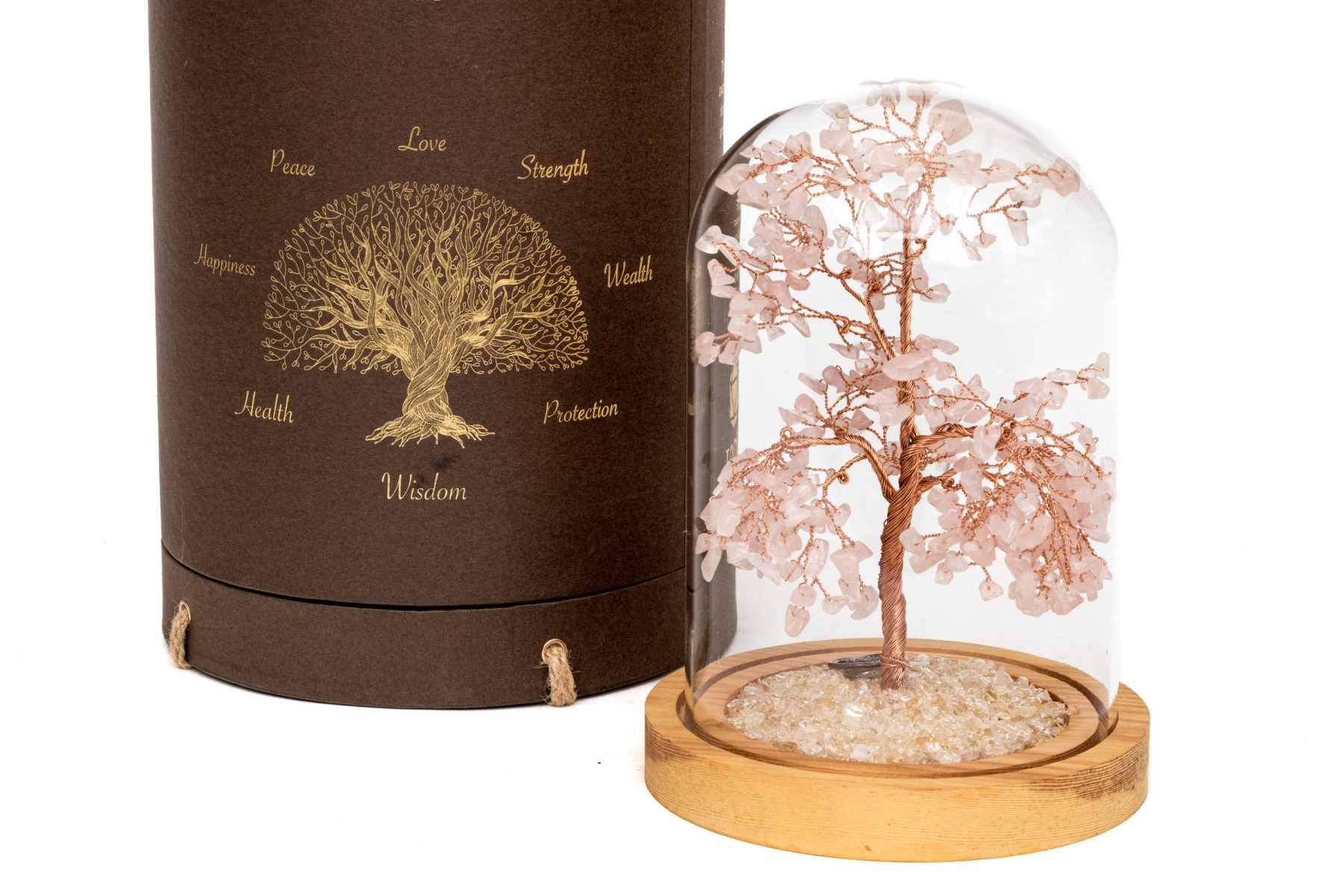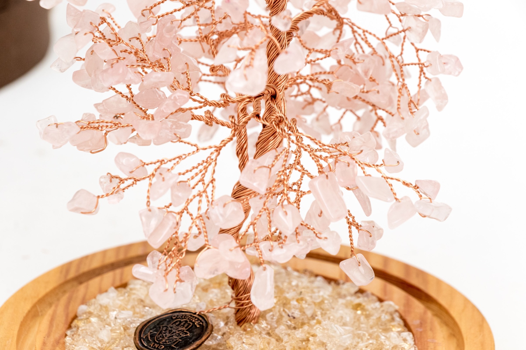 A delightful and highly decorative Karma and Luck figure of a Tree of Life with rose quartz foliage on a twisted copper wire trunk leading down to a pale orange pebbled ground mounted within a honeyed brown circular wood base with a glass cloche. Includes the original brown case with a rope handle.