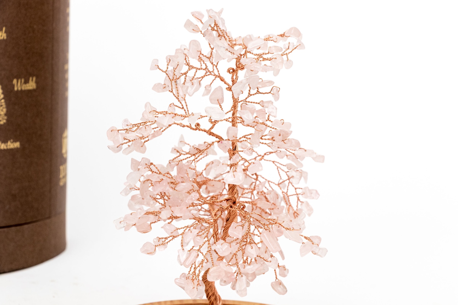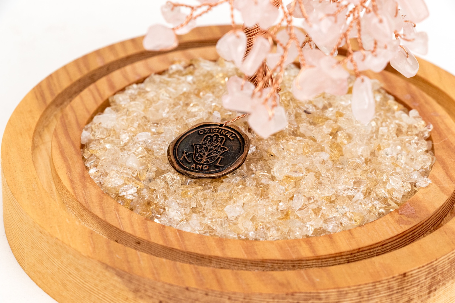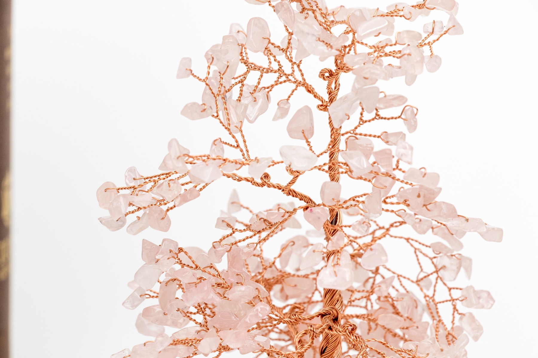 A delightful and highly decorative Karma and Luck figure of a Tree of Life with rose quartz foliage on a twisted copper wire trunk leading down to a pale orange pebbled ground mounted within a honeyed brown circular wood base with a glass cloche. Includes the original brown case with a rope handle.