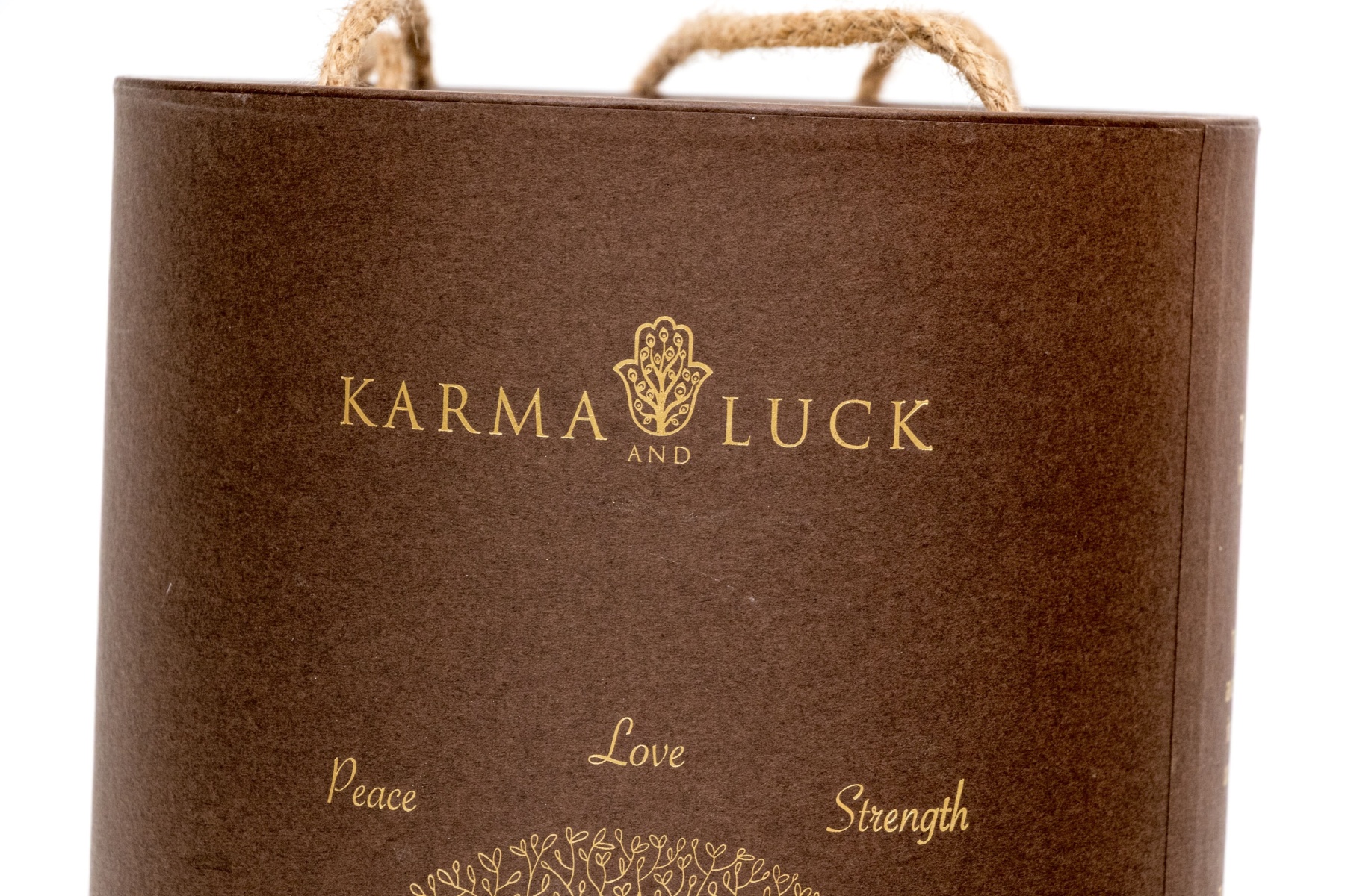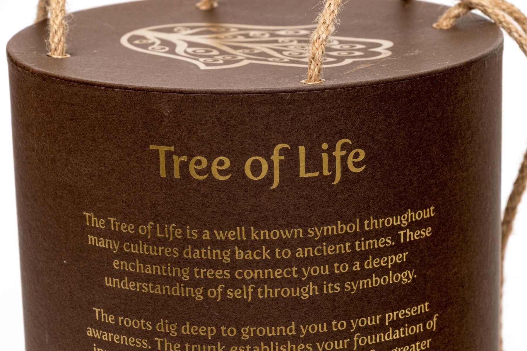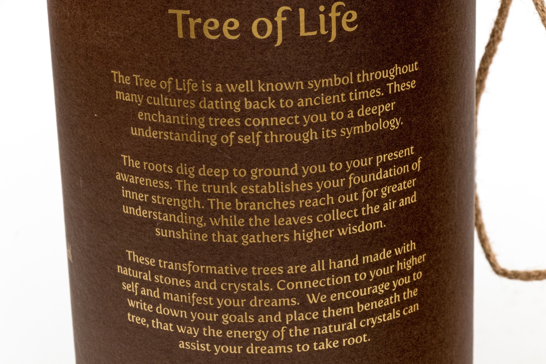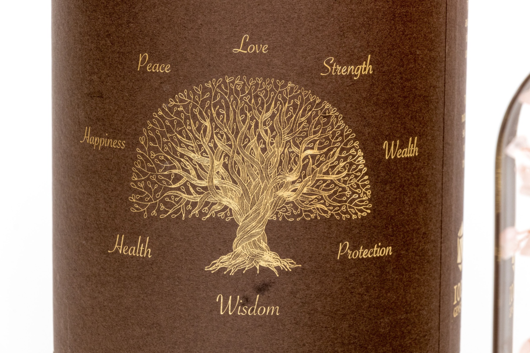A delightful and highly decorative Karma and Luck figure of a Tree of Life with rose quartz foliage on a twisted copper wire trunk leading down to a pale orange pebbled ground mounted within a honeyed brown circular wood base with a glass cloche. Includes the original brown case with a rope handle.