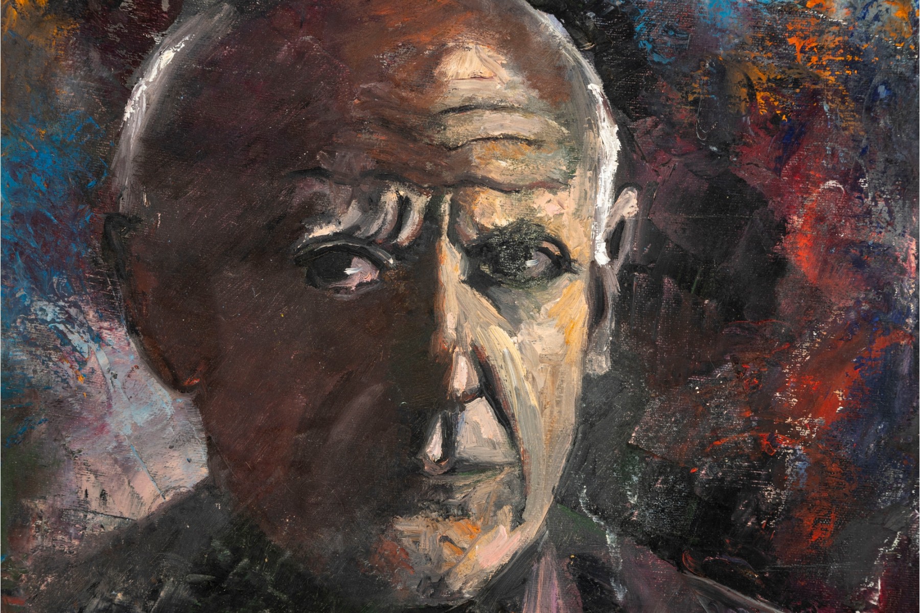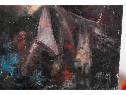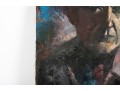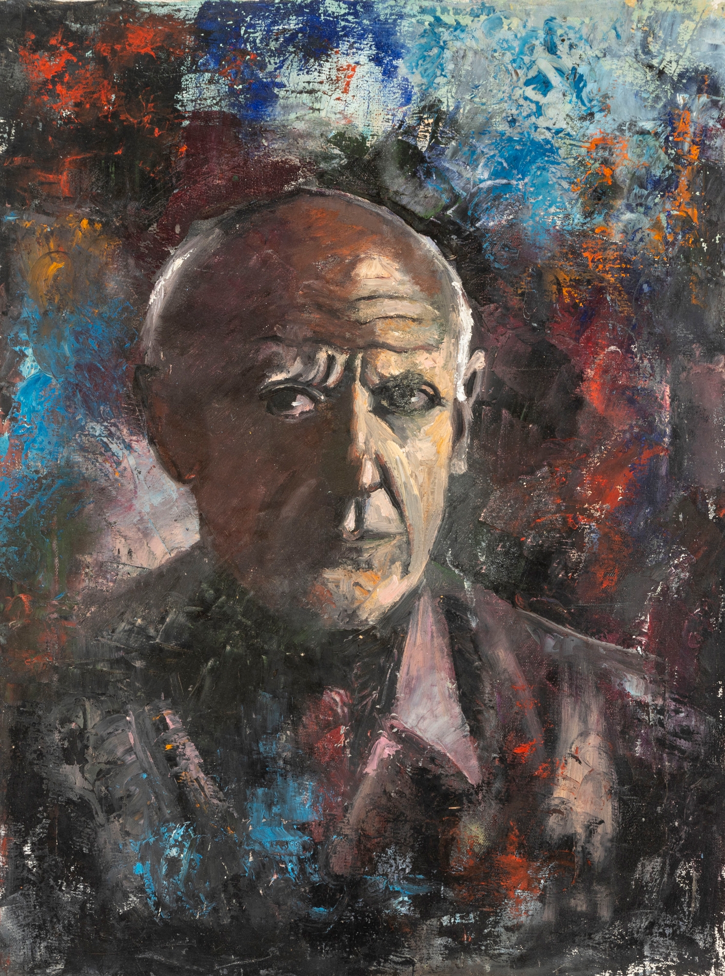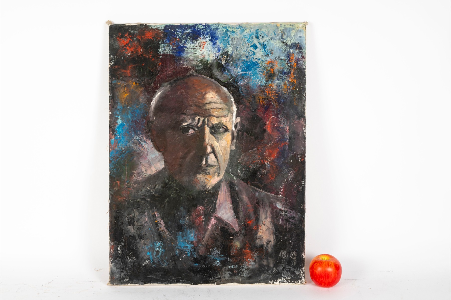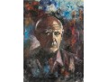 Kate Rancke Buie (American [NC], 1926-2011) acrylic painting on canvas depicting a portrait of a man wearing a dark mauve collared coat and red tie standing against a colorfully dappled background in blue, red, and orange. Appears to be unsigned. The canvas is mounted to a stretcher, unframed.