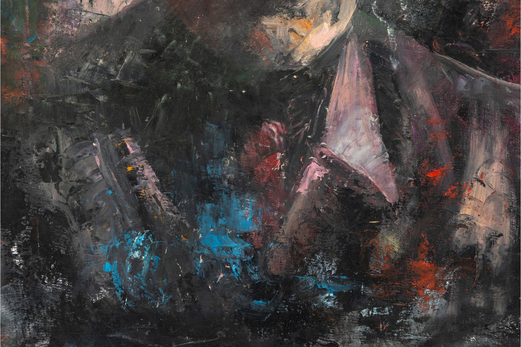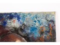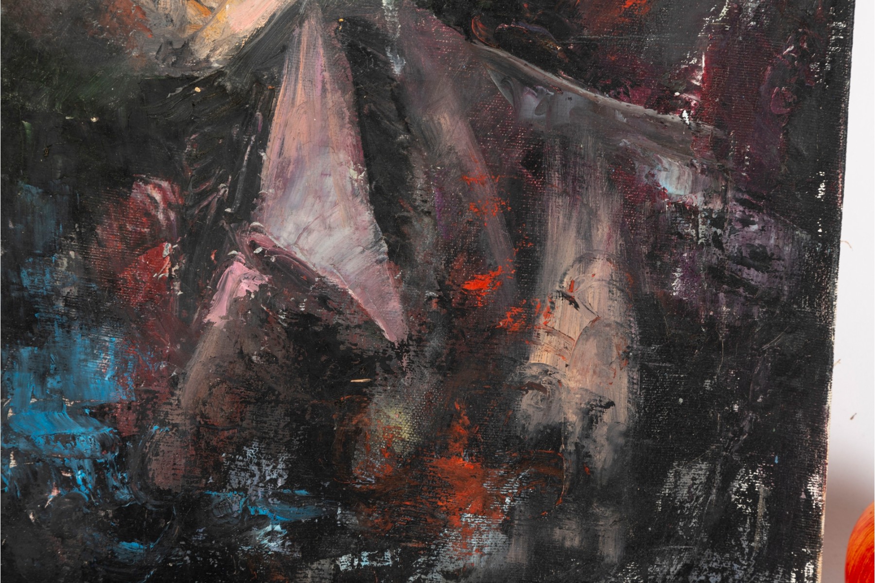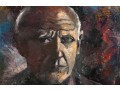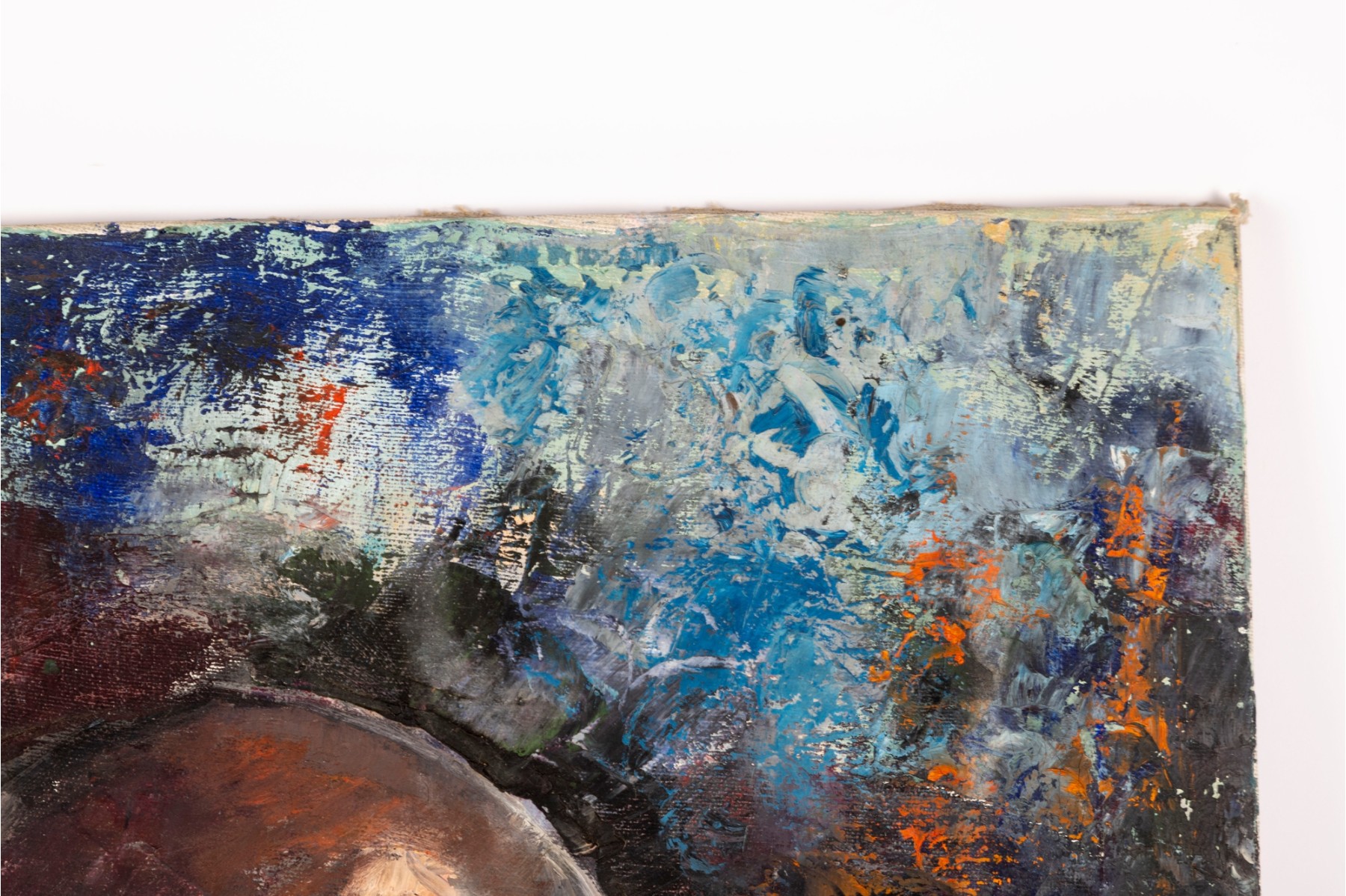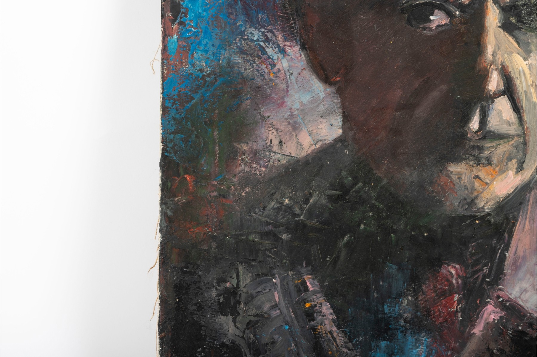 Kate Rancke Buie (American [NC], 1926-2011) acrylic painting on canvas depicting a portrait of a man wearing a dark mauve collared coat and red tie standing against a colorfully dappled background in blue, red, and orange. Appears to be unsigned. The canvas is mounted to a stretcher, unframed.