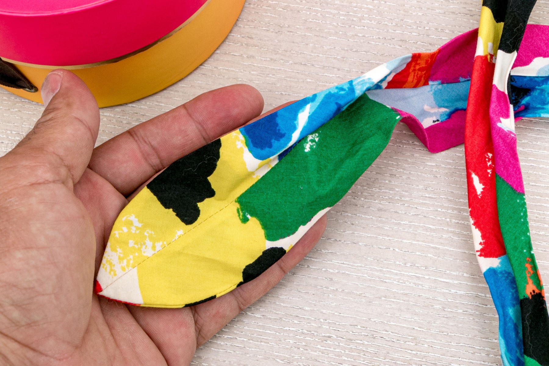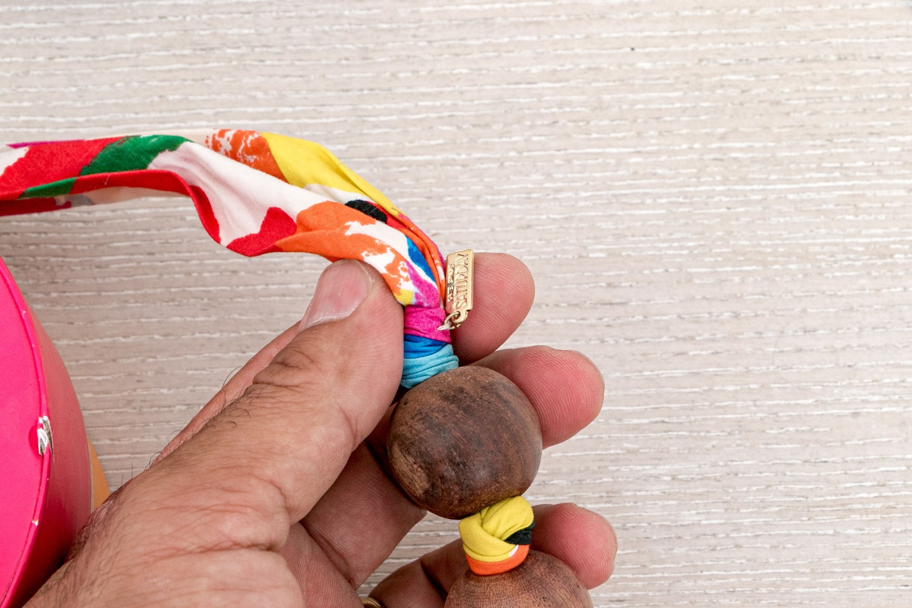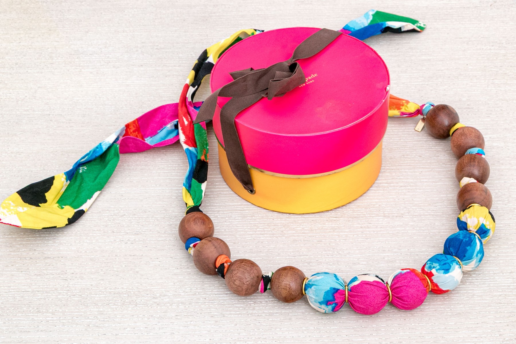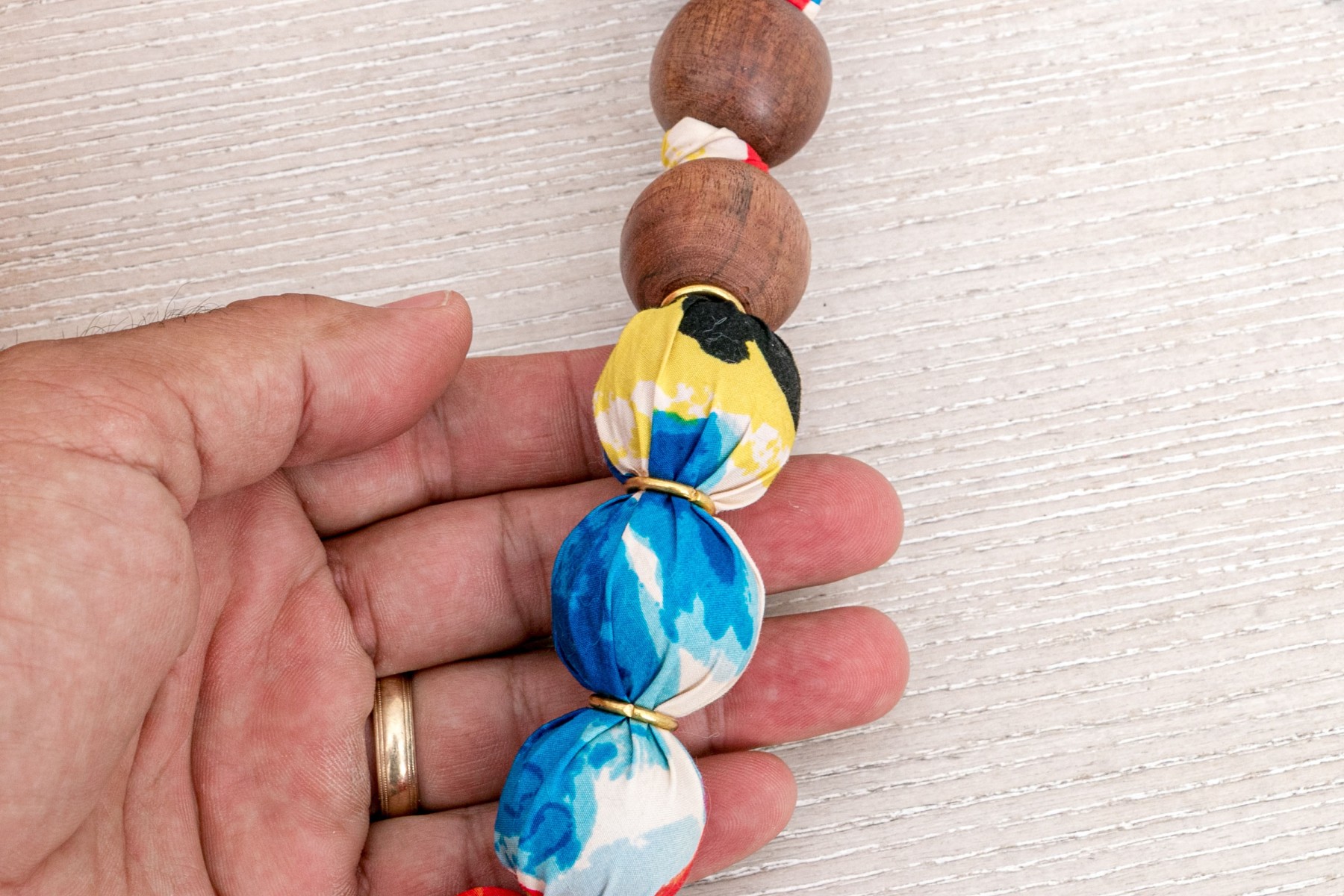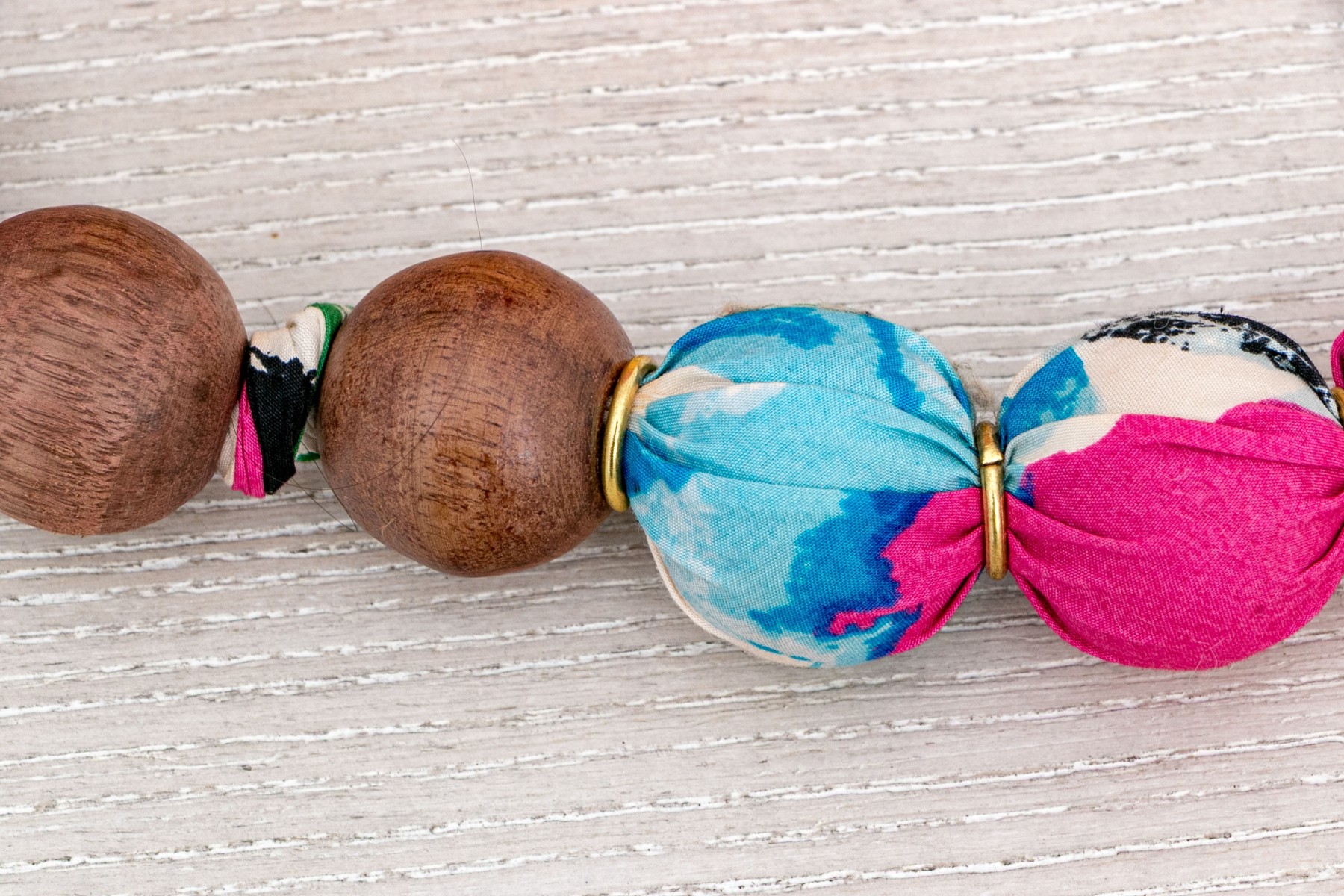 Colorful texture wrapped and wooden beads with a tie closure. Length is overall without tying - adjustable. With presentation box.