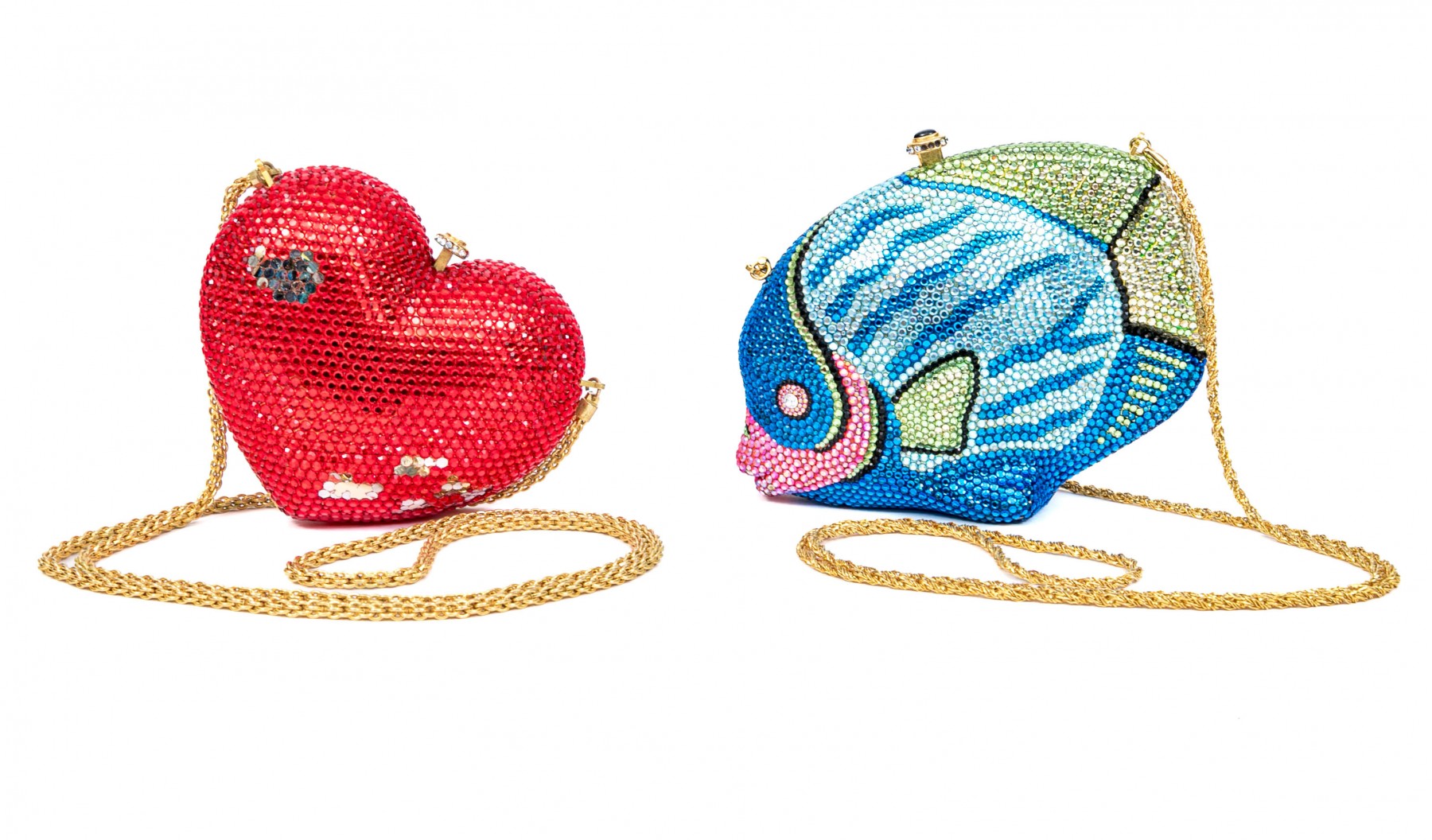 Two Kathrine Baumann purses. The first is a red heart and the second a multi-colored fish. Both have push to open tops with shoulder chains.