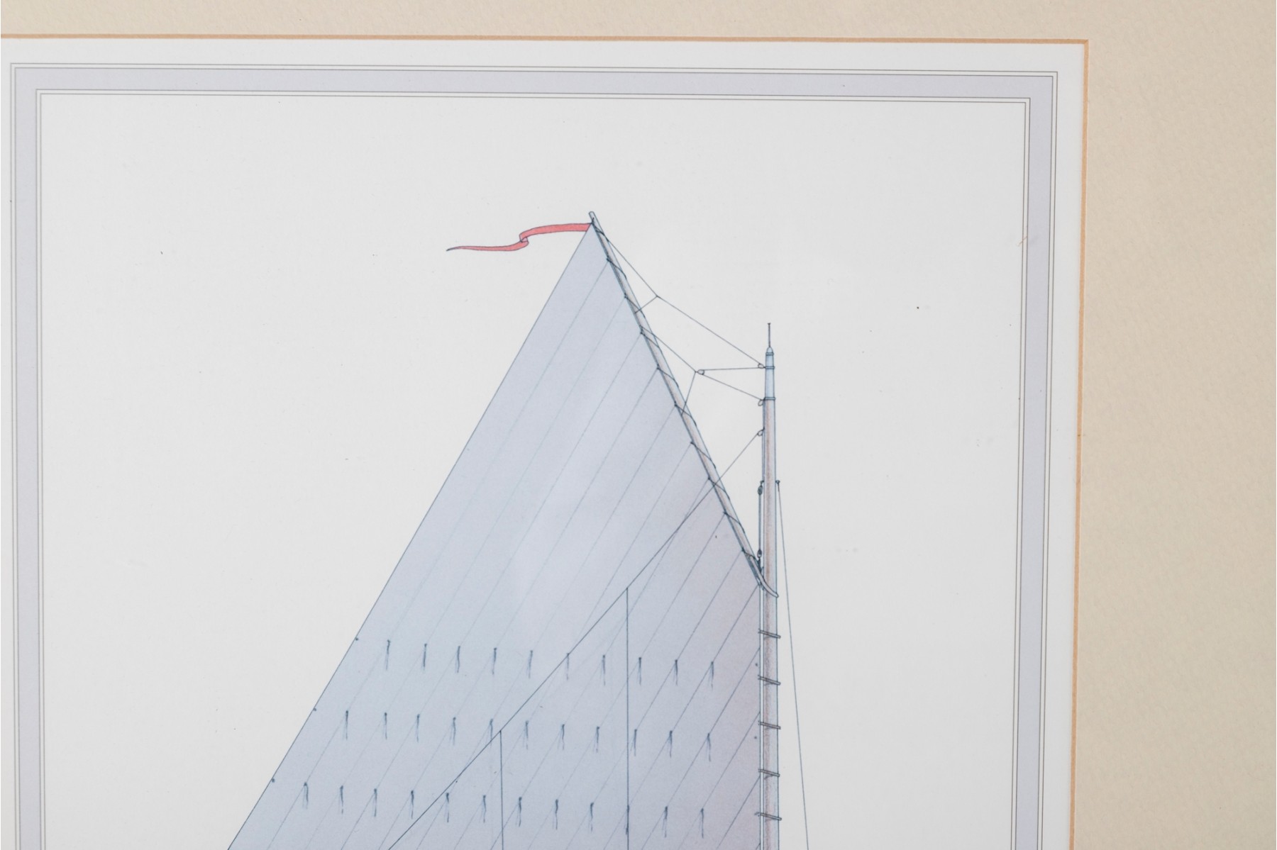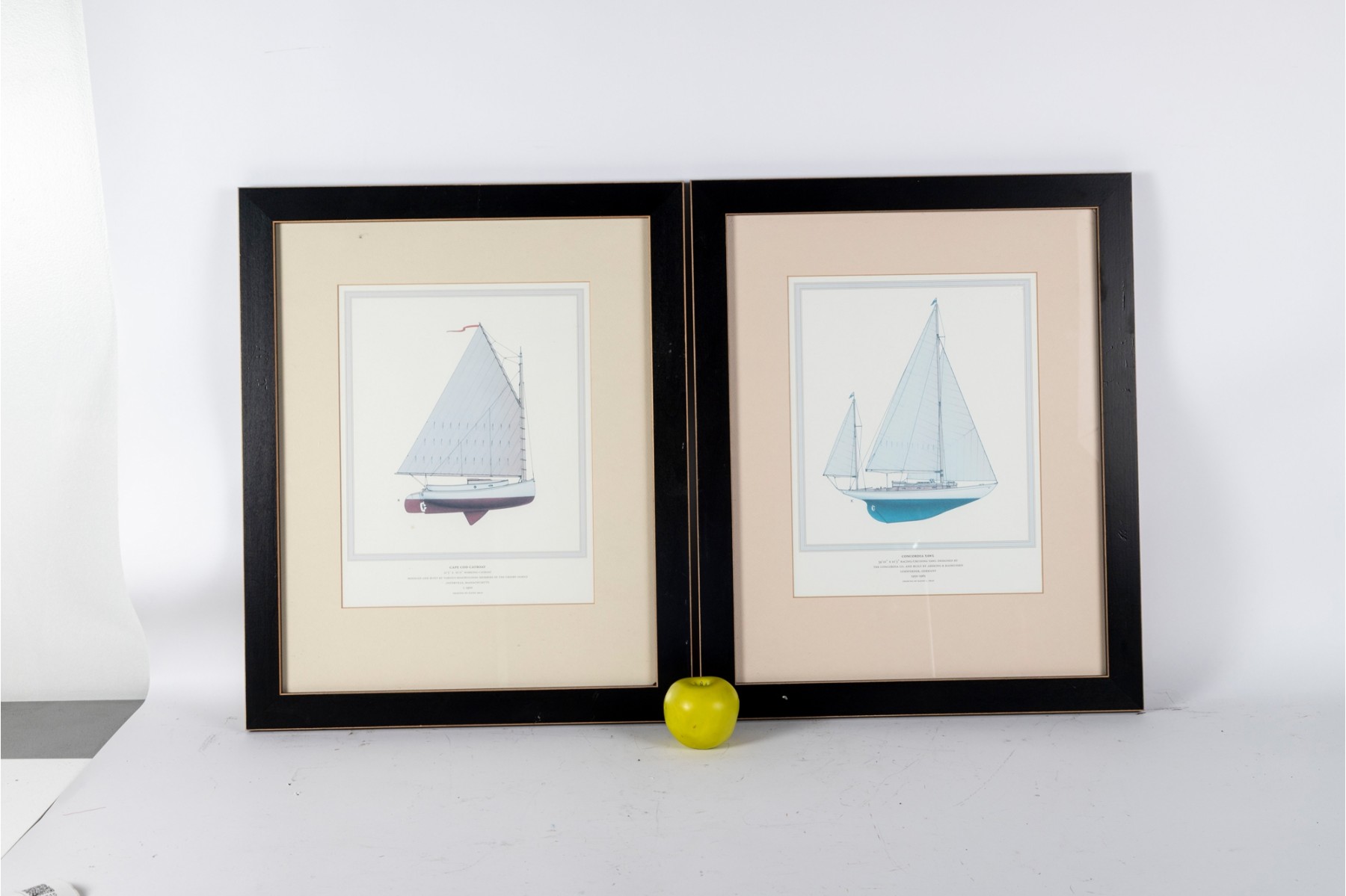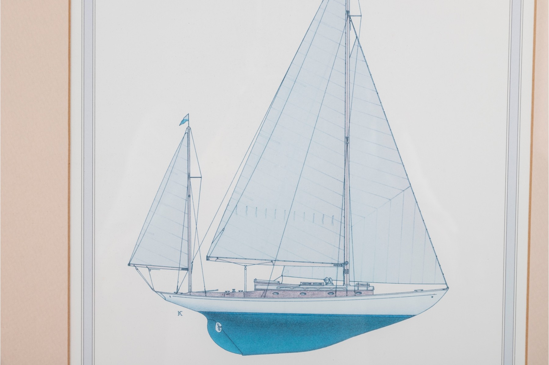 Kathy L. Bray "Cape Cod Catboat" and "Concordia Yawl" prints depicting purple and blue boats in profile with impressive sails against white backgrounds.