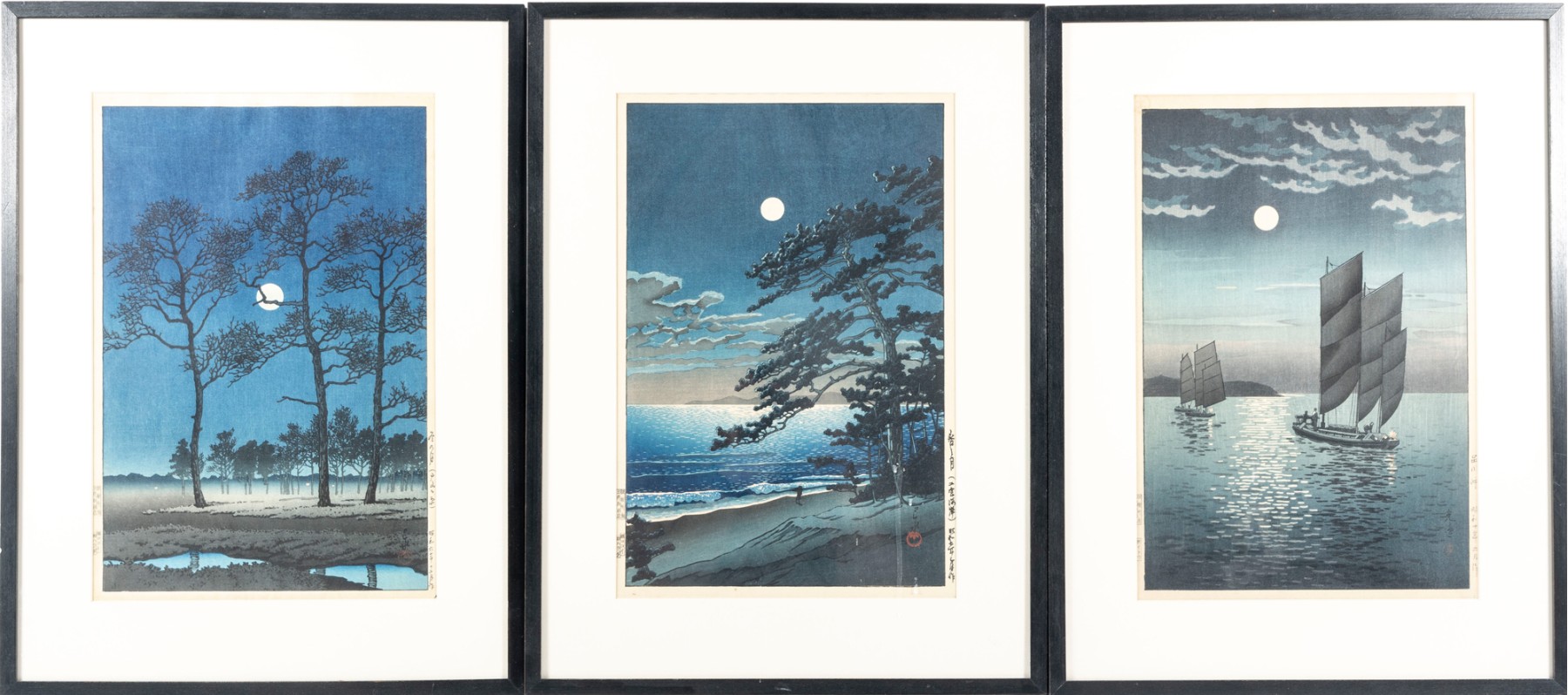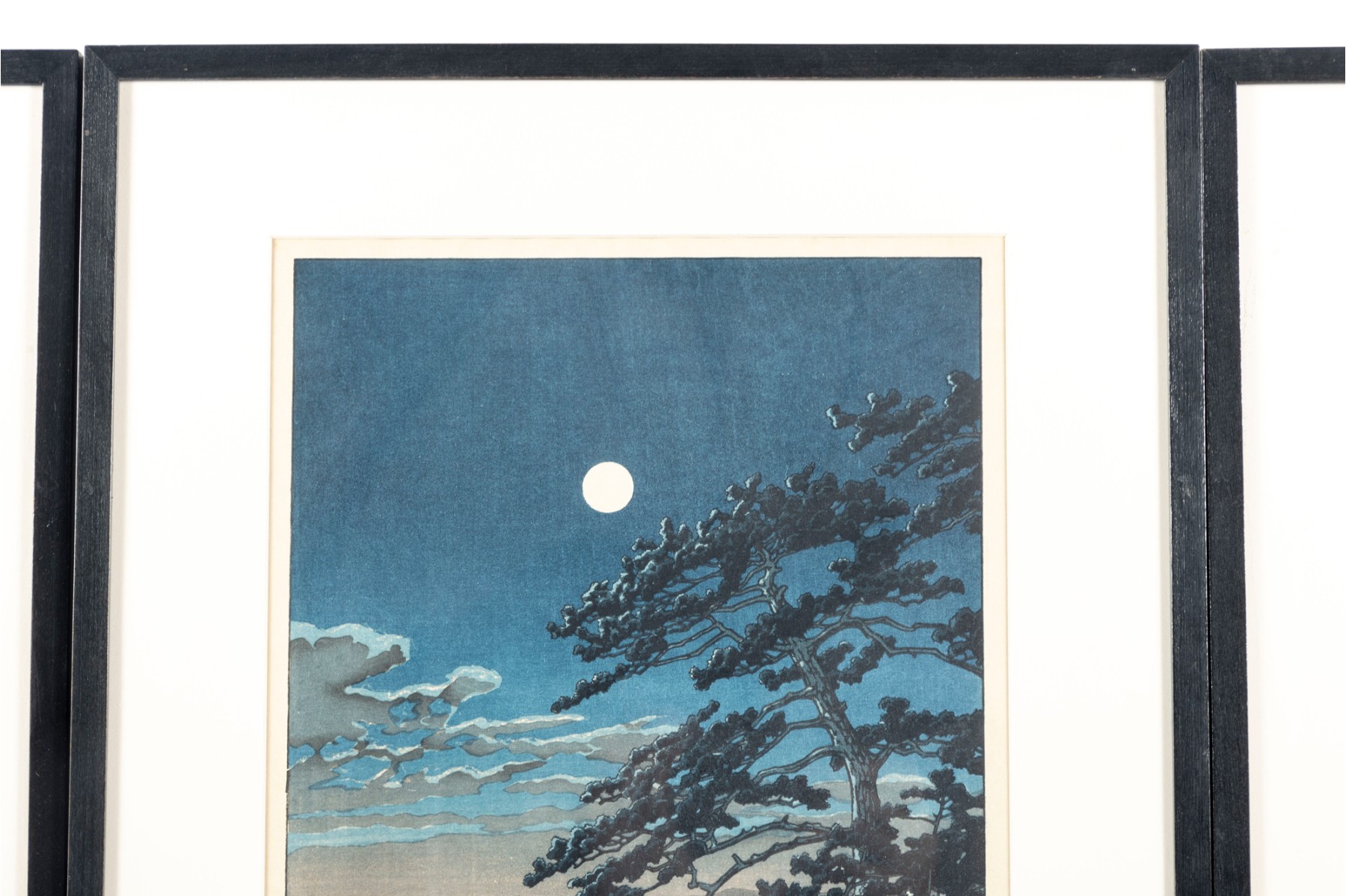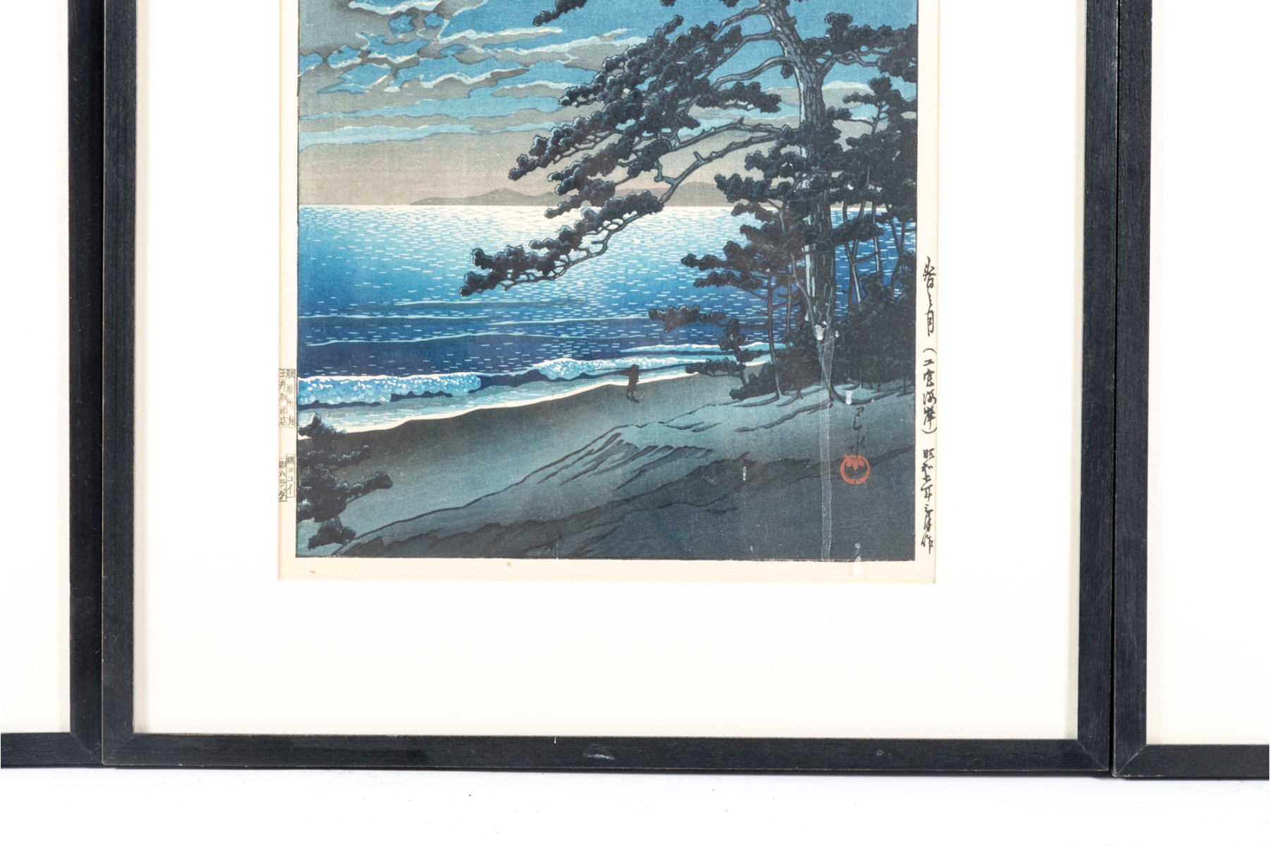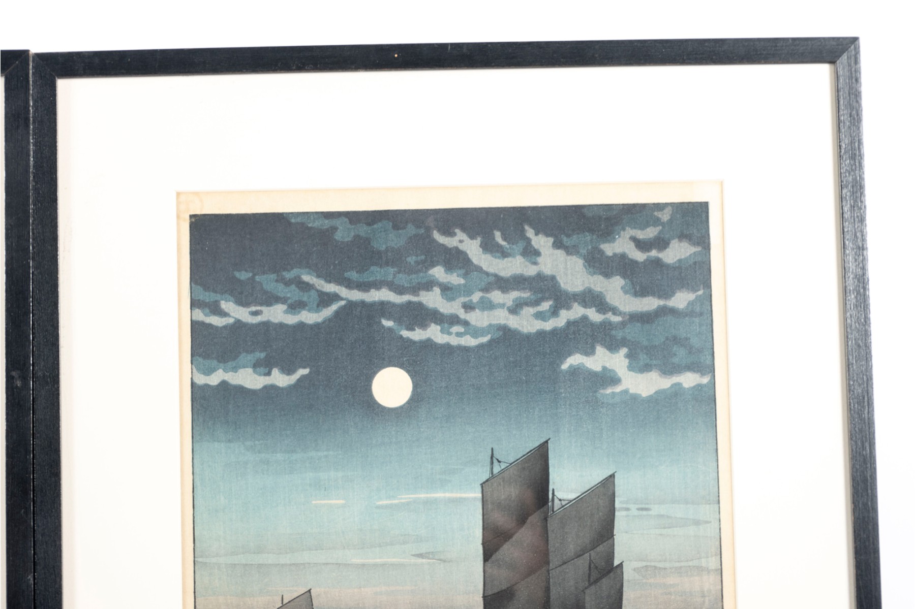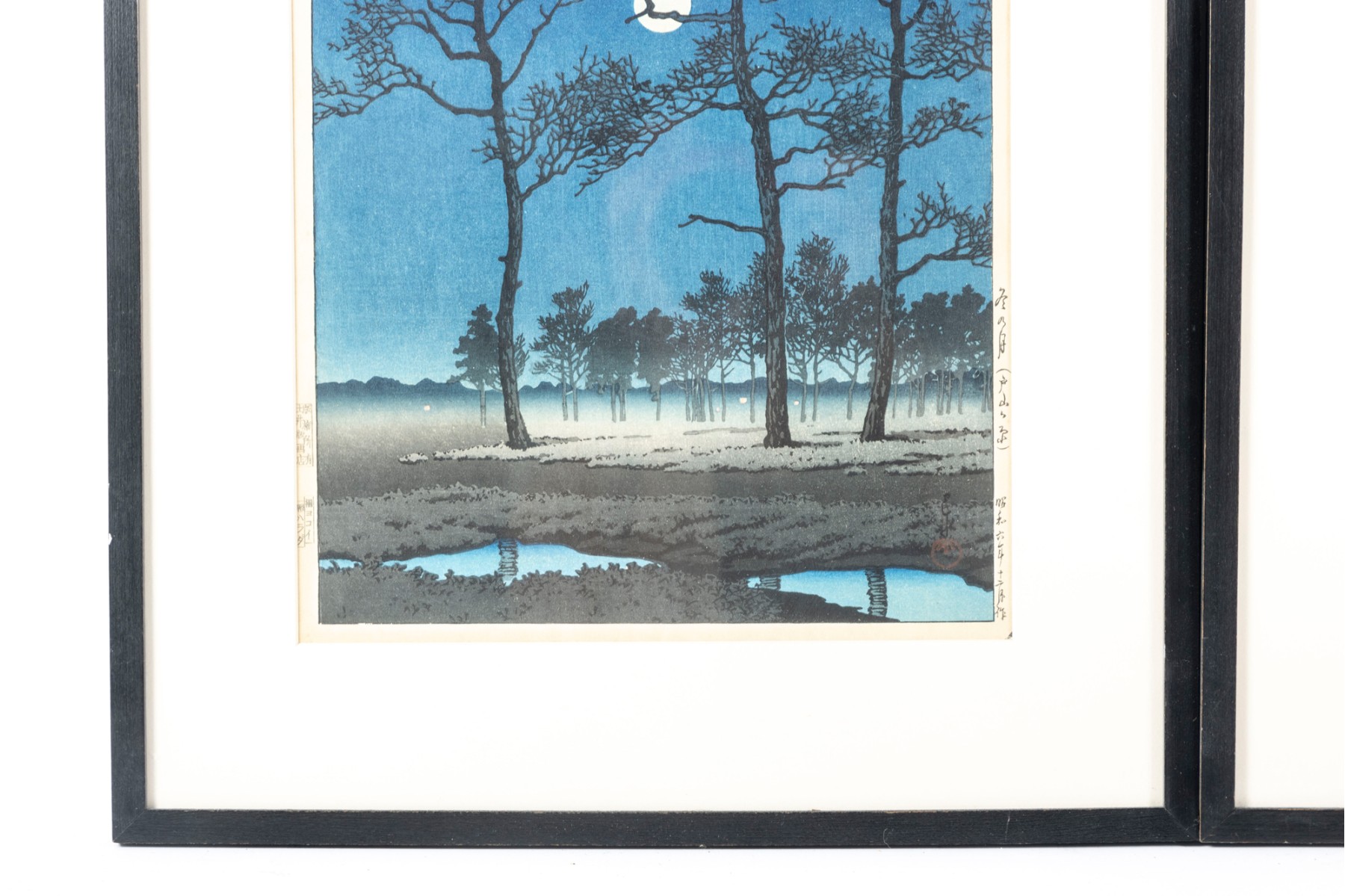 A trio of framed woodblock prints after major 20th century Japanese landscape artist Kawase Hasui, whom of which began woodblock printing in 1919. All examples shown are displayed in thin black wood frames accented by a white mat border, faced with glass.