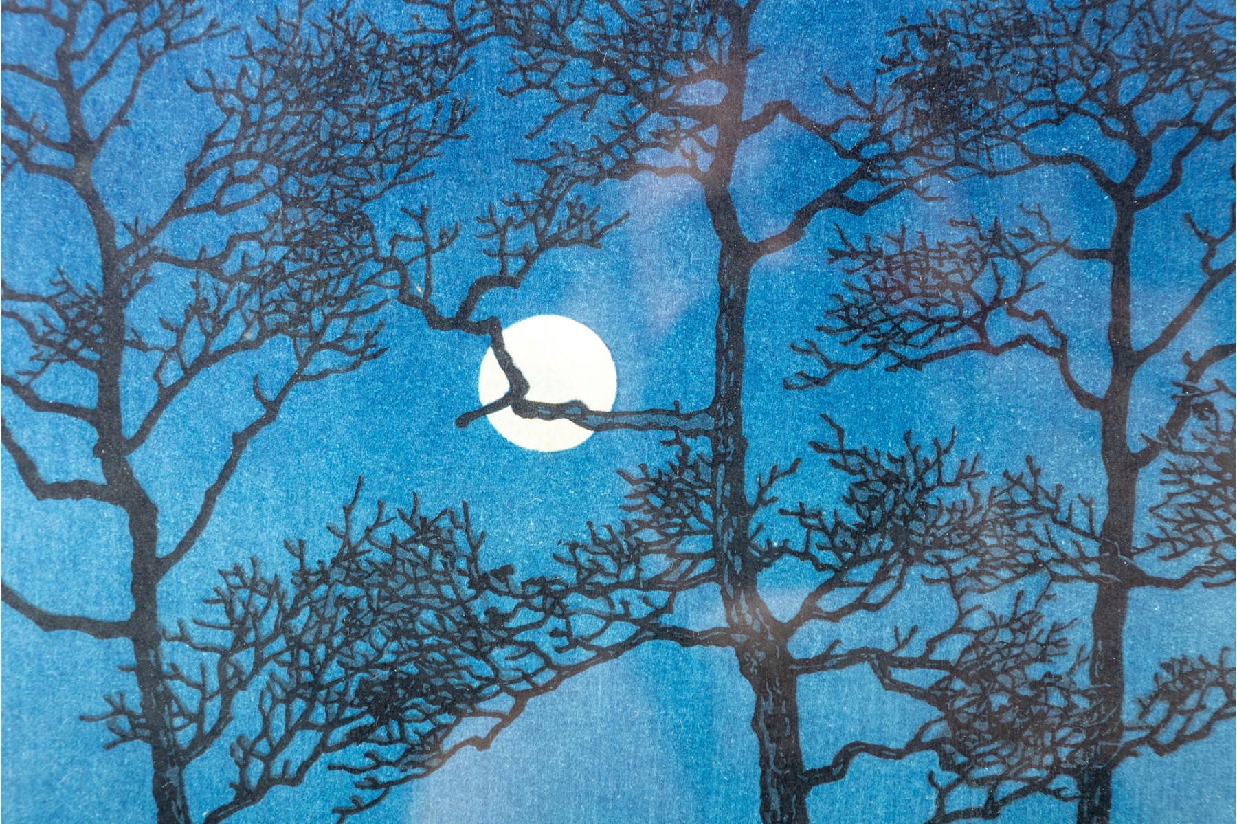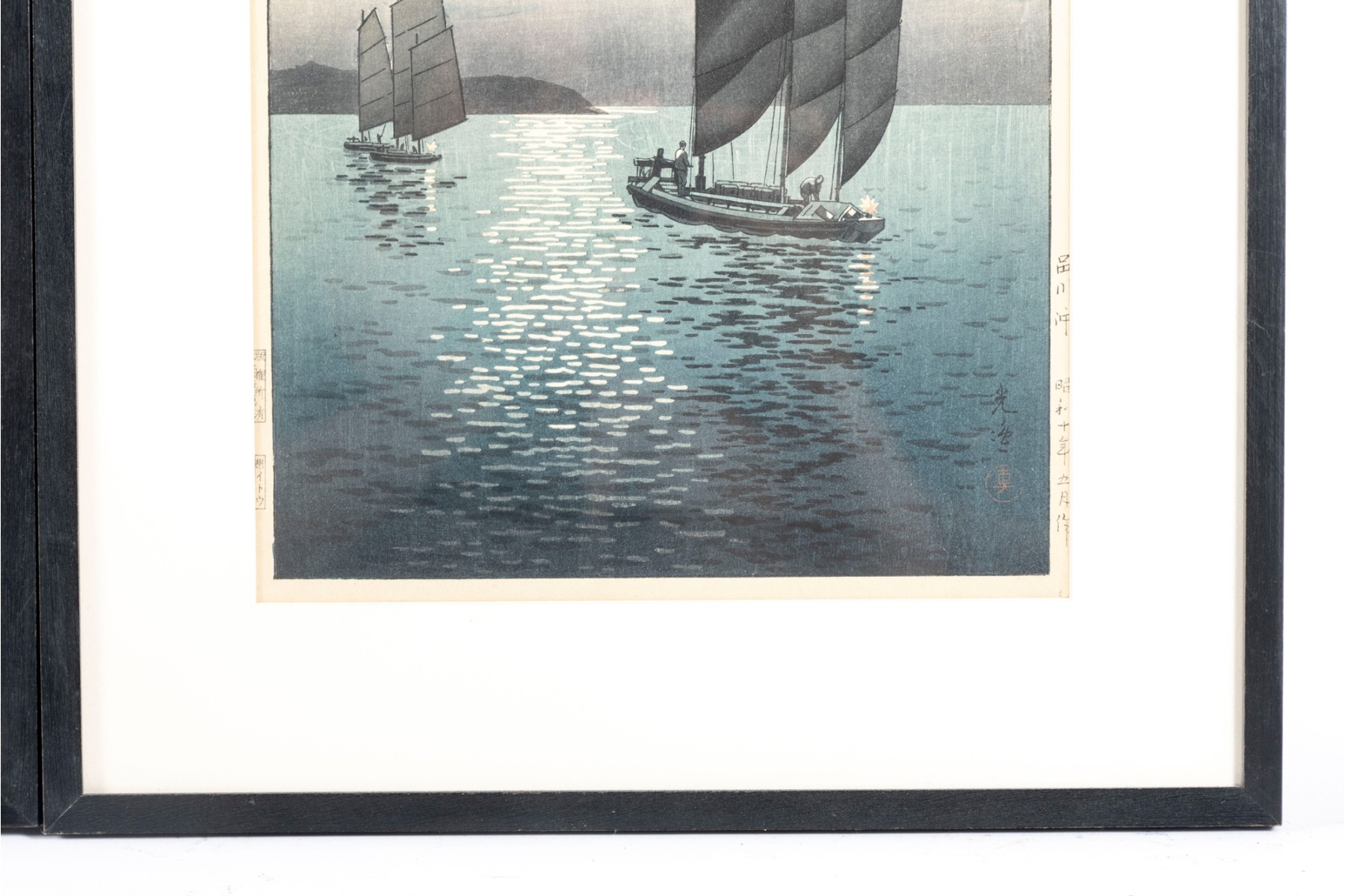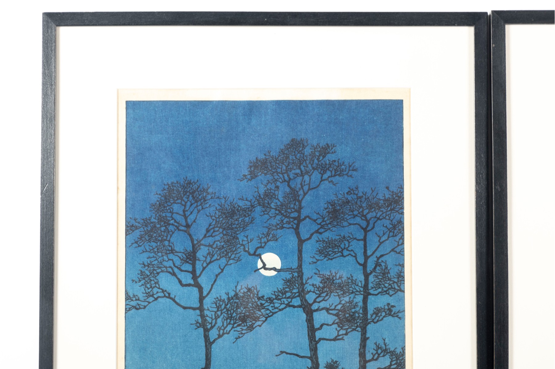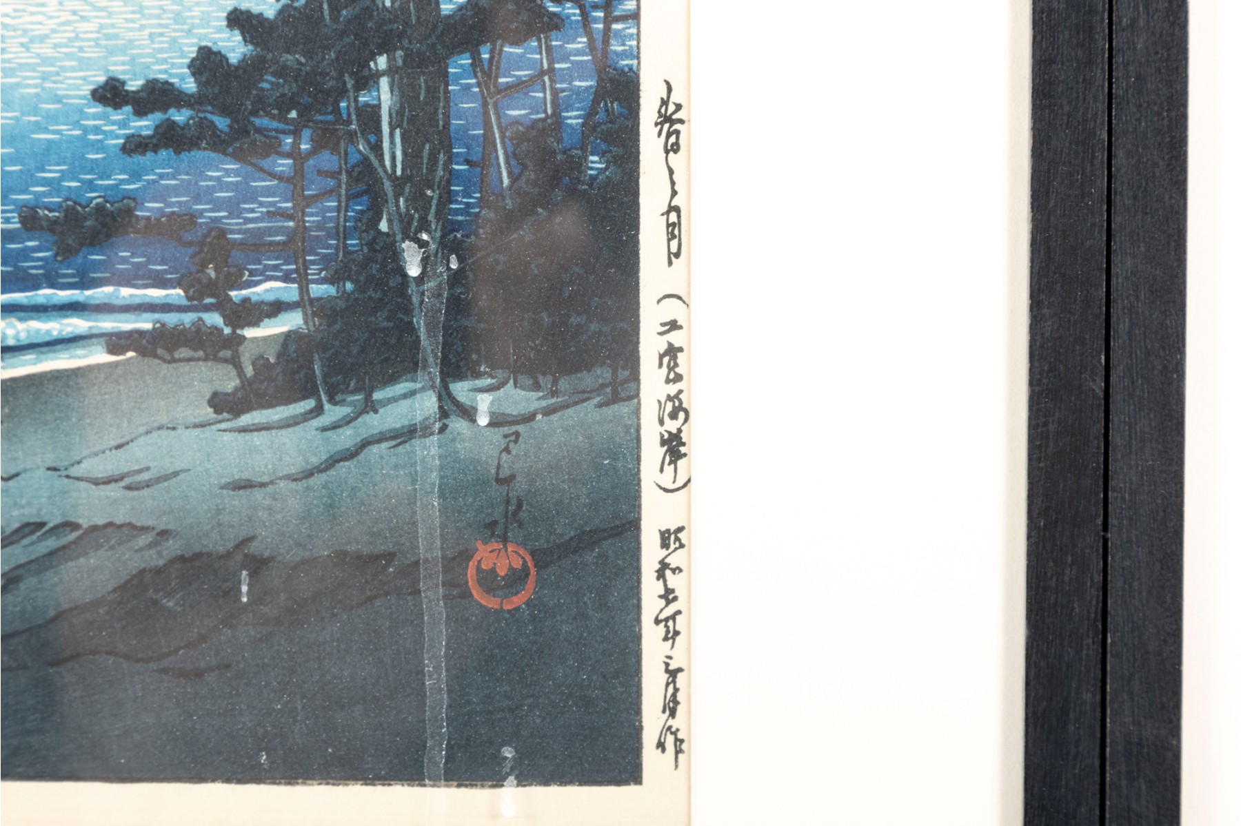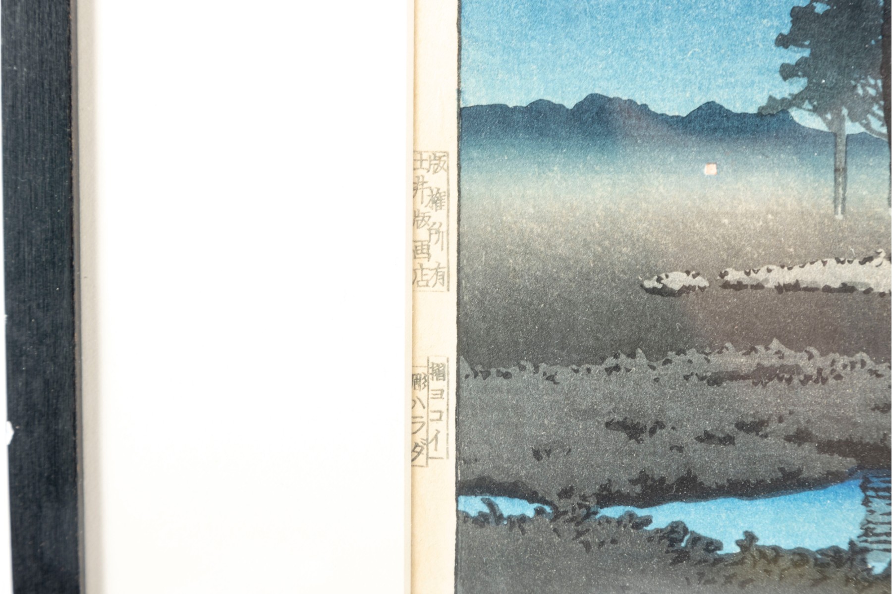 A trio of framed woodblock prints after major 20th century Japanese landscape artist Kawase Hasui, whom of which began woodblock printing in 1919. All examples shown are displayed in thin black wood frames accented by a white mat border, faced with glass.