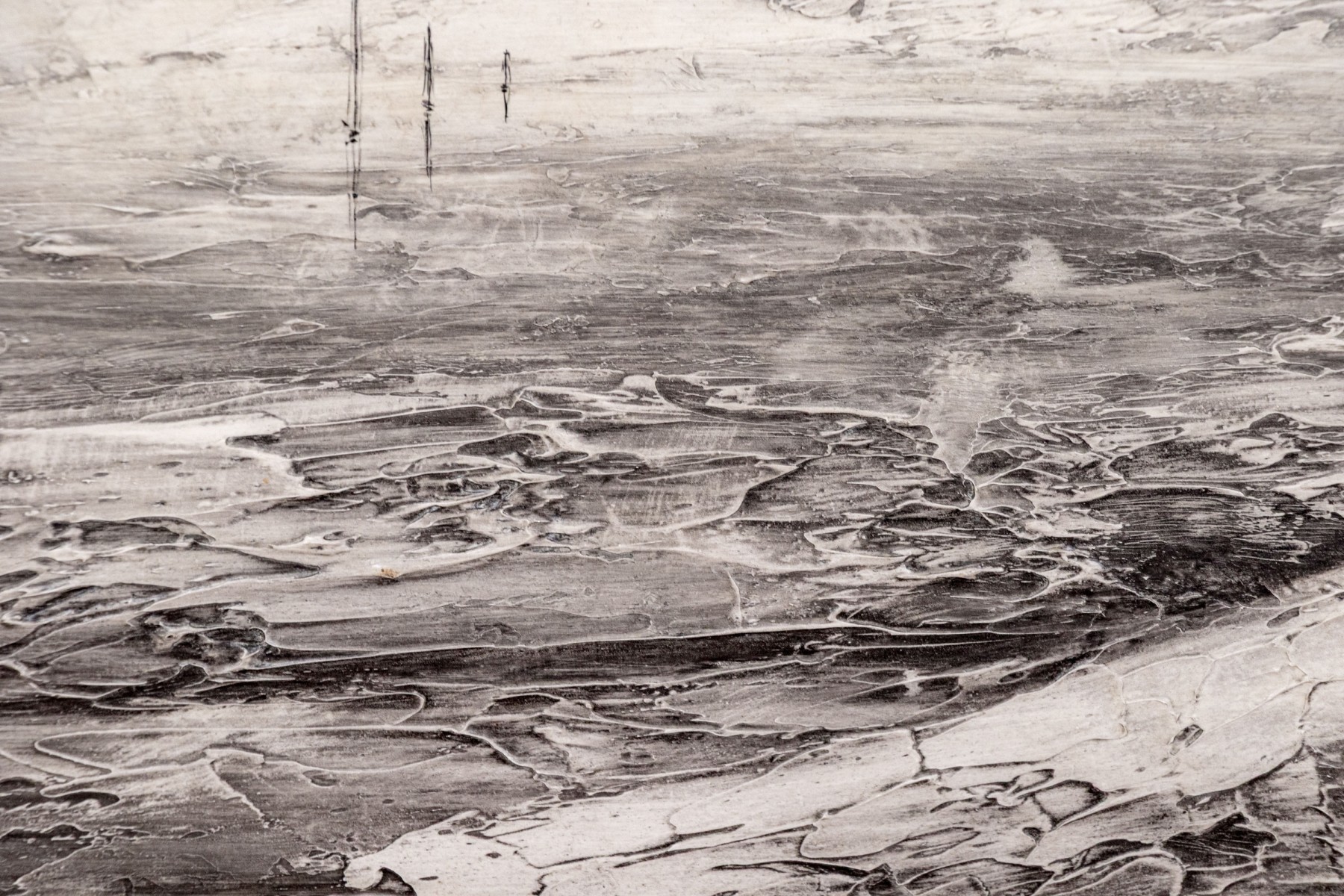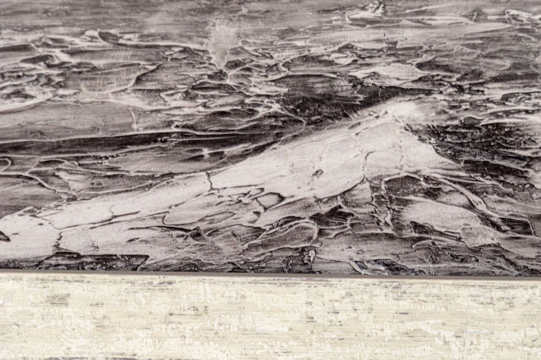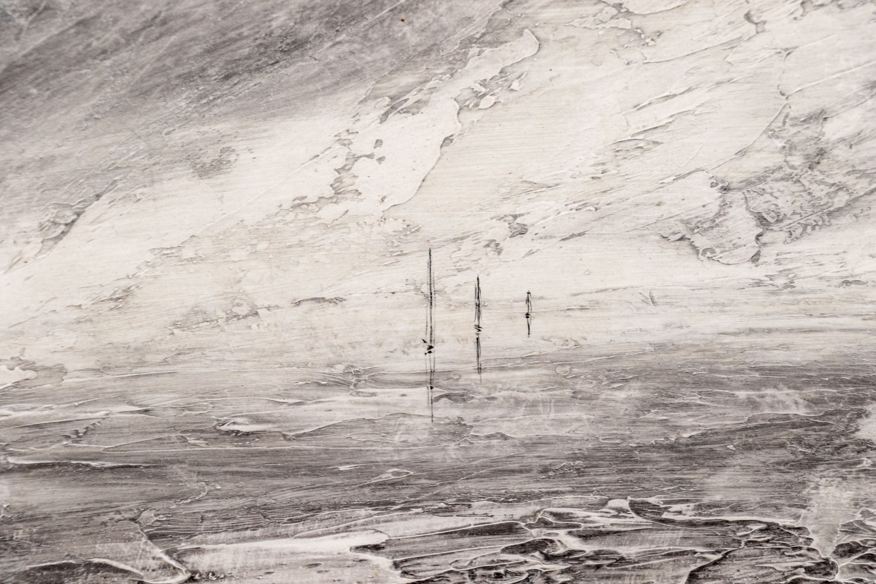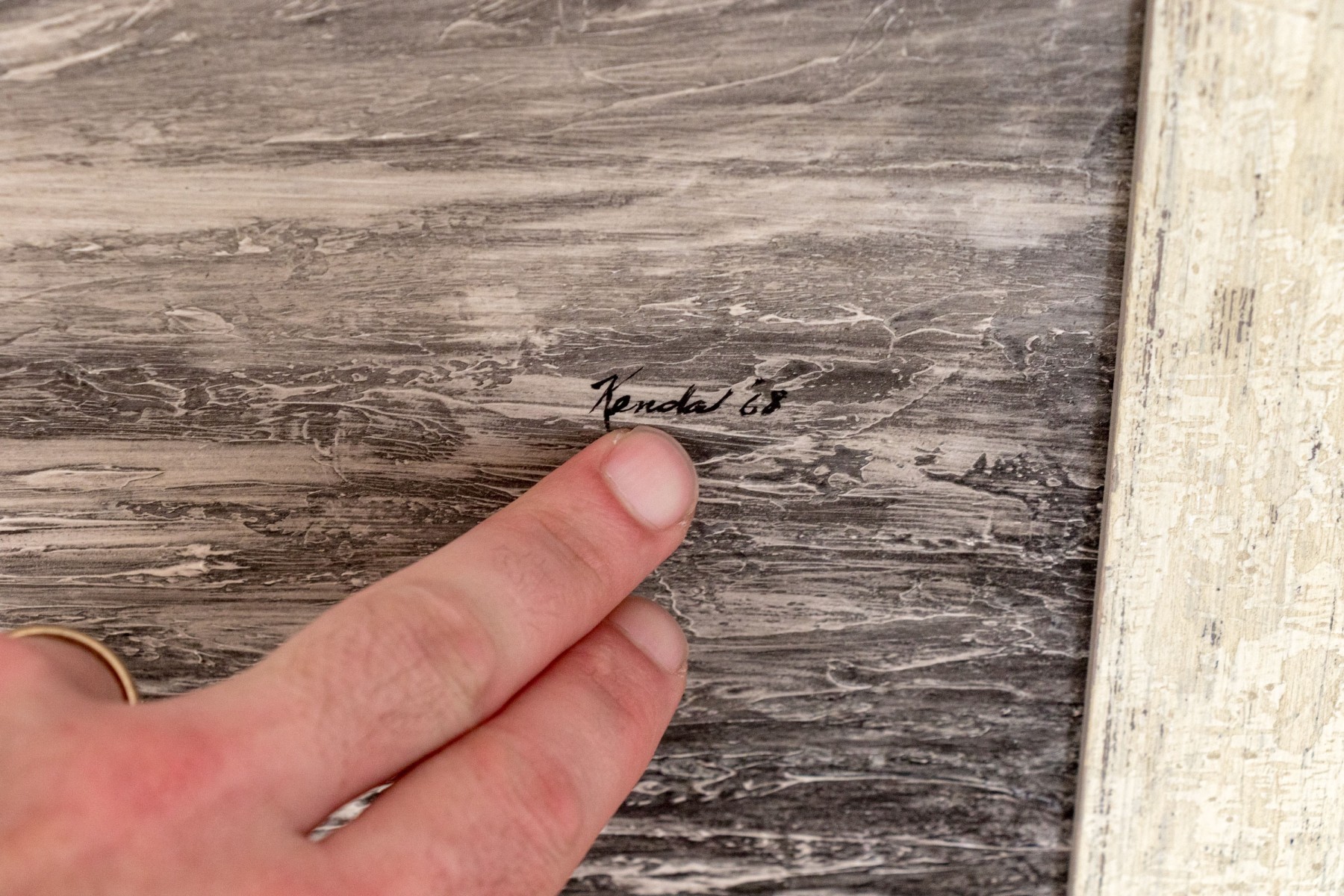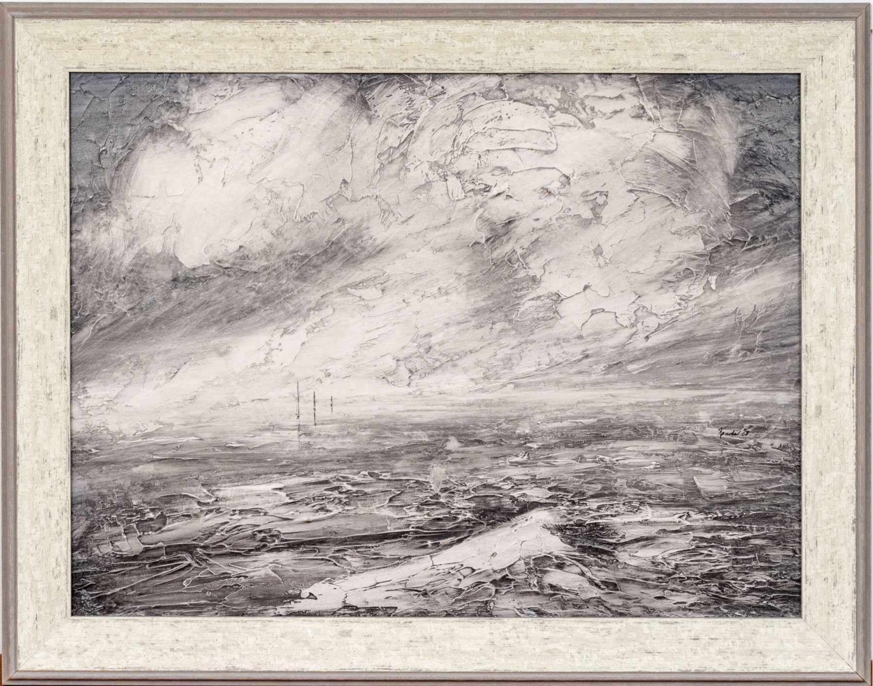 A captivating acrylic painting on panel depicting a monochromatic expressionist nautical scene with great texture throughout choppy waves and billowing clouds. Signed appearing Kenda and dated '68 lower right.