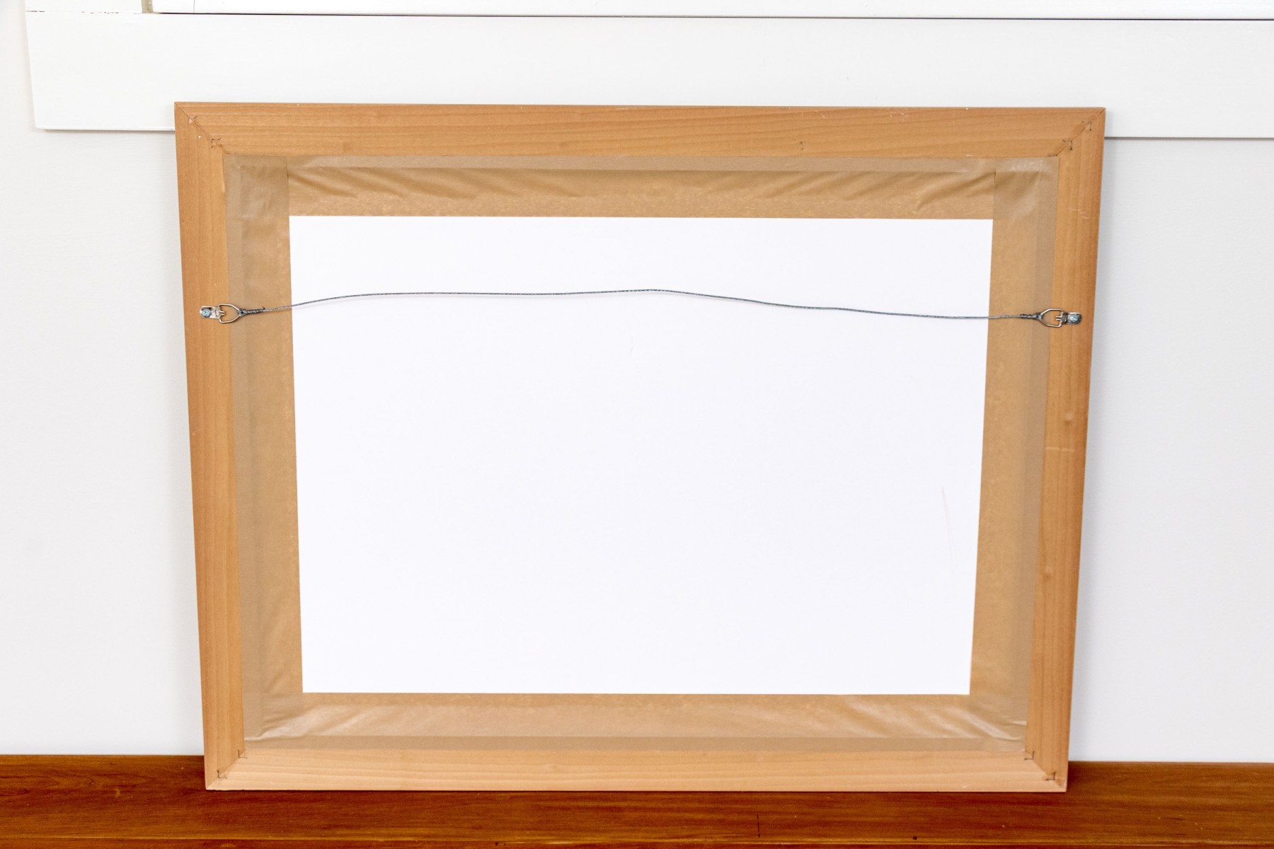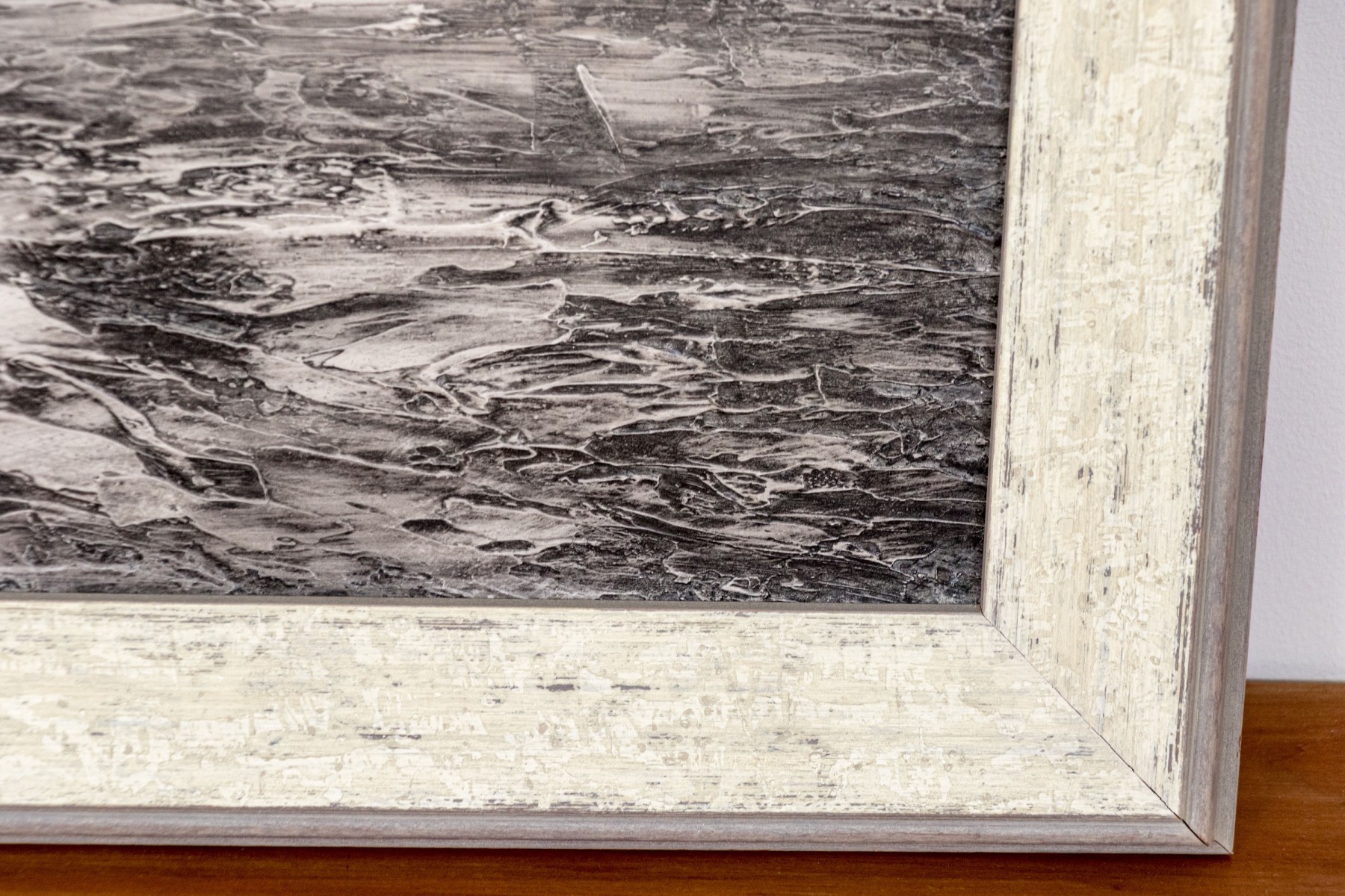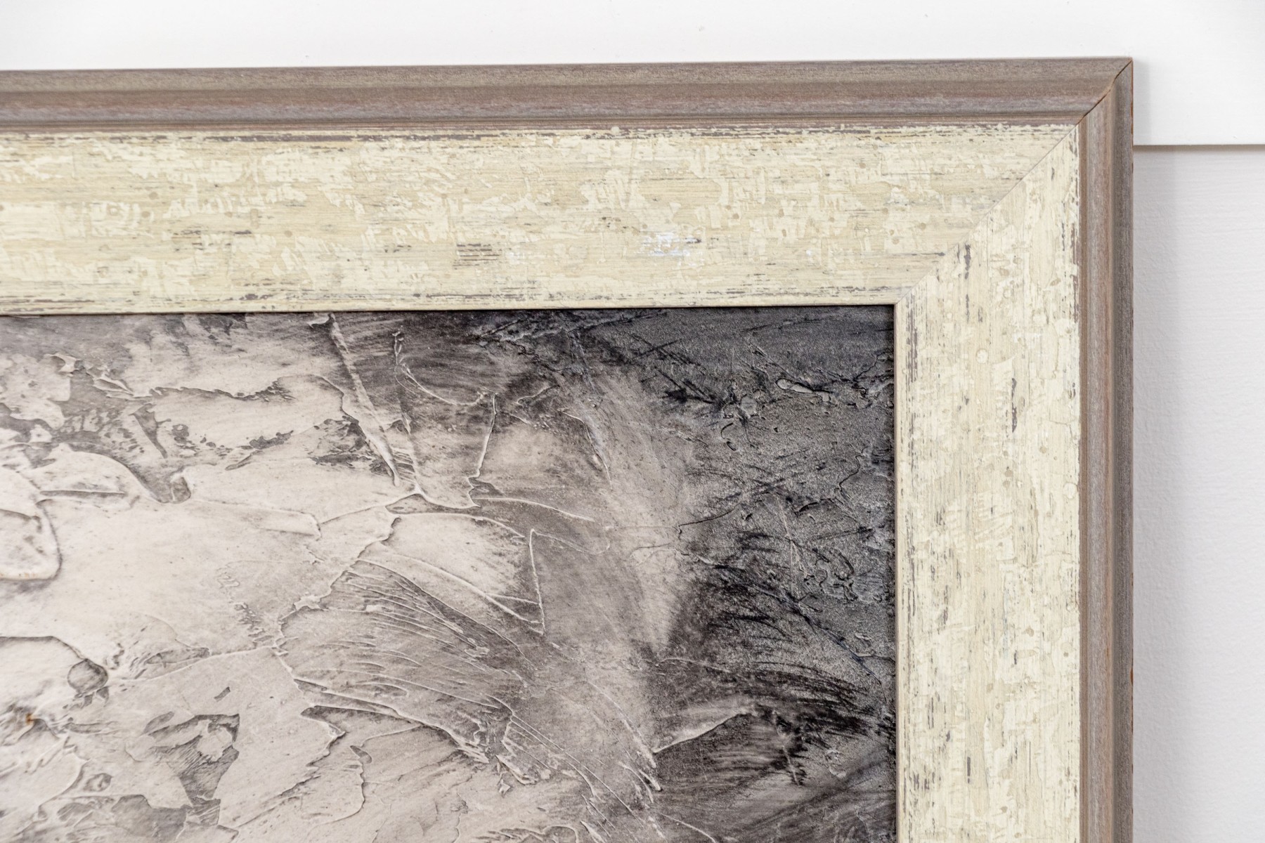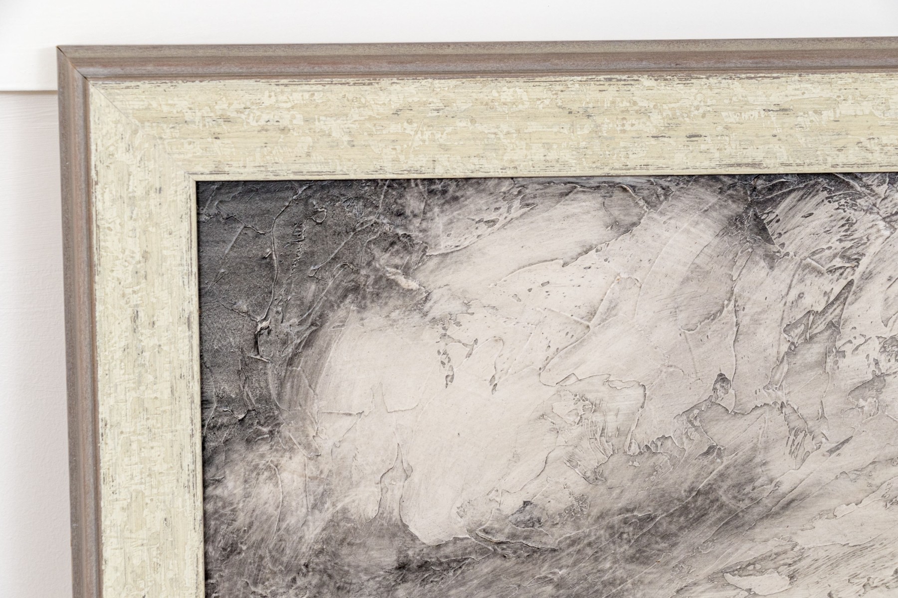 Displayed in an antiqued white painted frame with a grey outer trim.