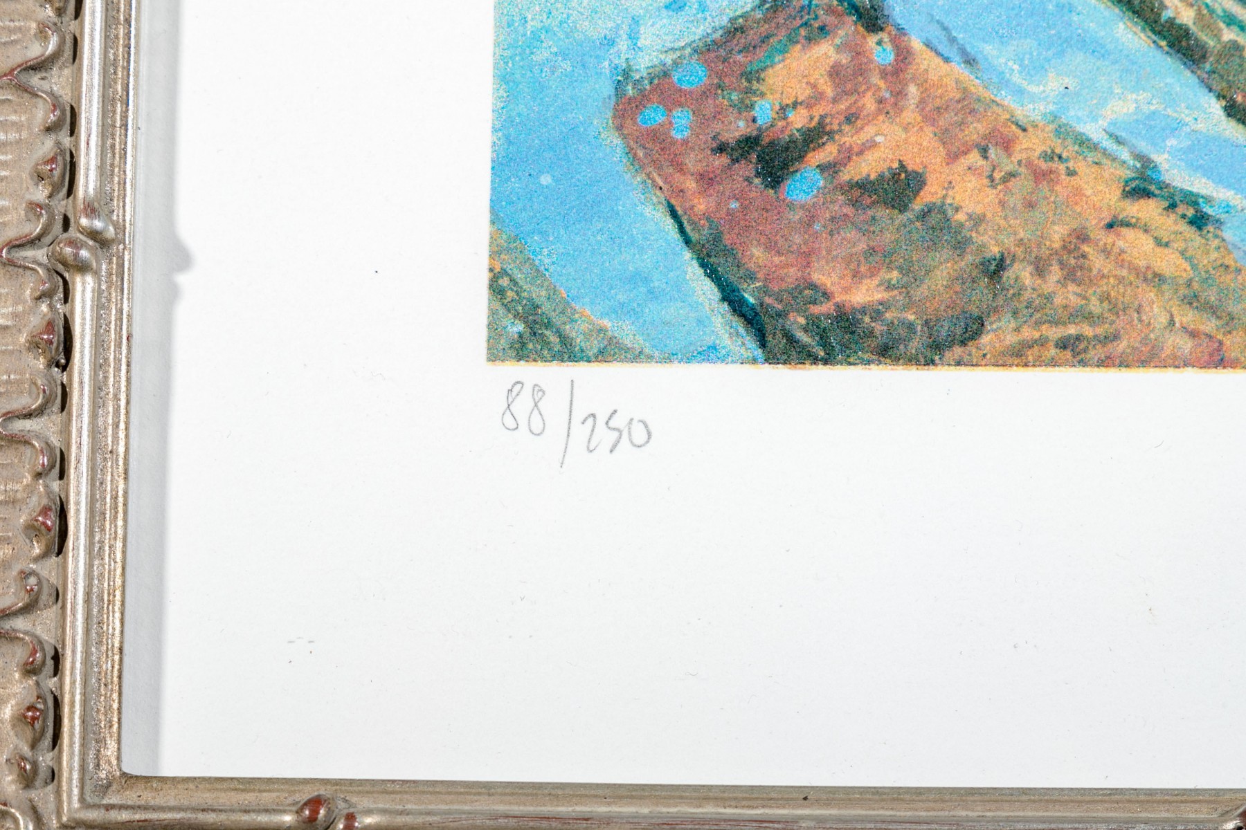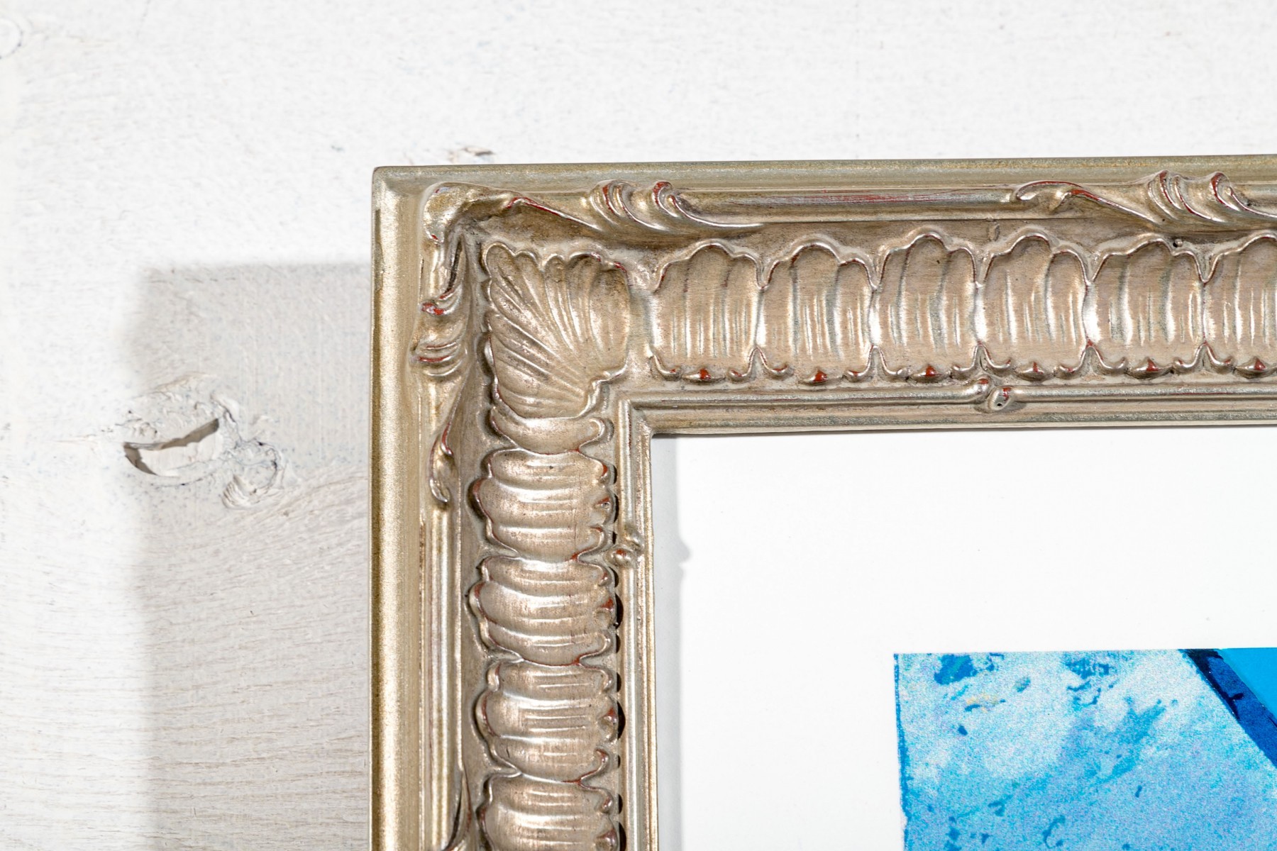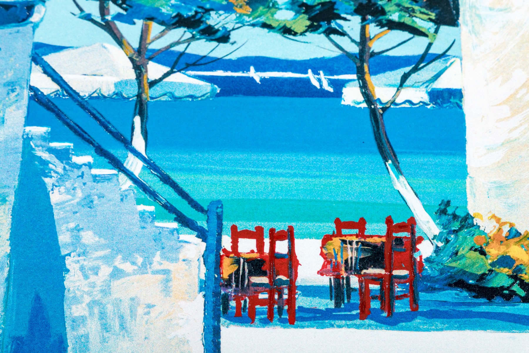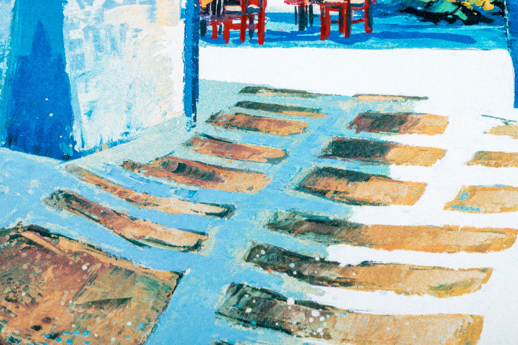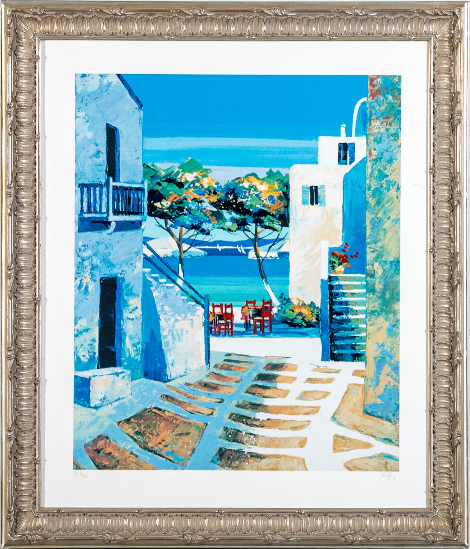 Pencil signed lower right, numbered 88/.250 lower left. Bio on verso. An island street with the classic white houses and taverna tables on the water, in blues and white. Presented in a leafy gilt frame with glass.