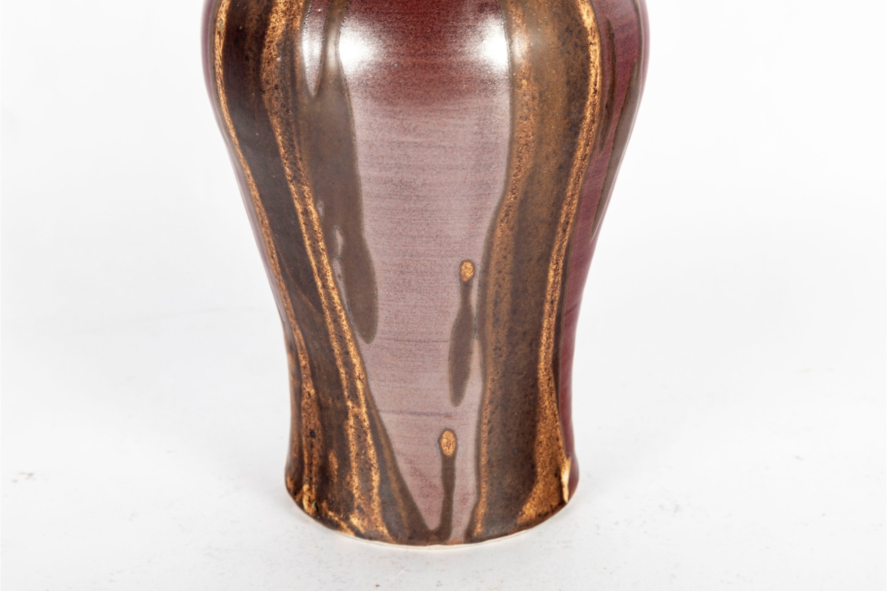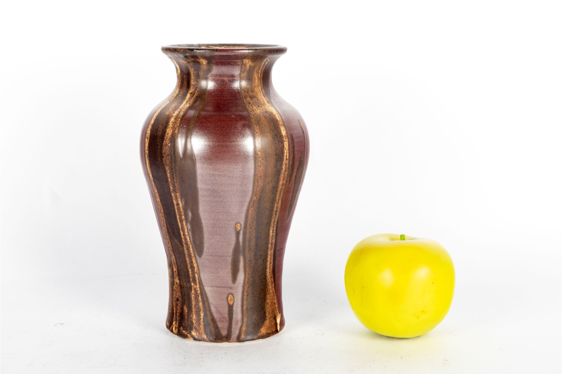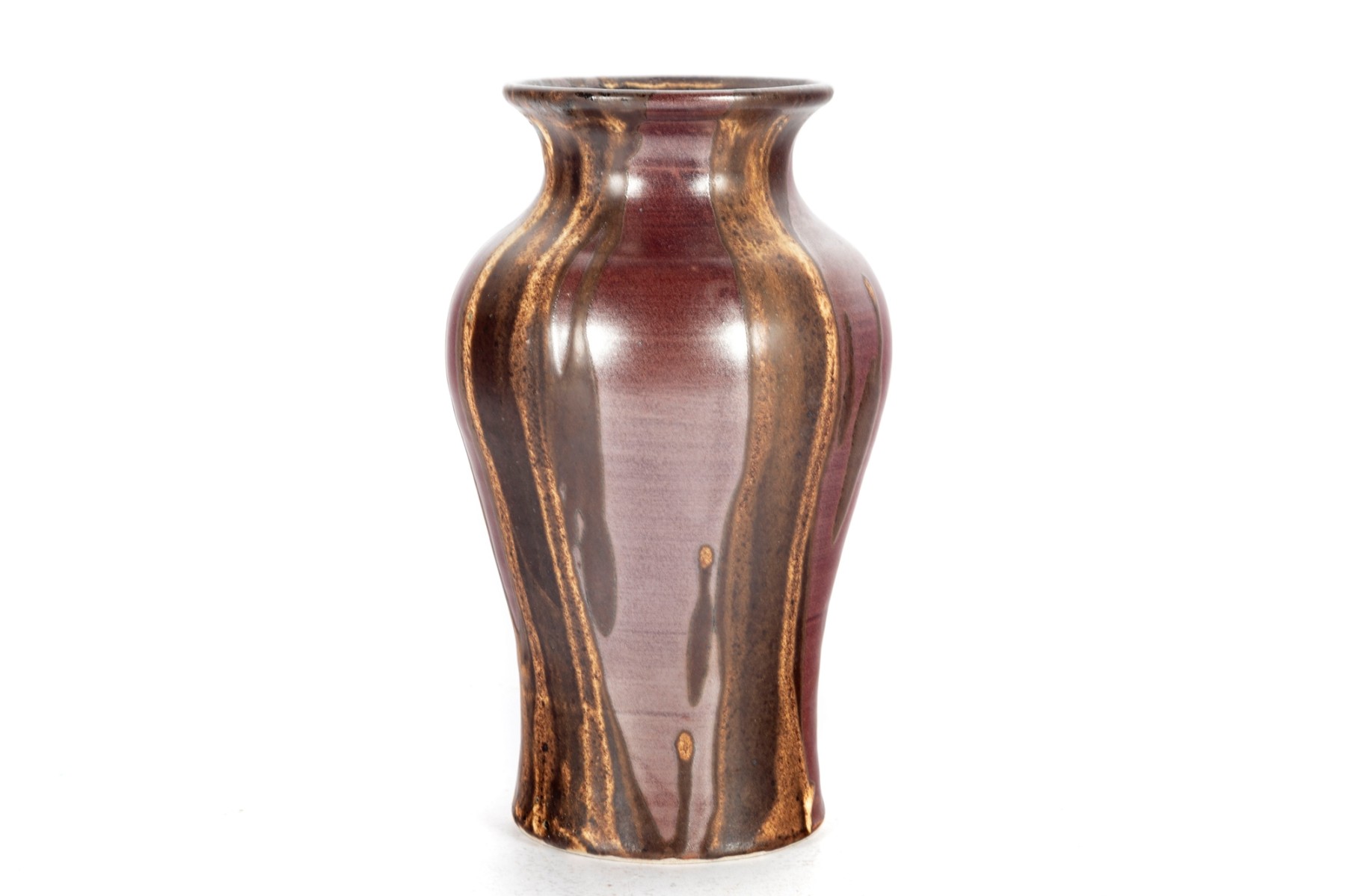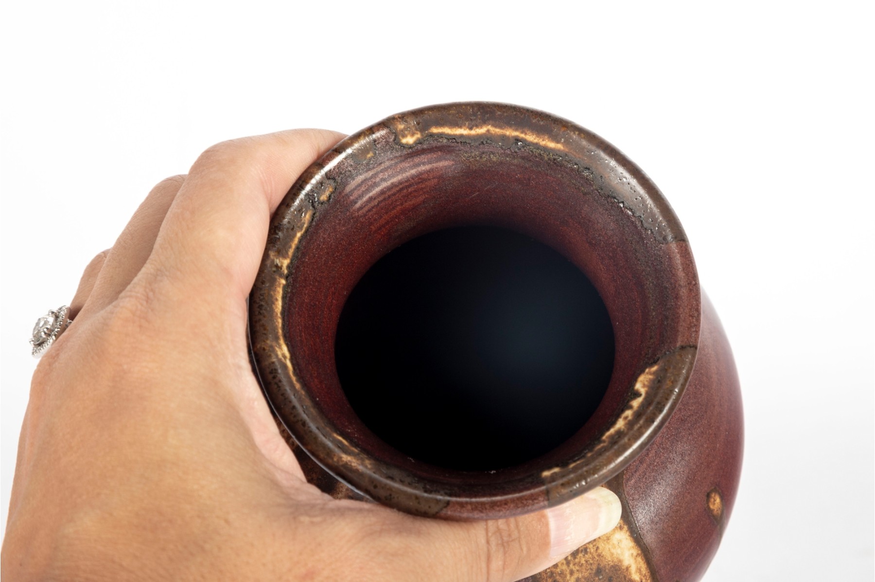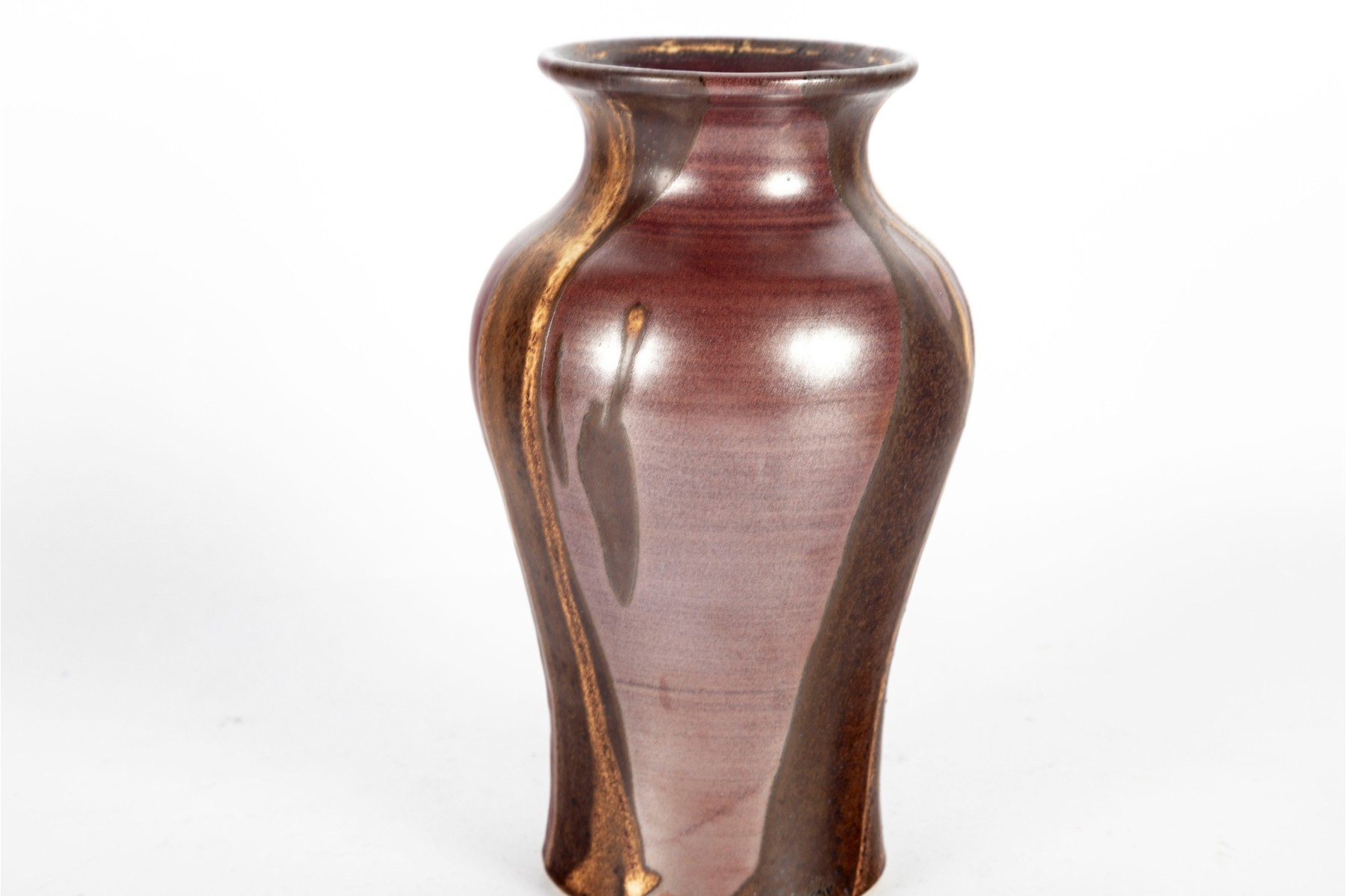 Kim Ellington lives in the community of Vale, NC, where the use of local clays, ash (alkaline) glaze and high temperature groundhog kilns make beautiful, one-of-a-kind glaze patterns like this 8" tall vase example shown here.