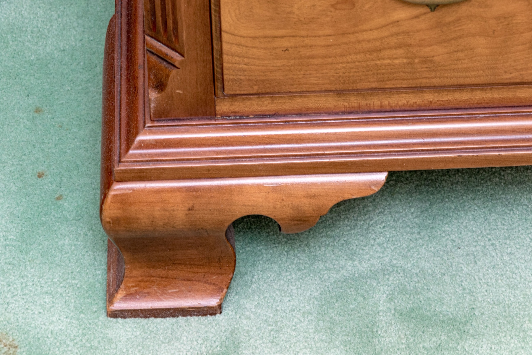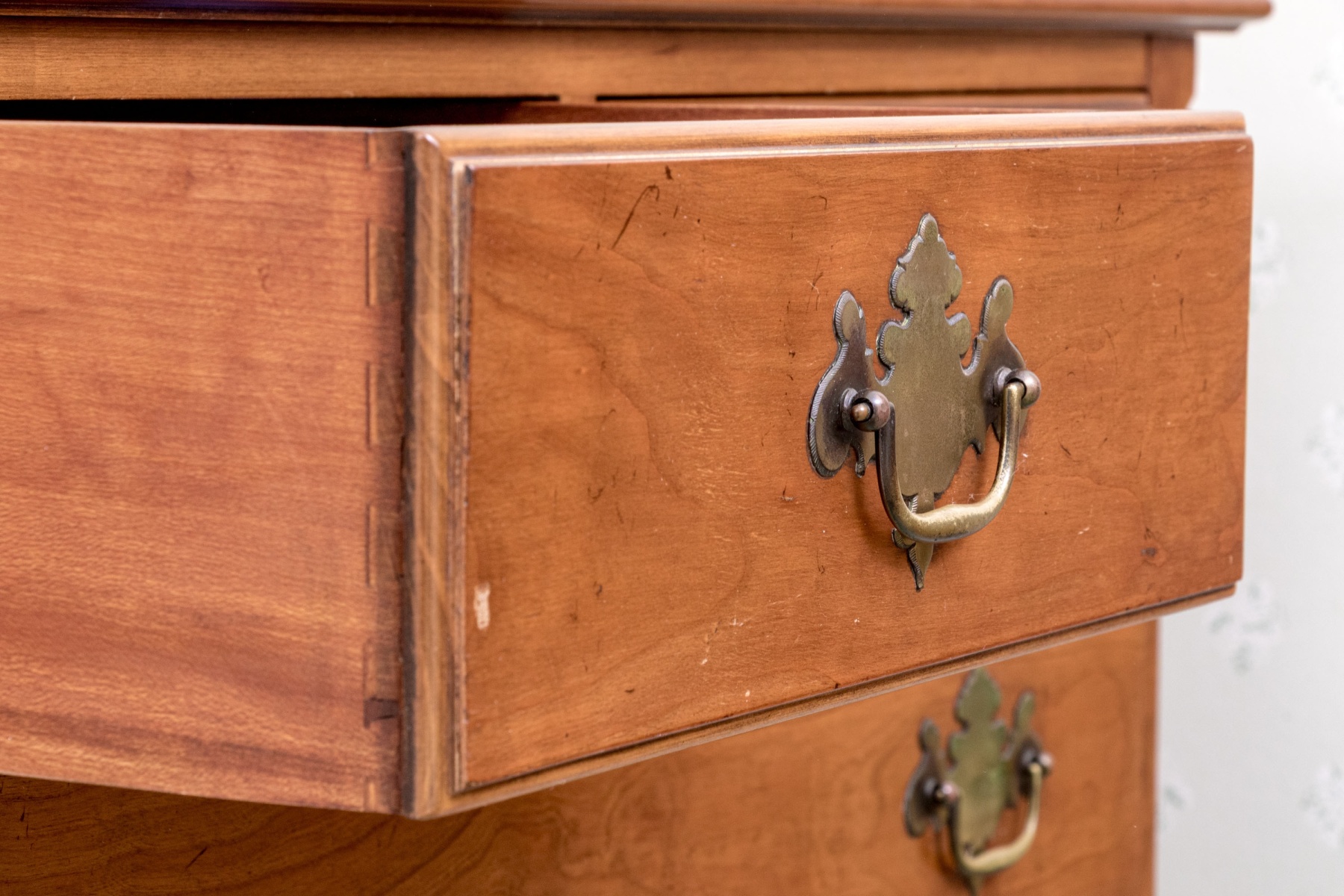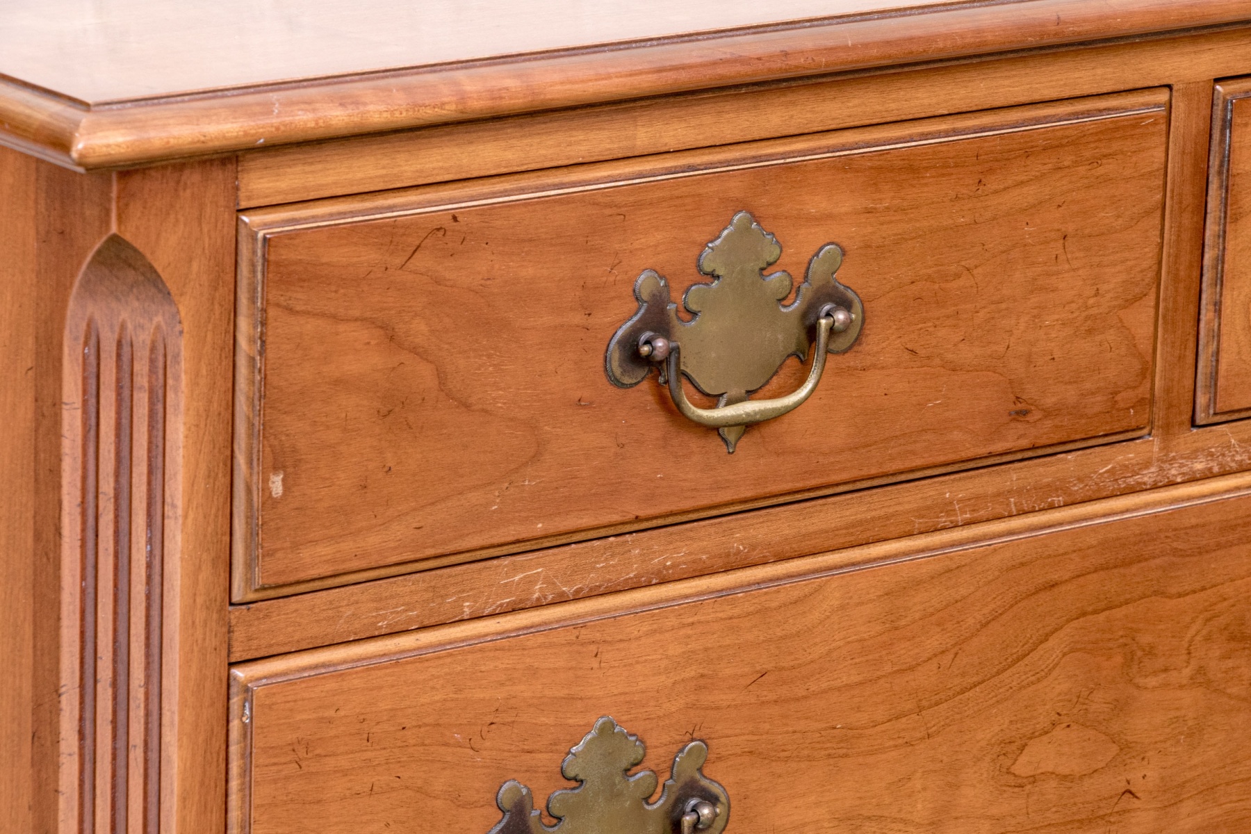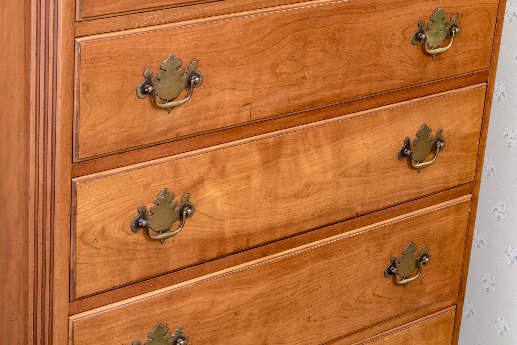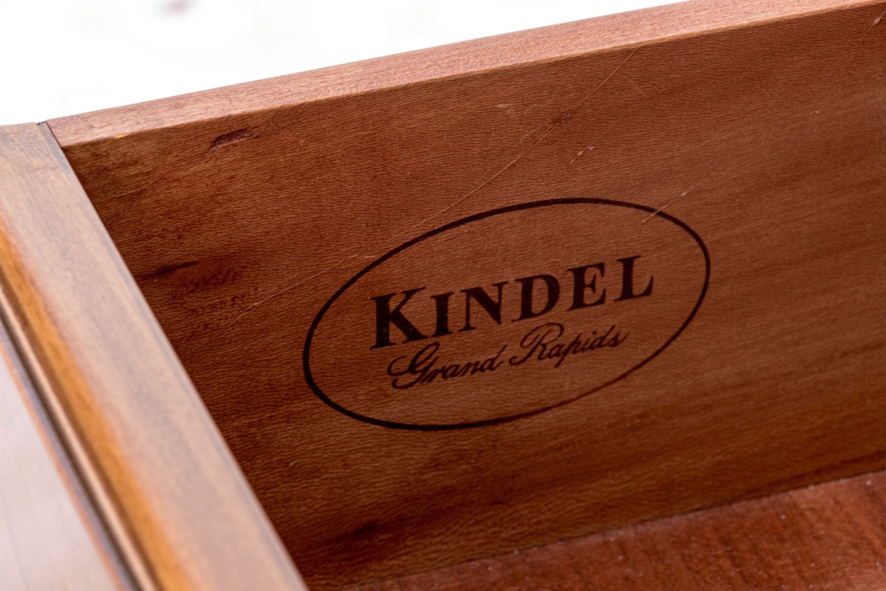 A handsome Kindel Furniture chest of drawers in classic Chippendale and Federal fashion, sanding on four short bracket form feet, the chest has four graduated long drawers, each with a pair of brass batwing pulls. Surmounting the long drawers are a pair of short drawers with a single brass batwing pull to each.
