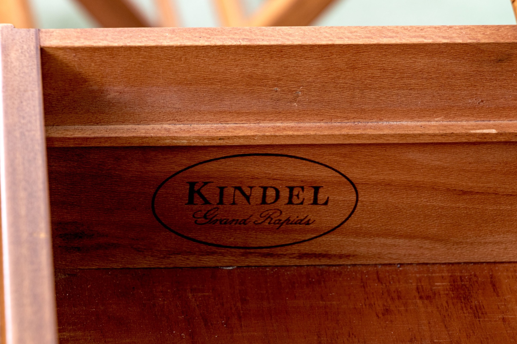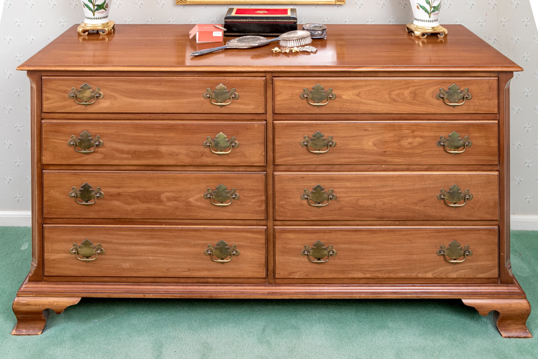 A wonderful Kindel Furniture dresser in classic Federal and Georgian fashion standing upon four bracket form feet, the rectangular case is handsomely finished and boasts two bays of four drawers, all with pairs of brass batwing drawer pulls. Labeled inside top drawer.