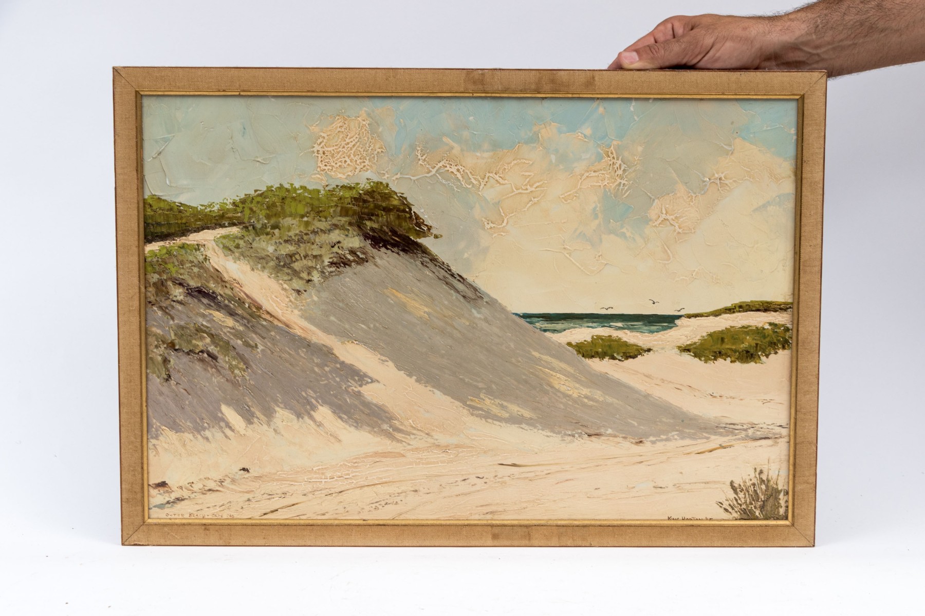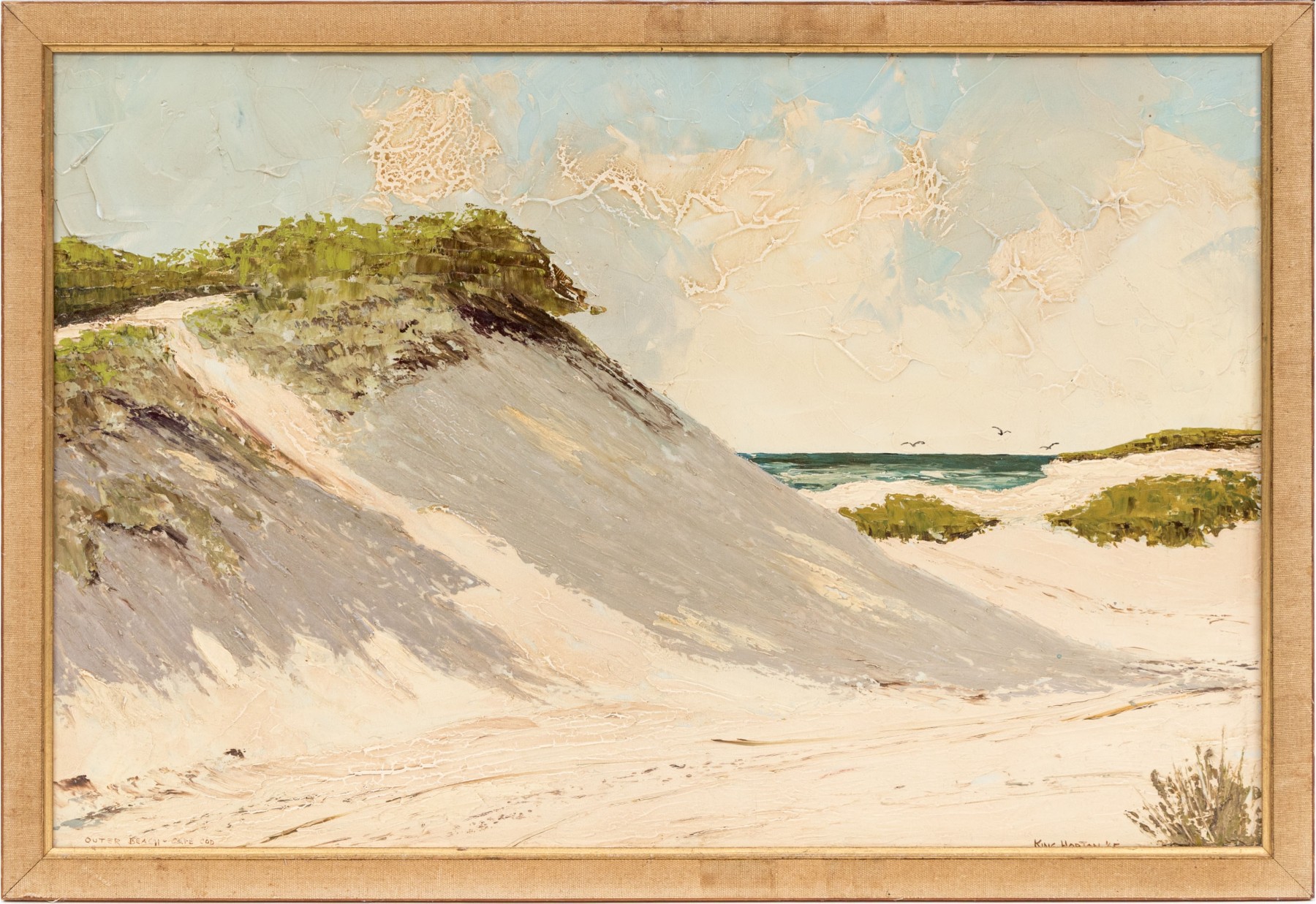 King Horton (American, 20th C.) "Outer Beach-Cape Cod" oil painting on board depicting a wonderful coastal landscape with beach sand dunes and grasses of Cape Cod. Signed and dated lower right, titled lower left.