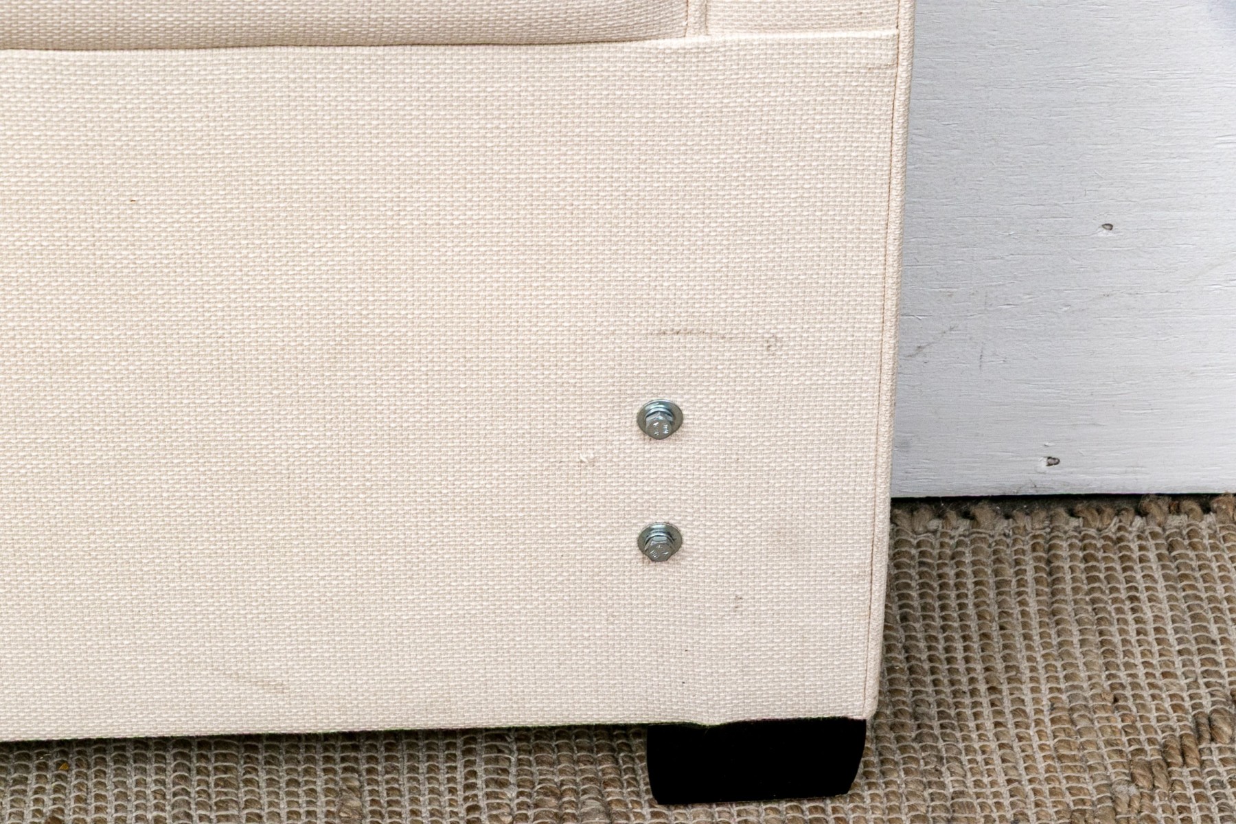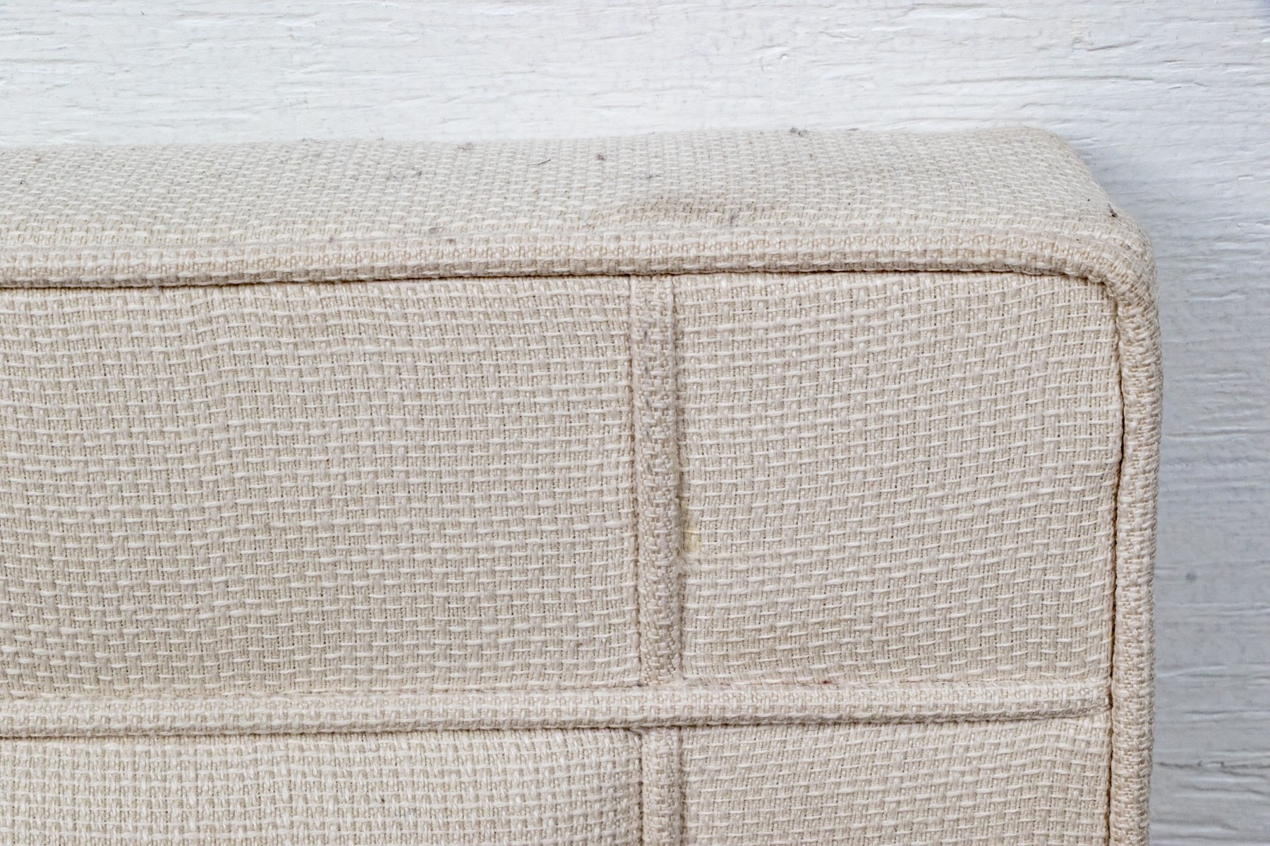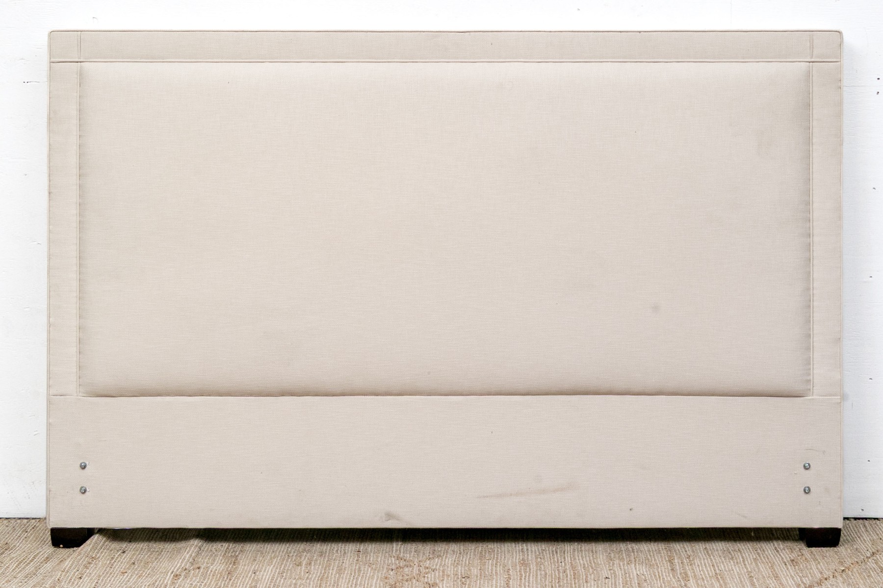 Elegant king size headboard upholstered in quality white fabric tufted in the center. Raised on flat wood feet. Lacking rails, etc.