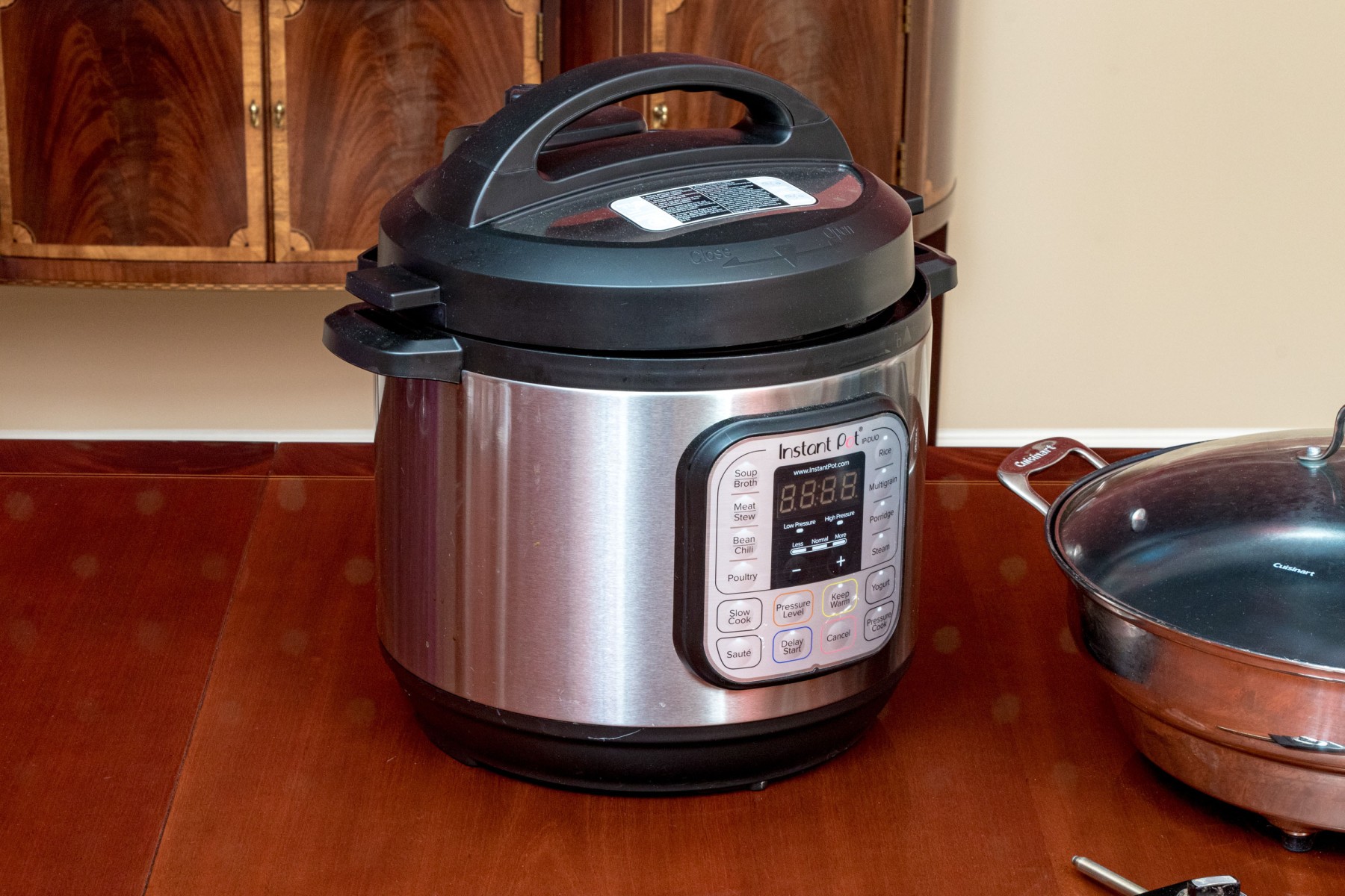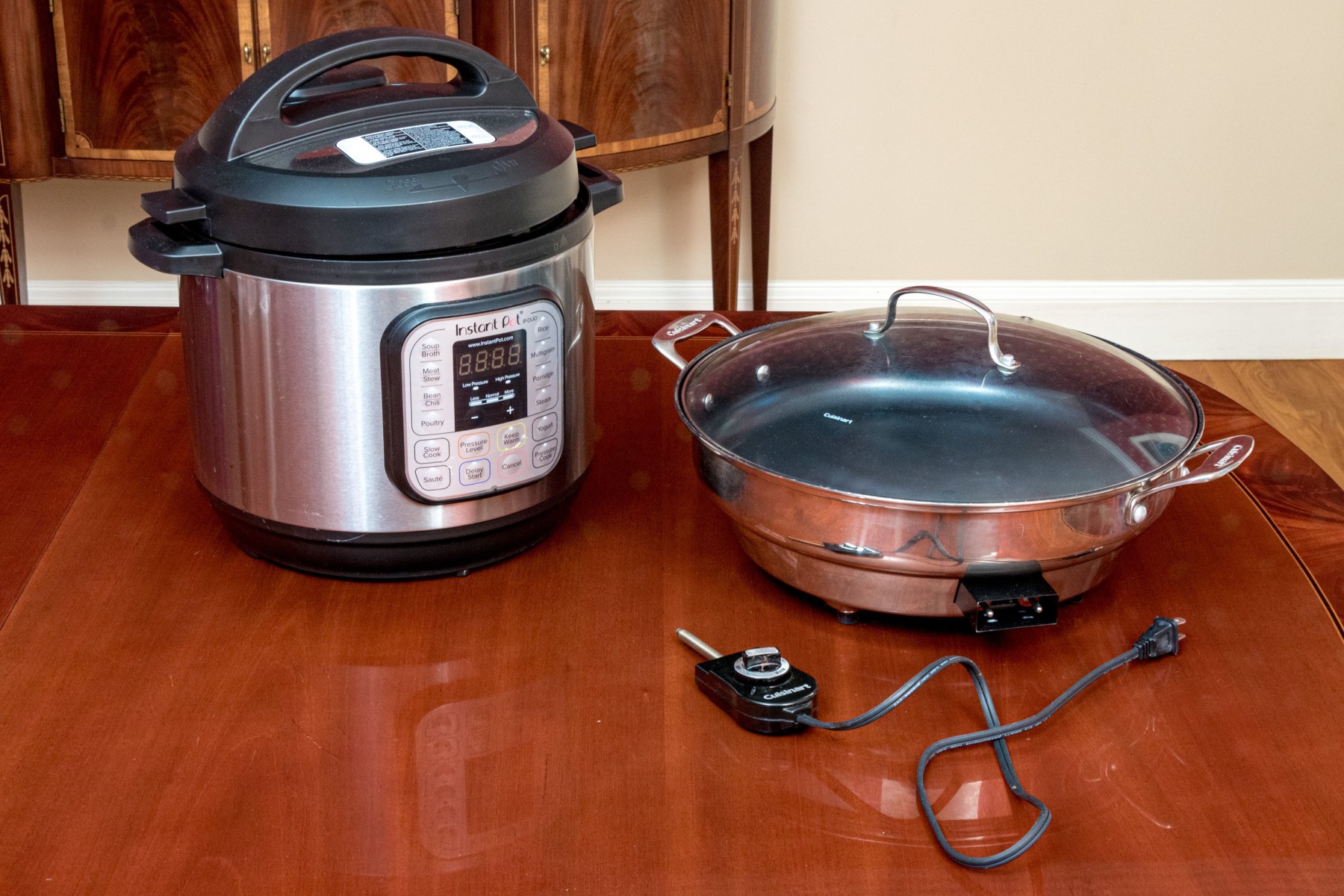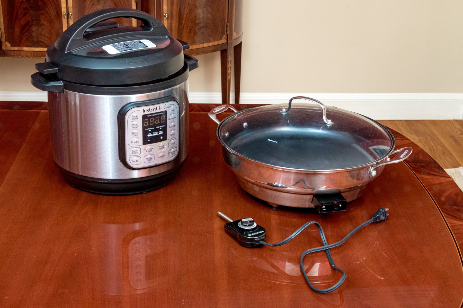 Comprised of an instant Pot with Cuisinart electrical two handled skillet with lid