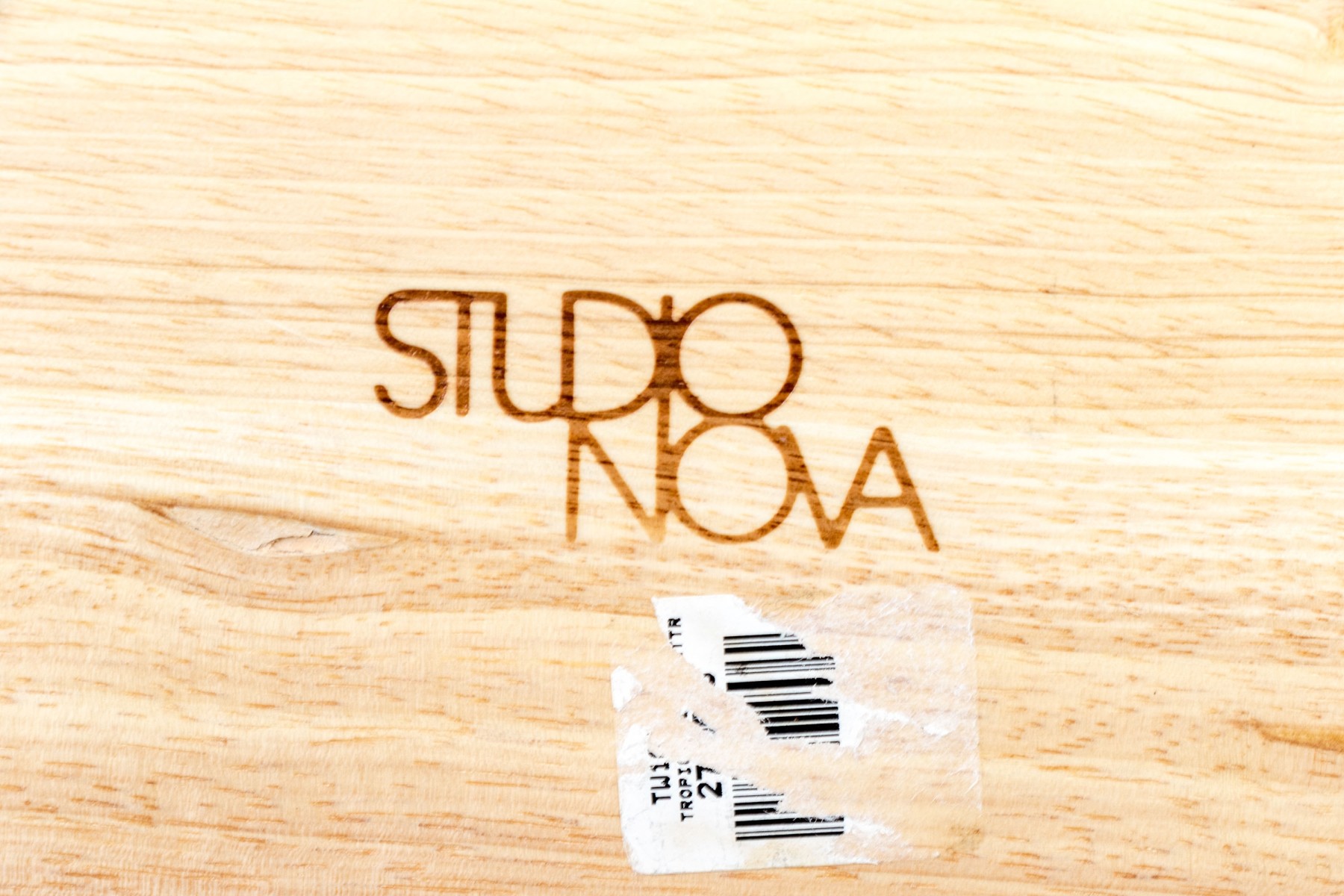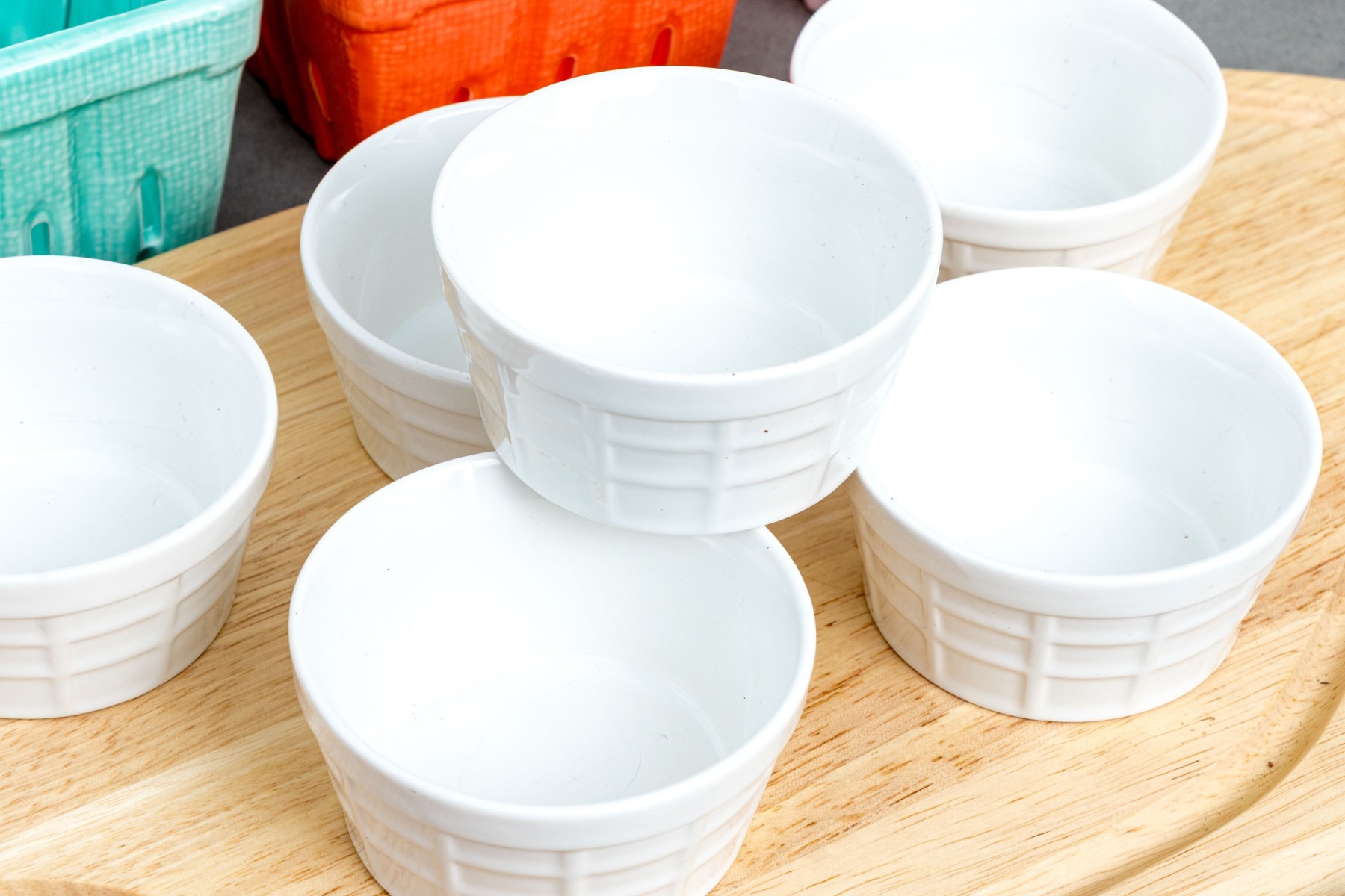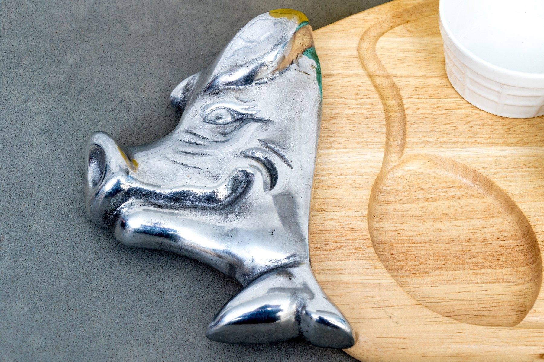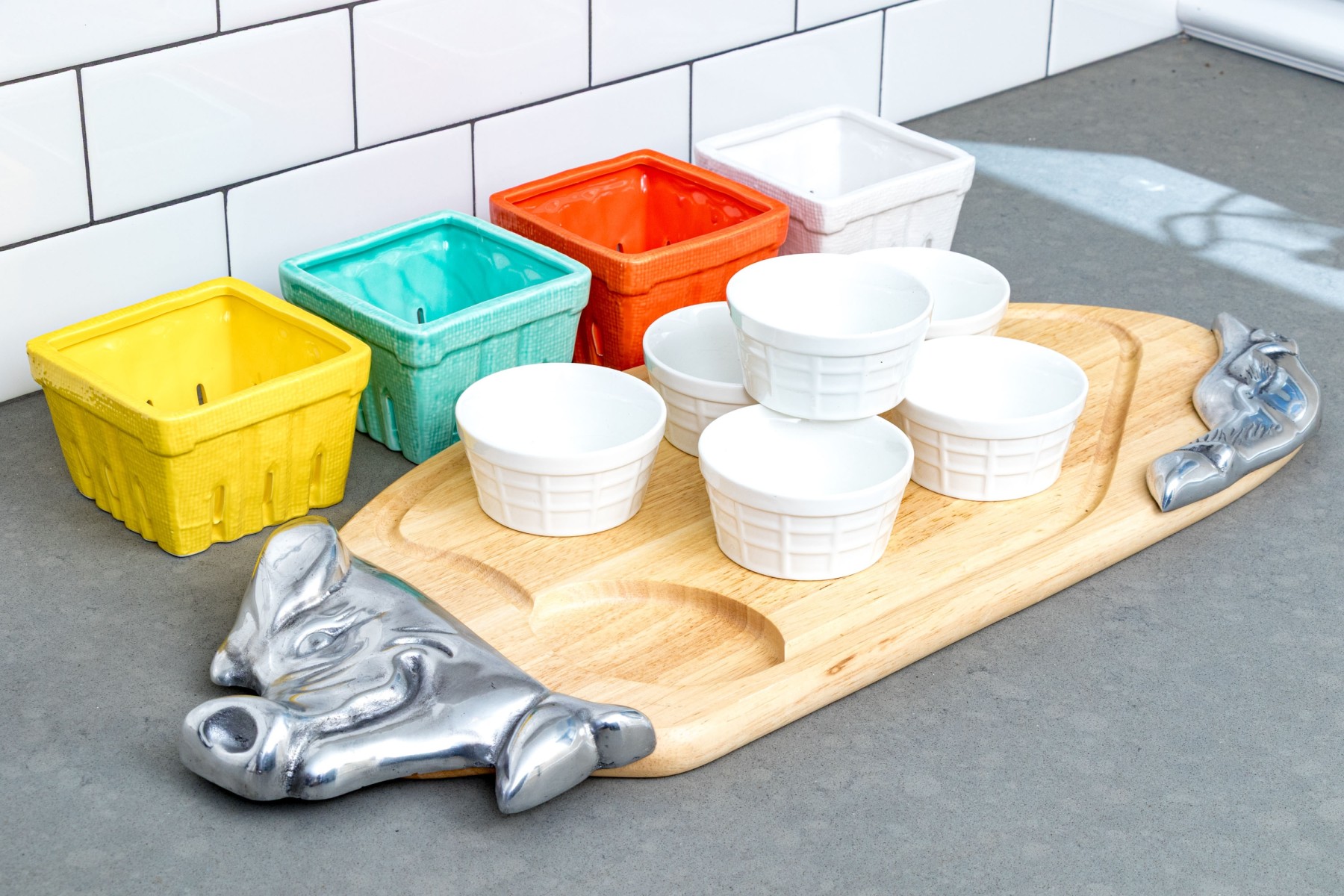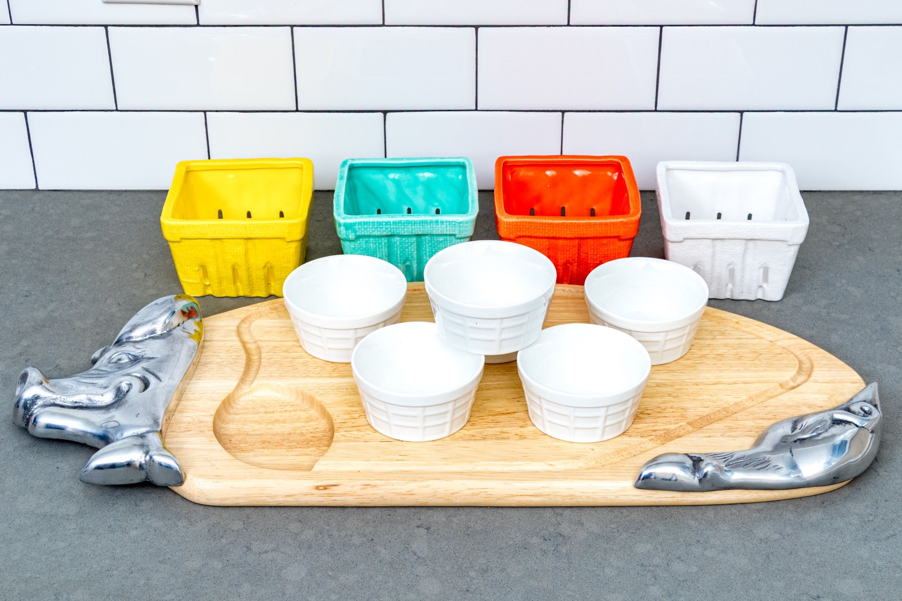 Comprised of a Studio Nova cutting board with cast metal pick head and back leg, with four color glazed openwork ceramic bowls and six ramekins.