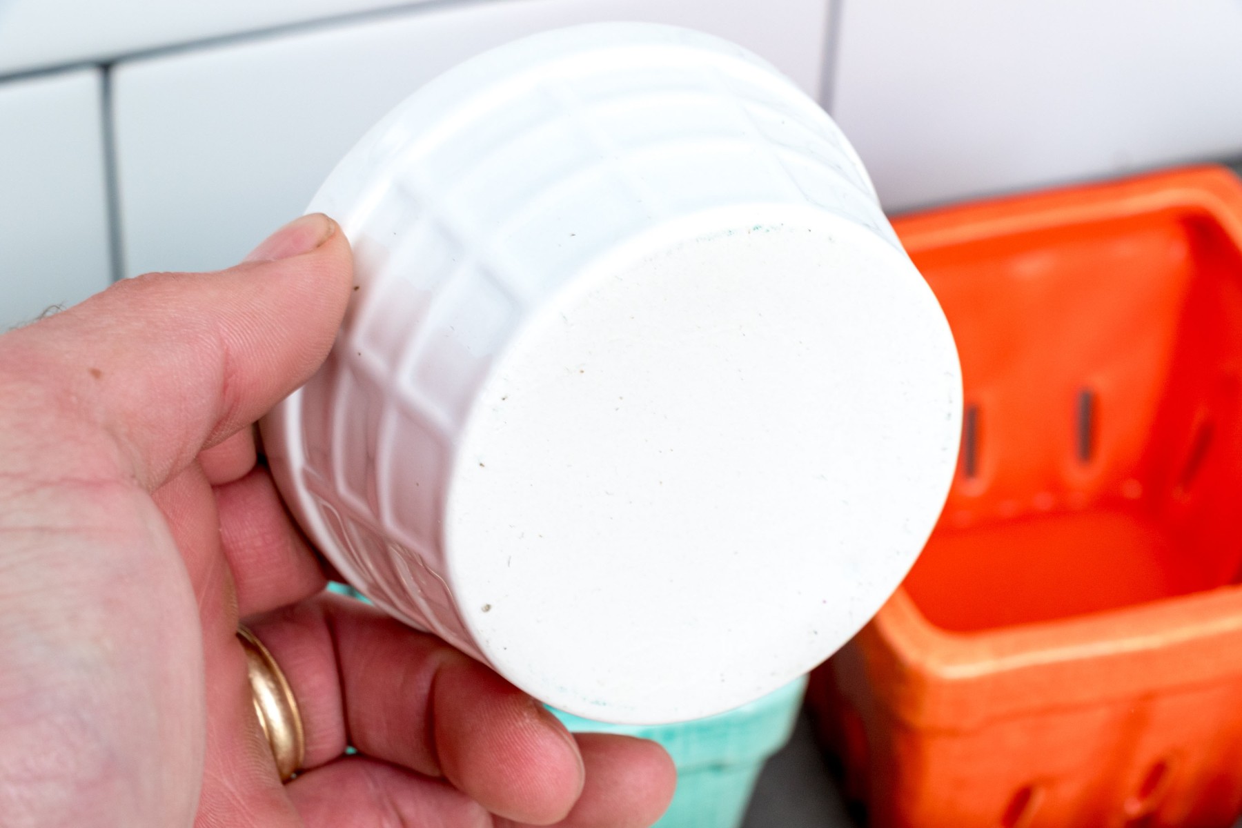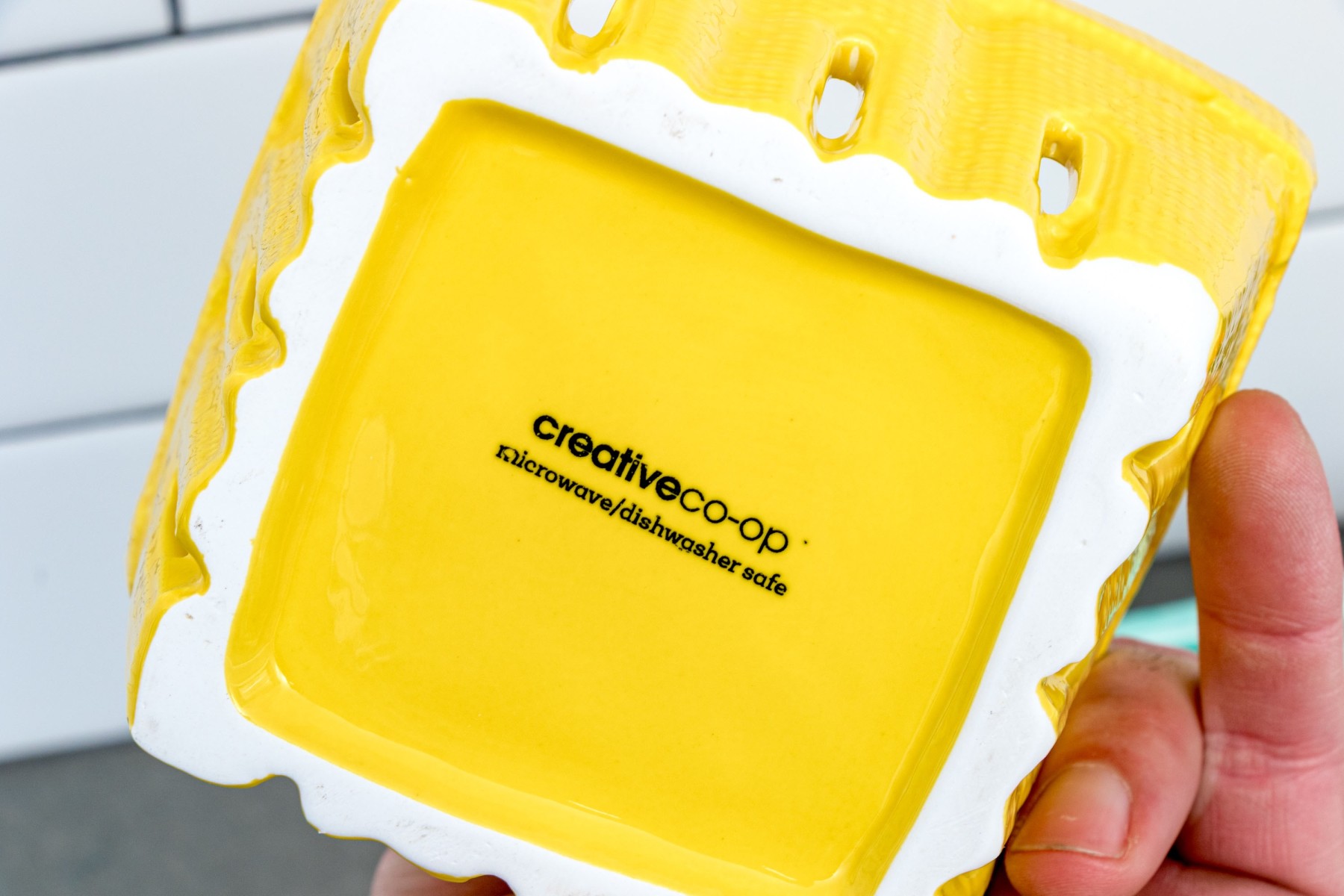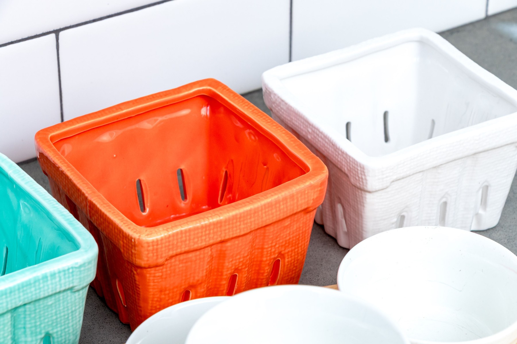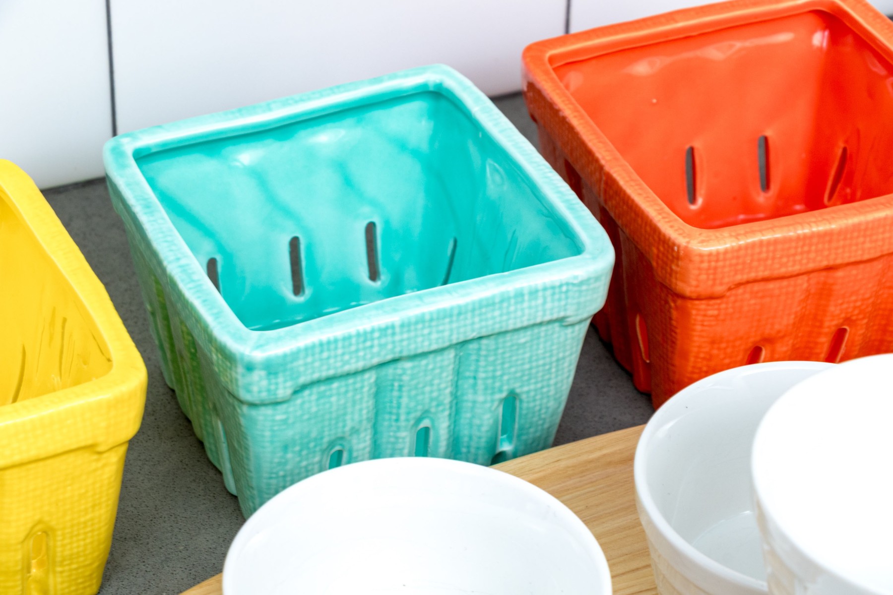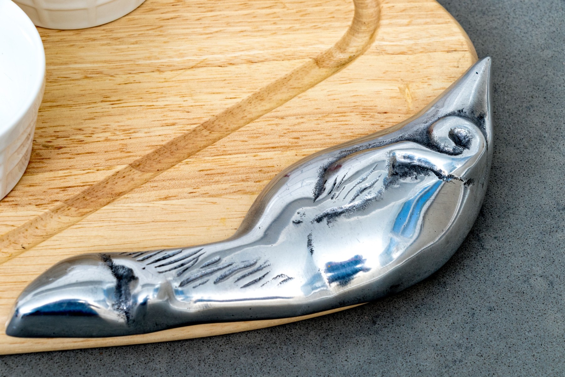 Comprised of a Studio Nova cutting board with cast metal pick head and back leg, with four color glazed openwork ceramic bowls and six ramekins.