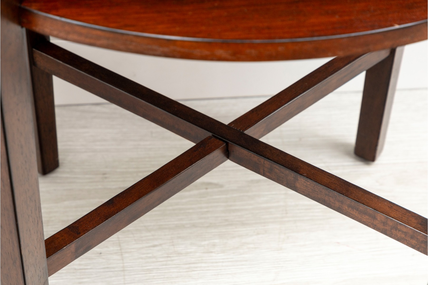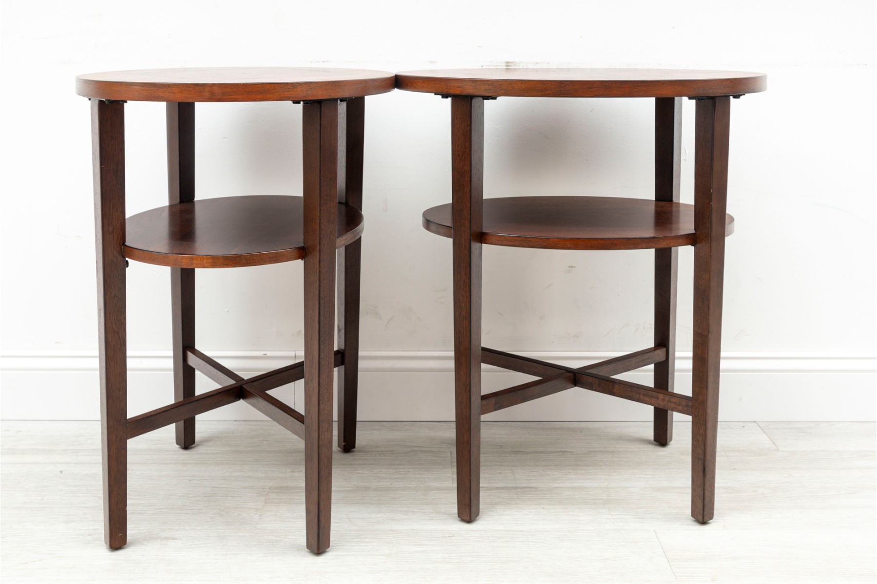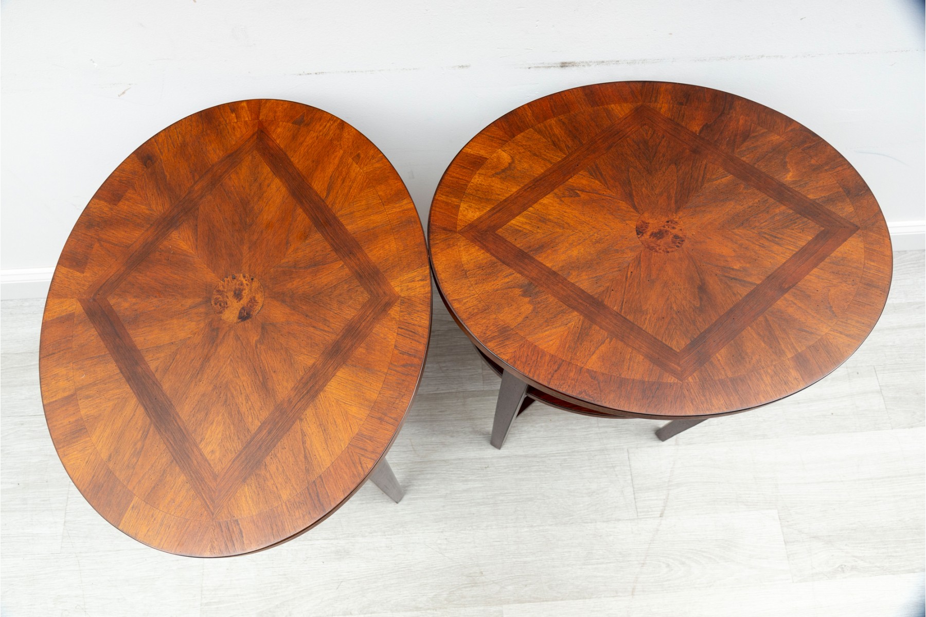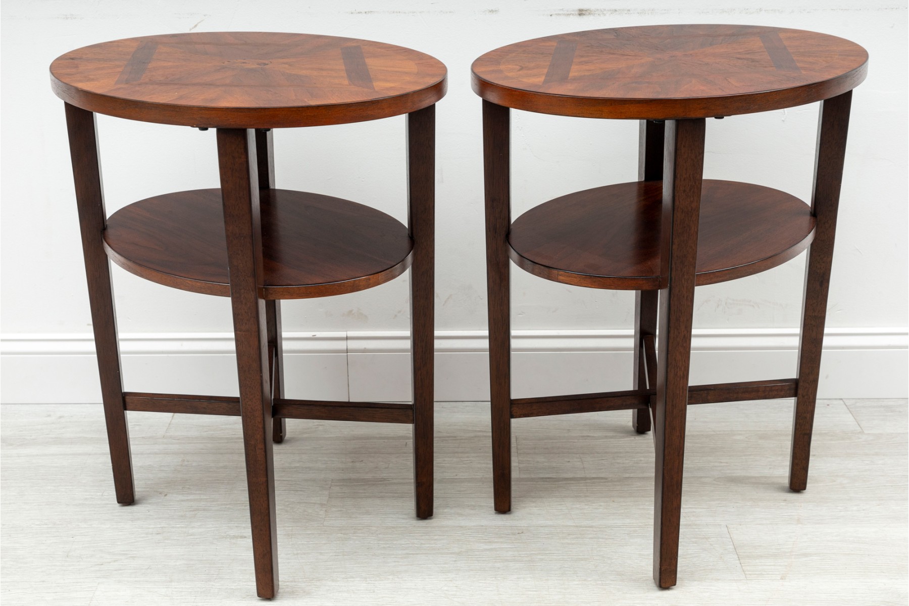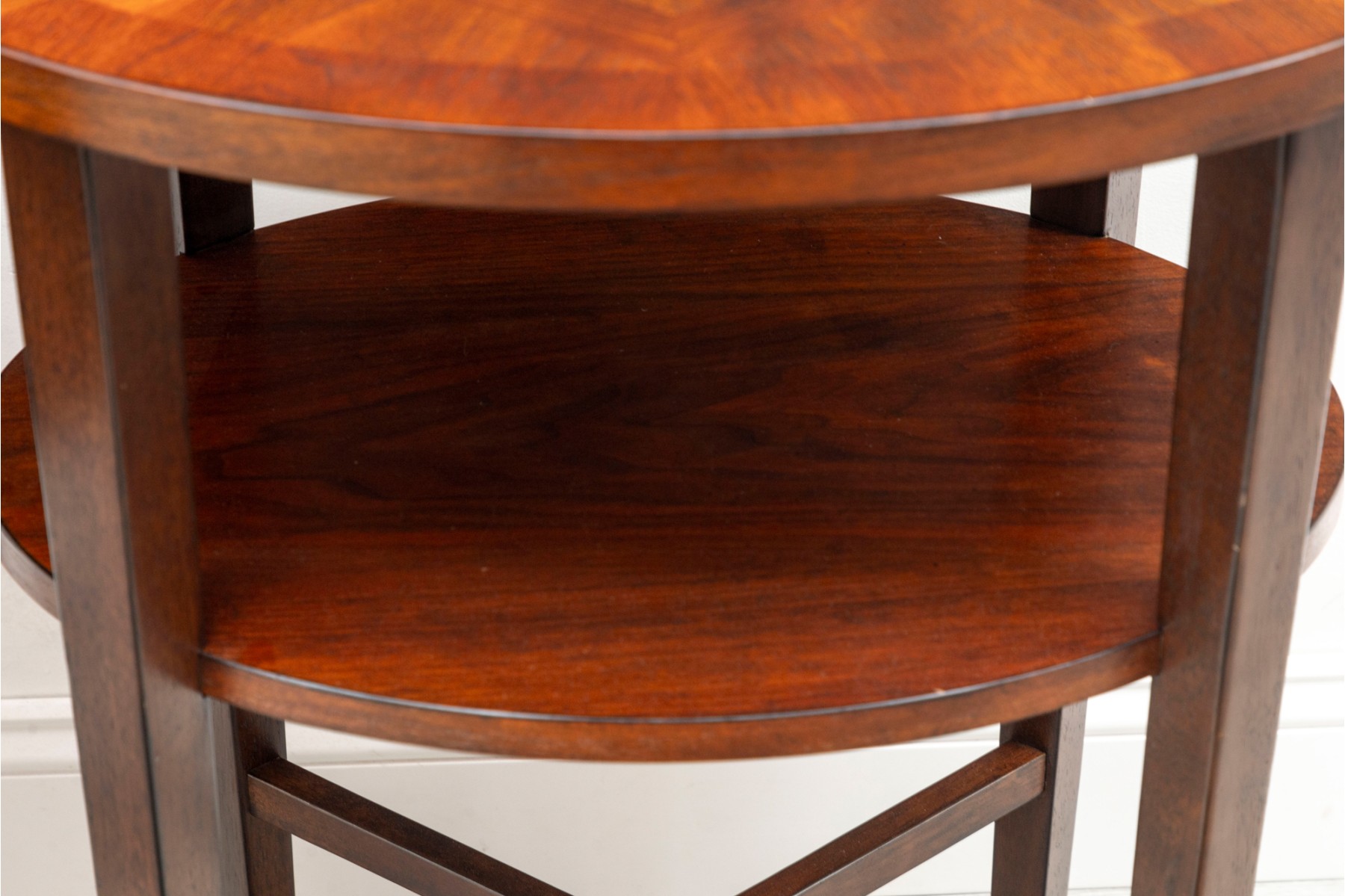 This occasional oval end table with two tiers features a walnut finish with inlay top. Perfect as end tables with a handy shelf for magazines or books, those of which are supported on cross-frame stretchers.