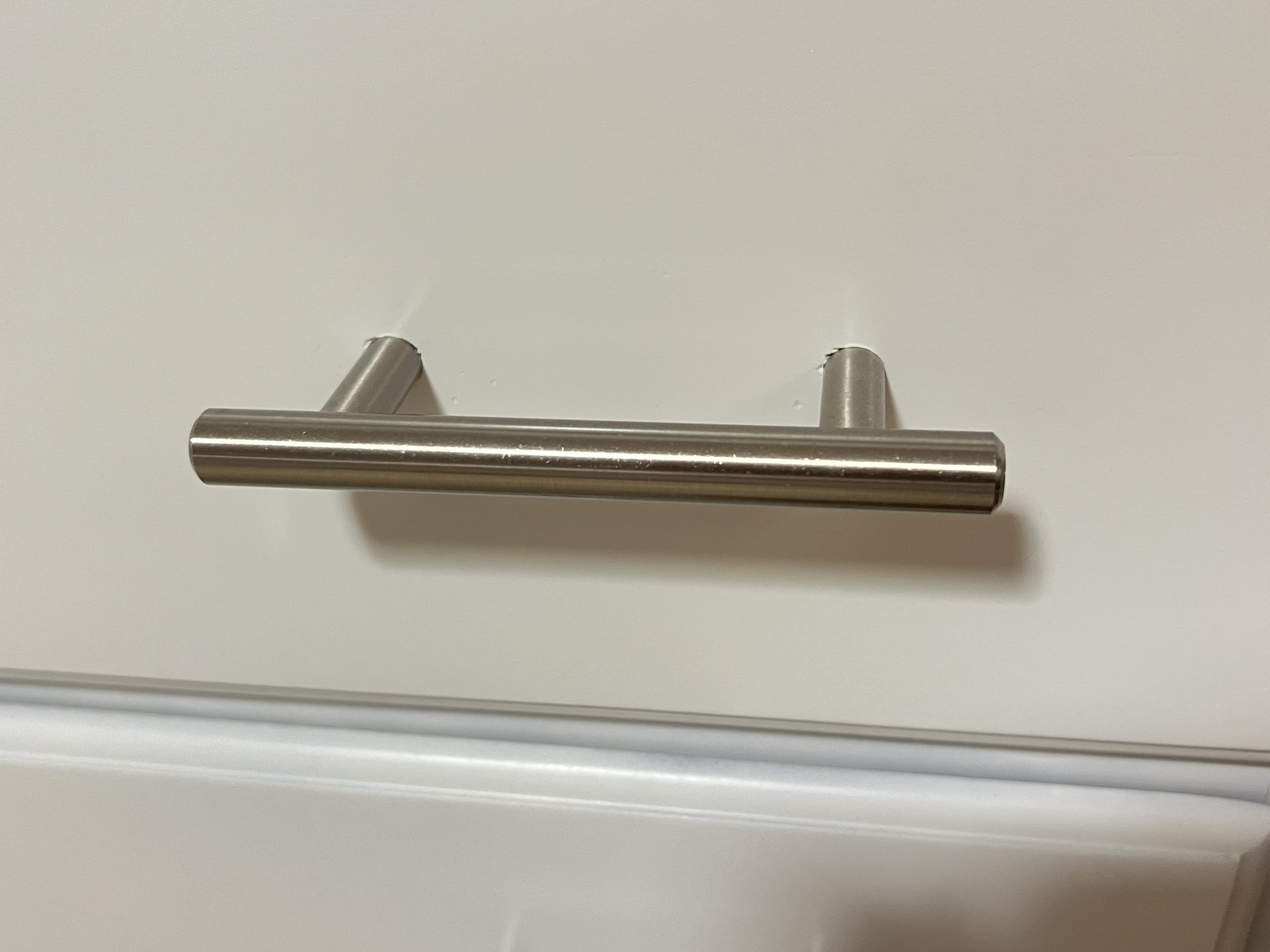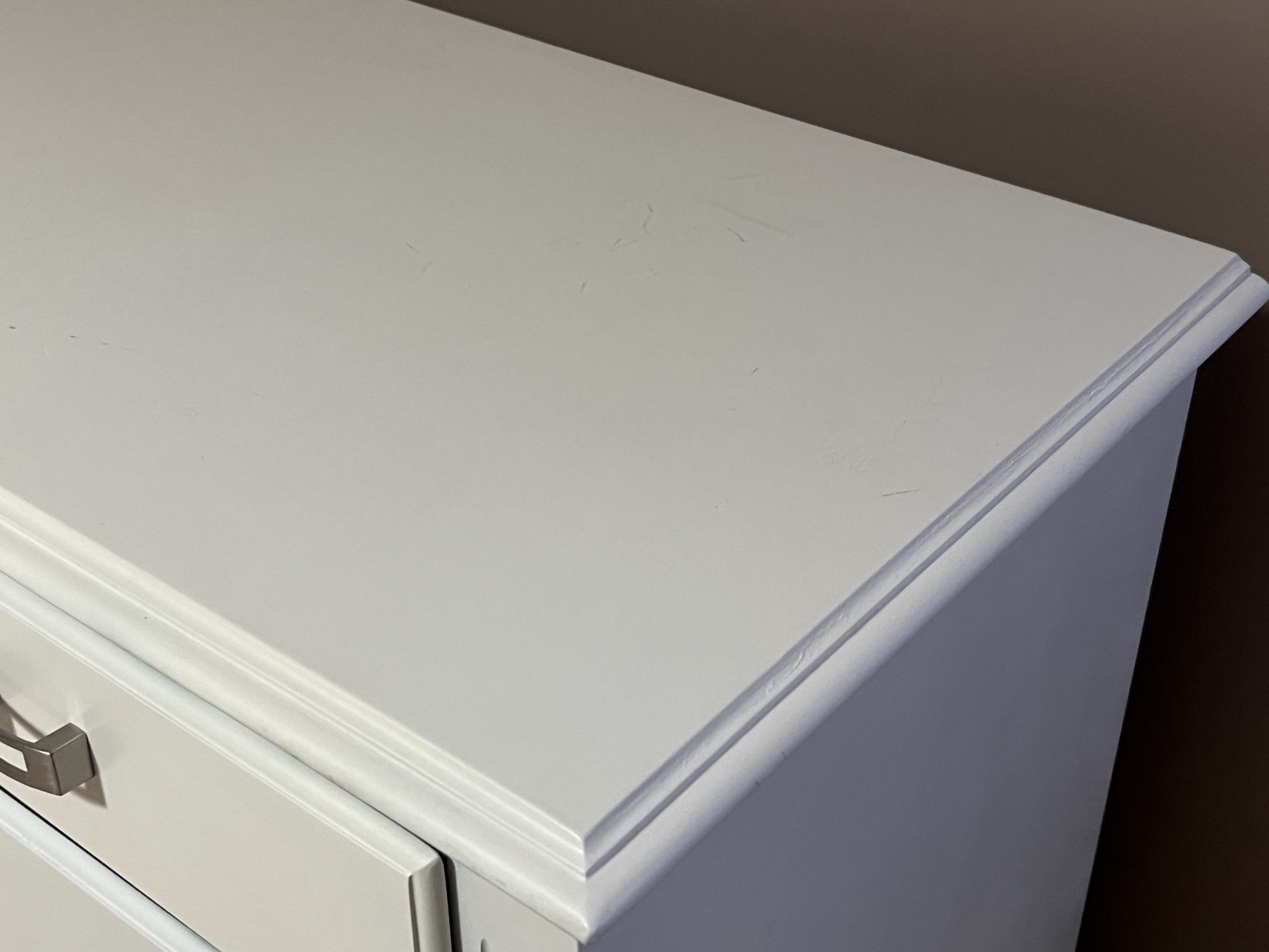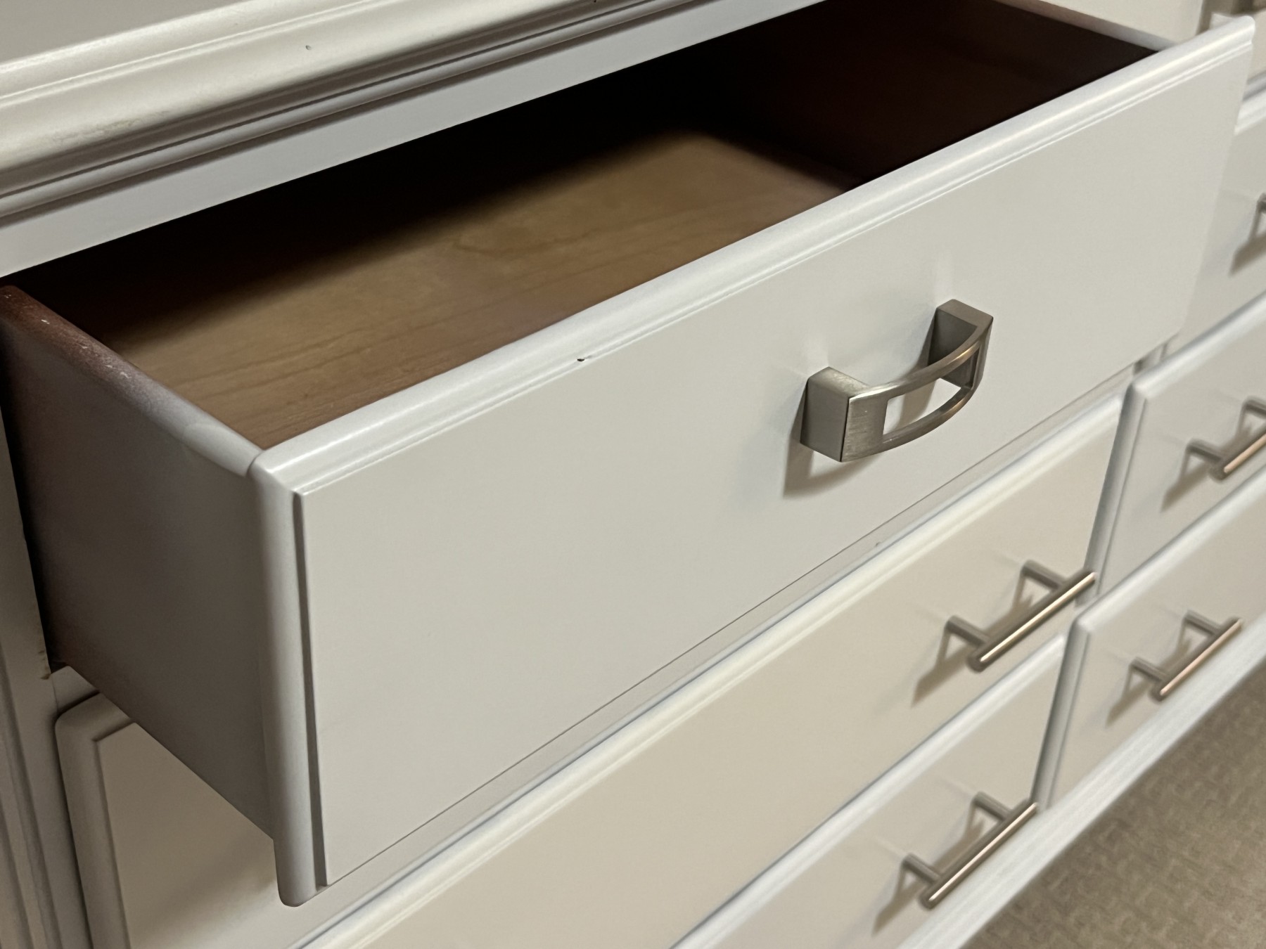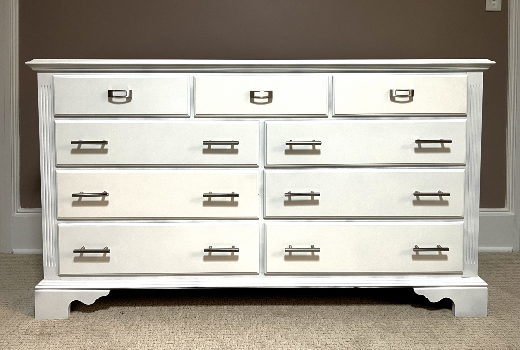 Knob Creek long dresser with three short drawers over 6 long drawers with complementing nickel plated hardware and the whole resting on bracket feet. The dresser has been spray painted in a white finish that prints well.
