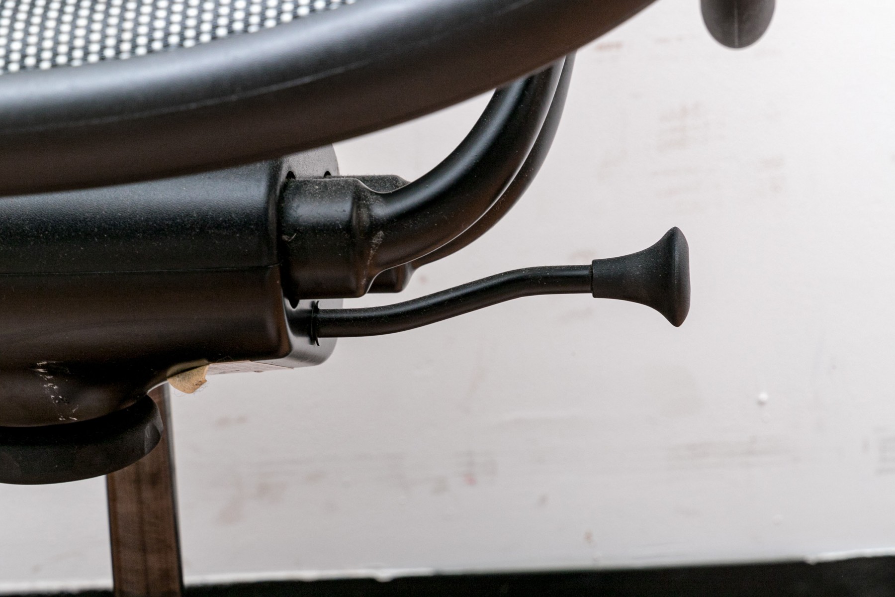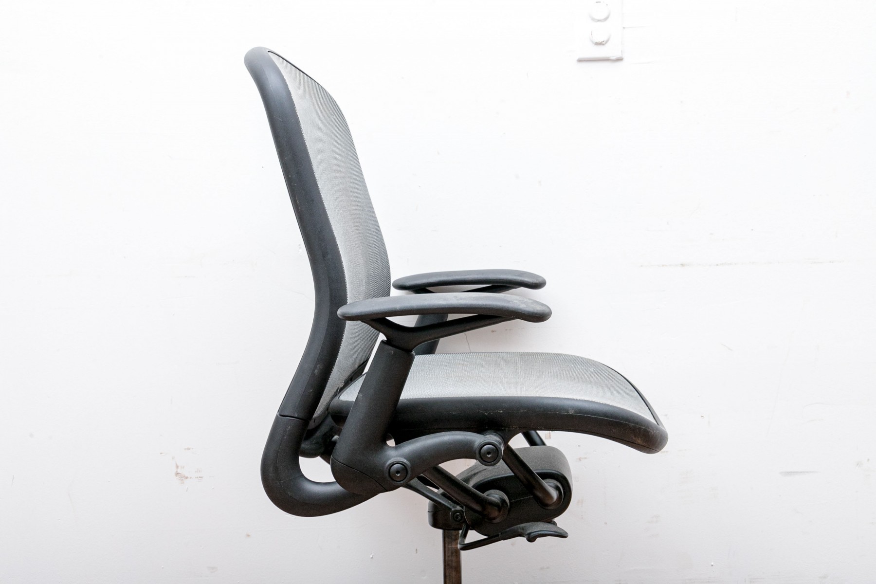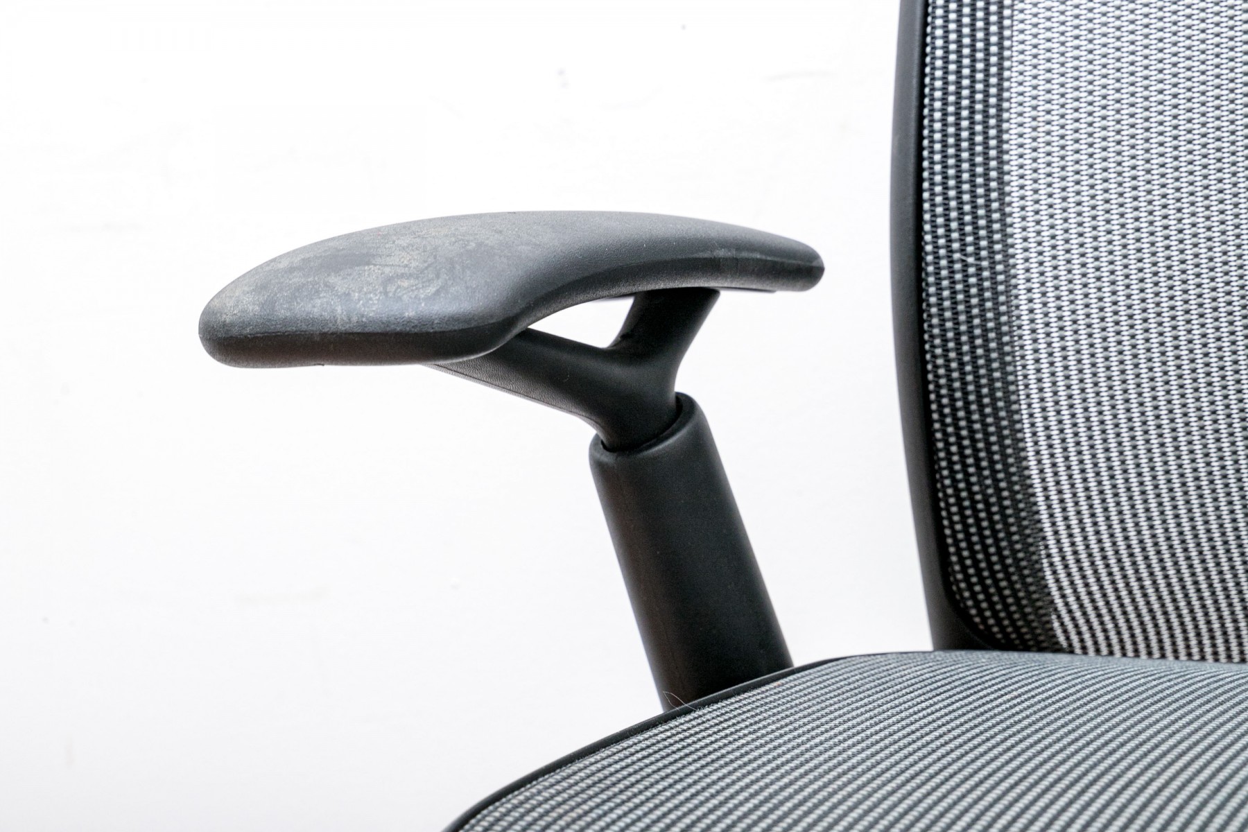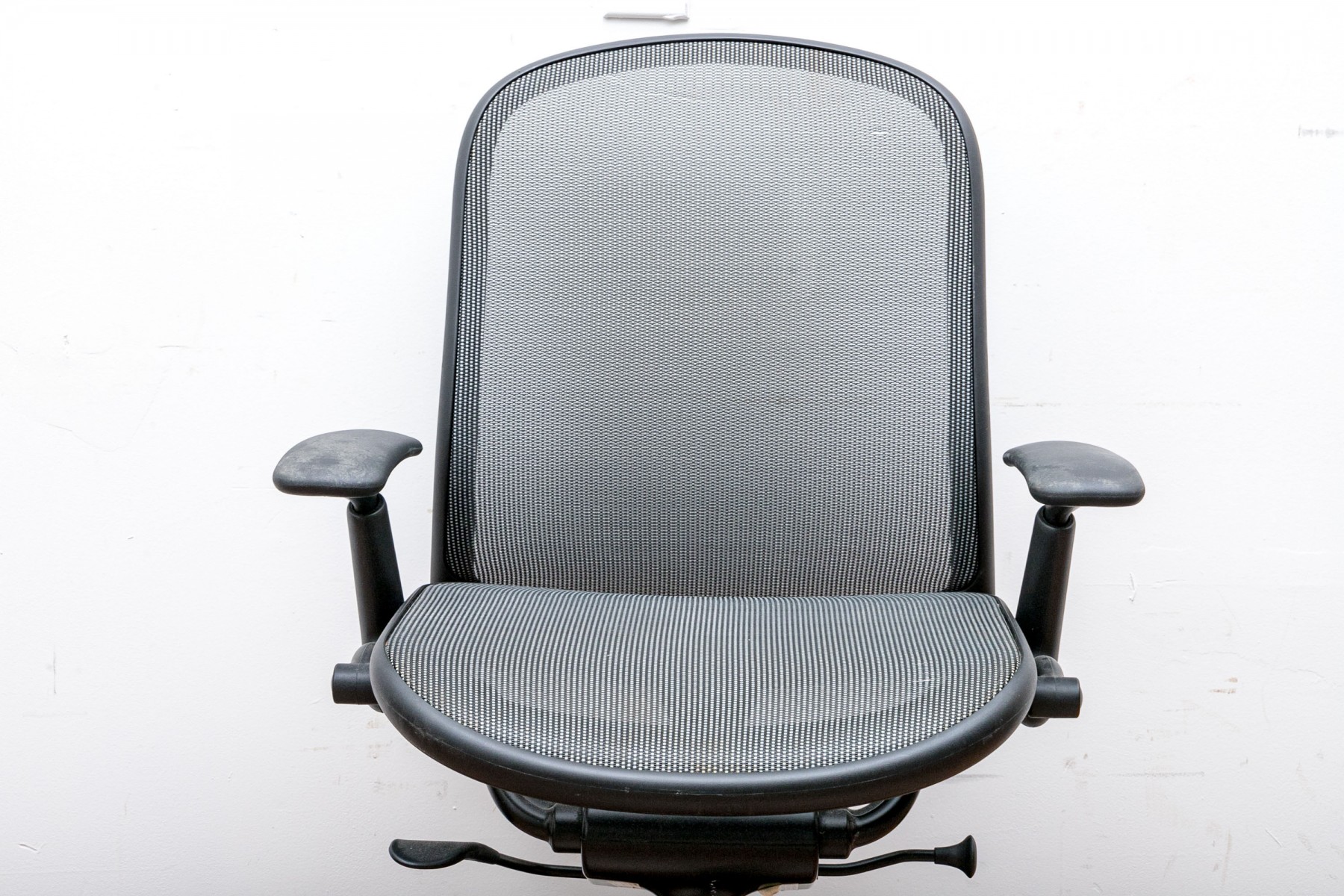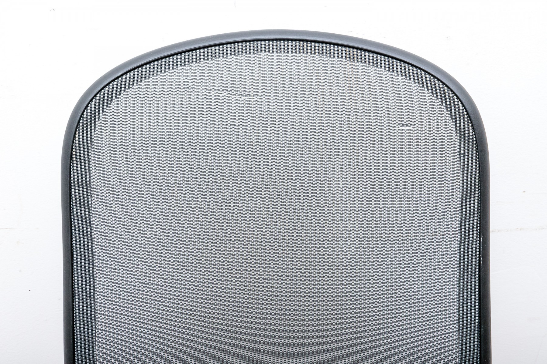 A Knoll swivel office chair in black mesh. Makers mark on the underside.