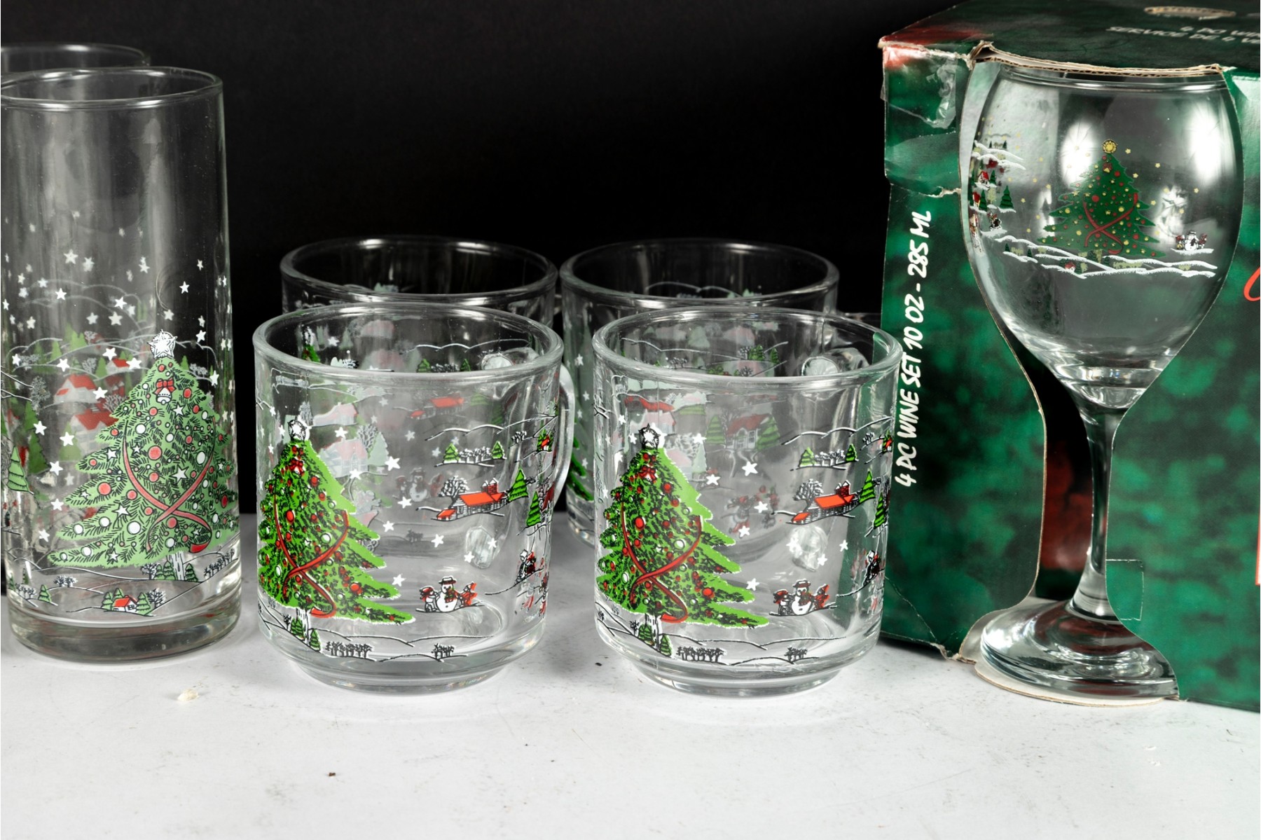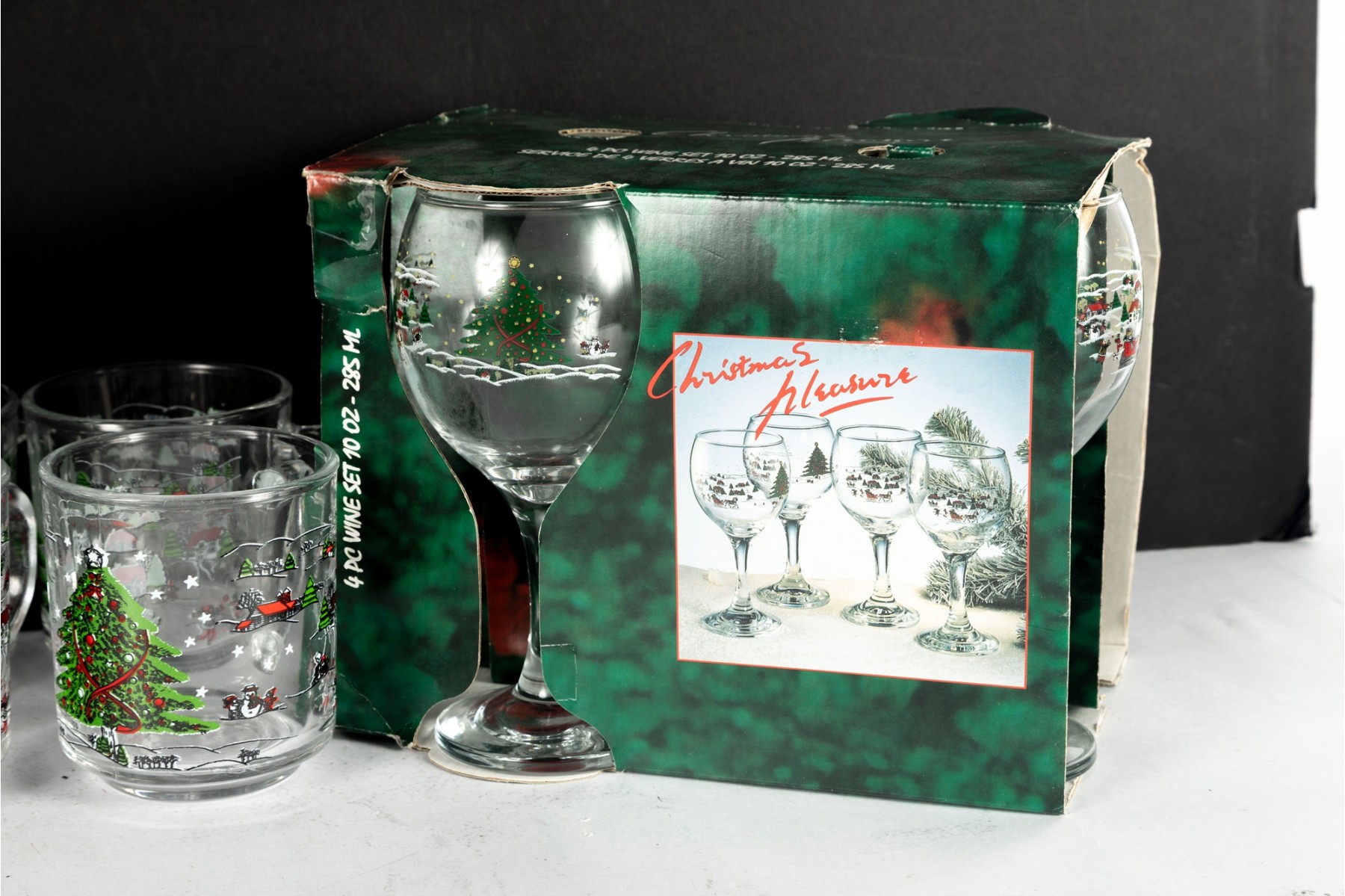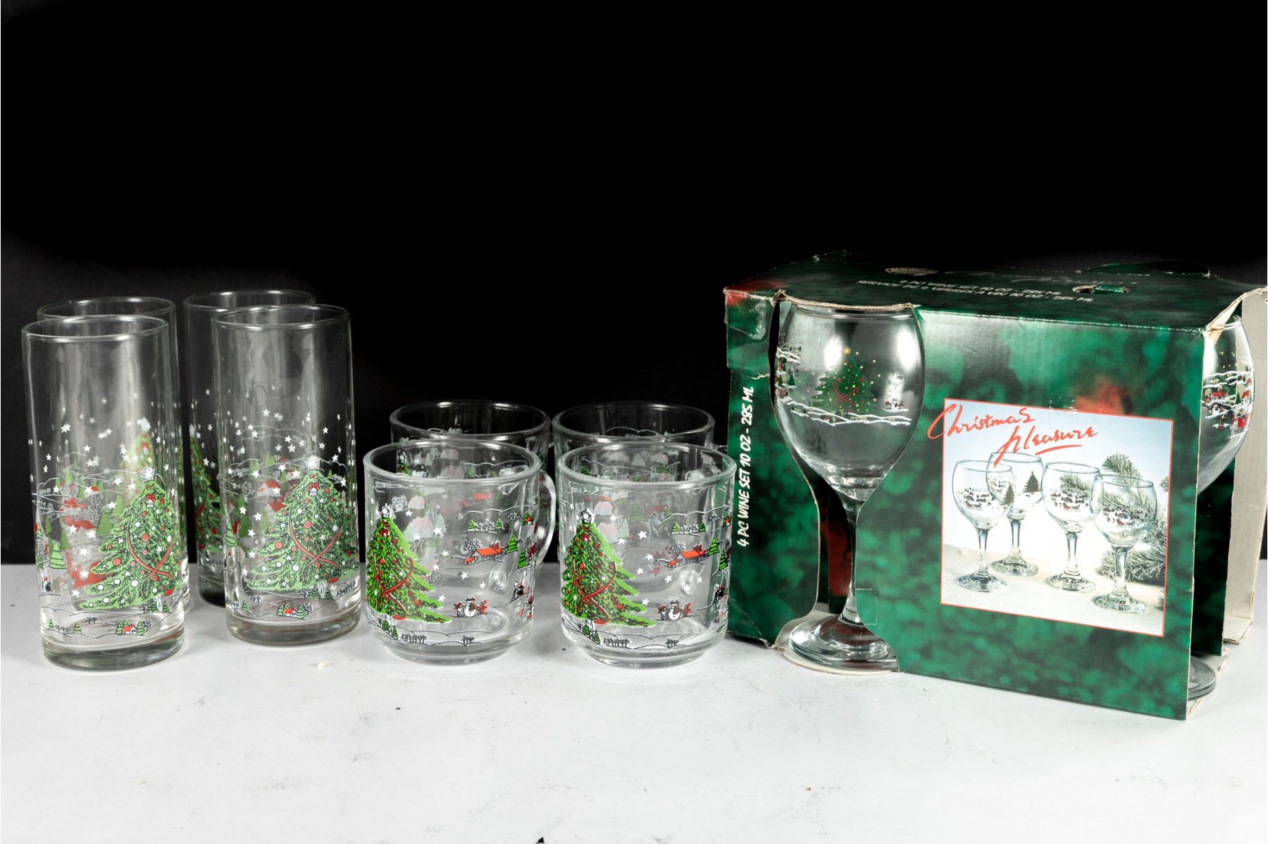 Festive holiday glassware set featuring the “Christmas Pleasure” pattern with a decorated Christmas tree and sleigh scene. Includes tall drinking glasses, short tumblers, and a boxed wine glass set.