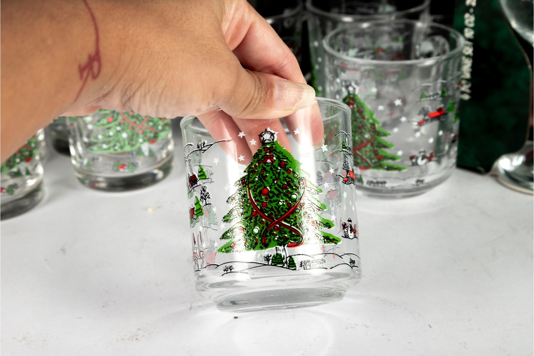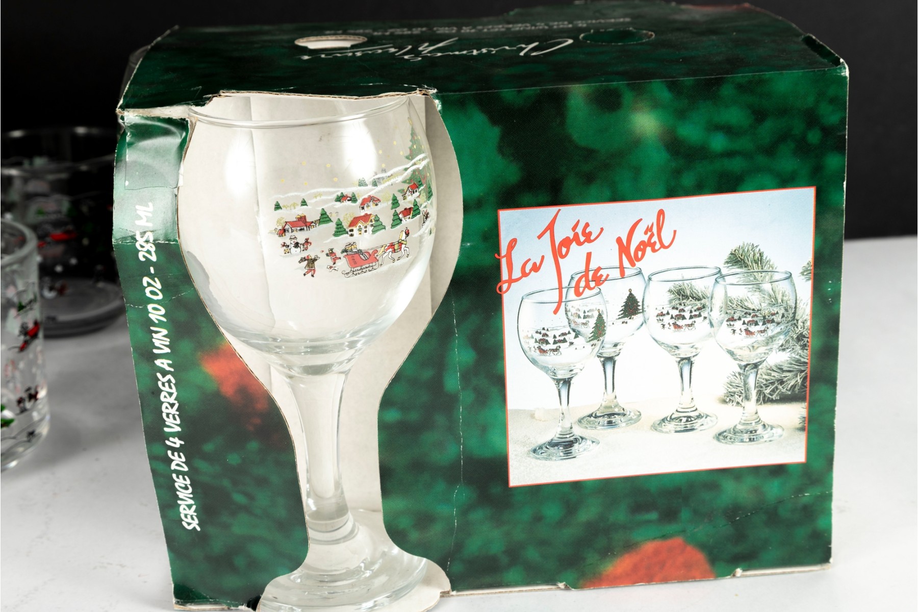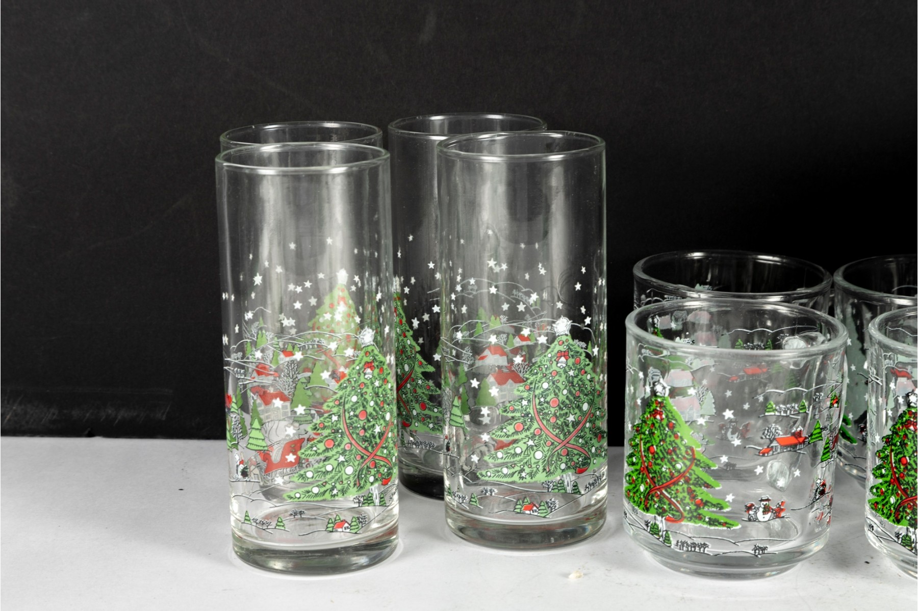 Festive holiday glassware set featuring the “Christmas Pleasure” pattern with a decorated Christmas tree and sleigh scene. Includes tall drinking glasses, short tumblers, and a boxed wine glass set.