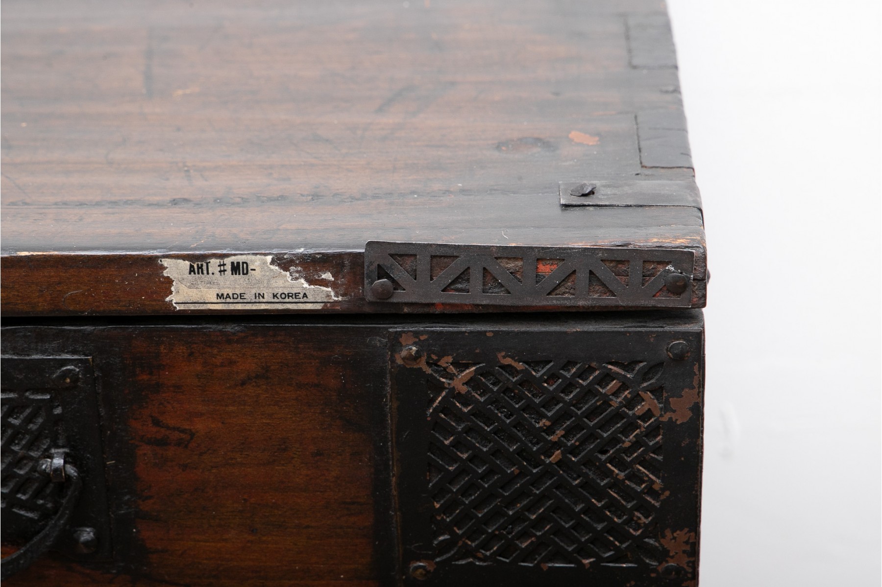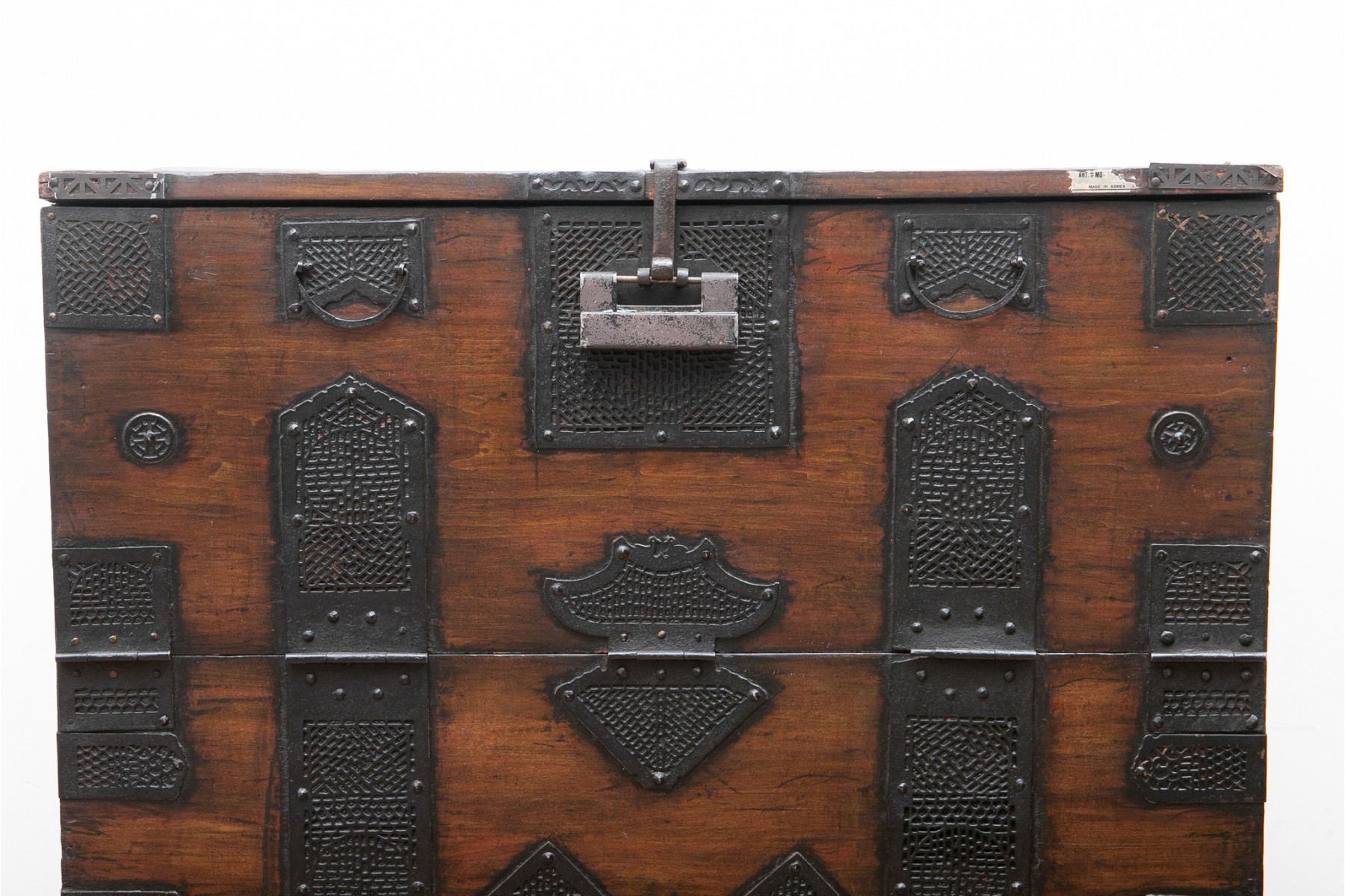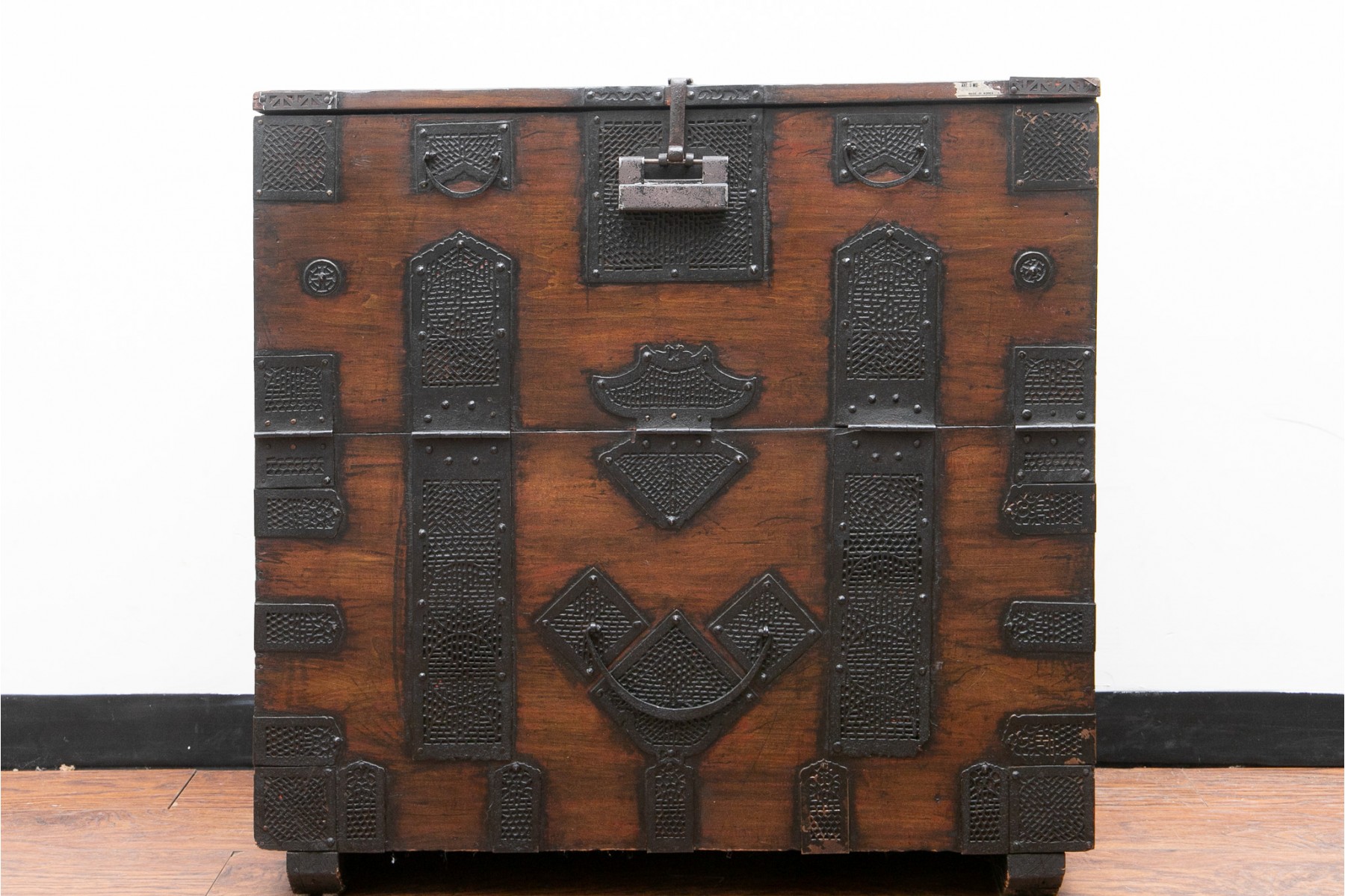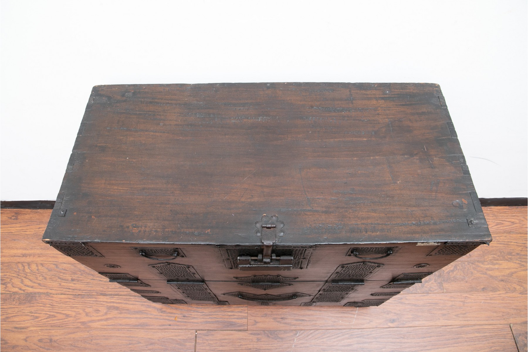 A Korean bandaji chest in a gorgeous dark brown finish, accented with black metal plaques detailed with pierced geometric patterns. The chest opens with a hinged half-front, supported by bracket feet.