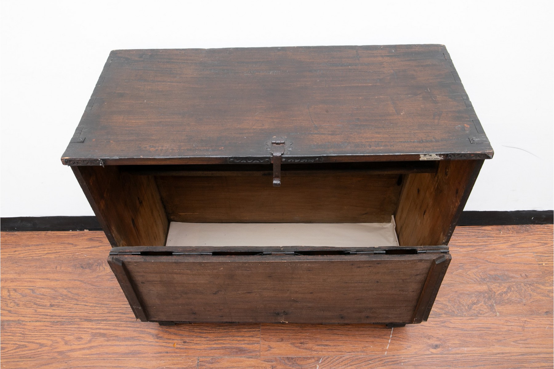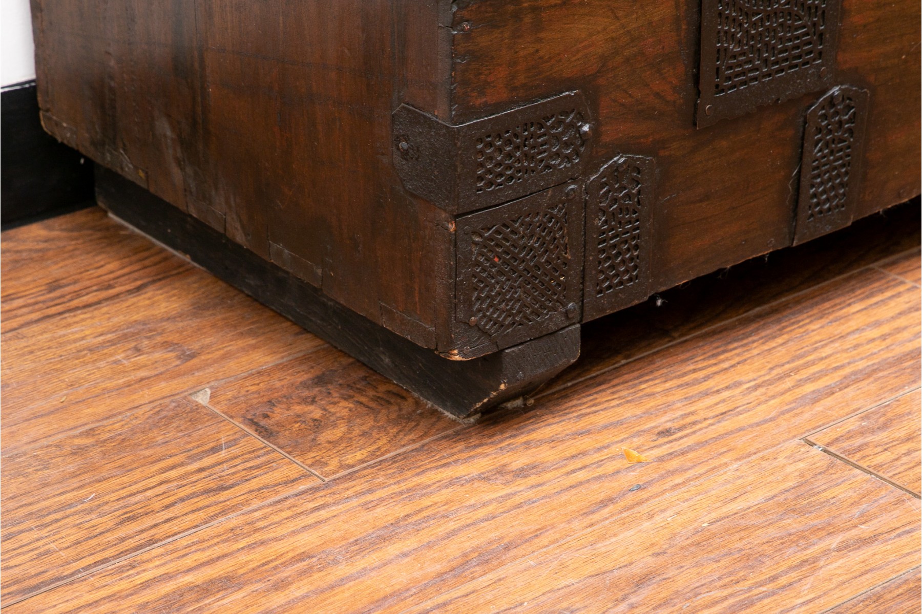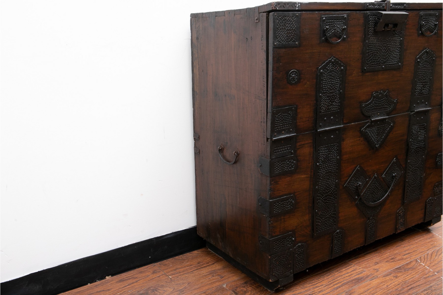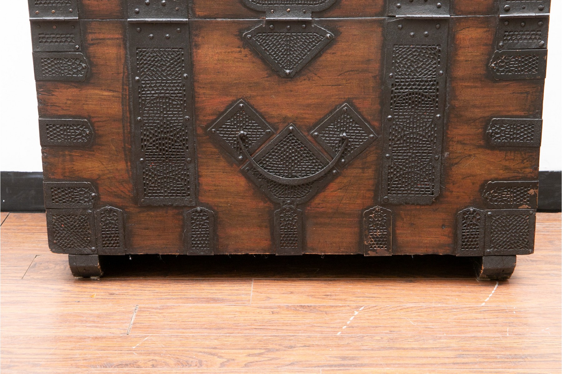 A Korean bandaji chest in a gorgeous dark brown finish, accented with black metal plaques detailed with pierced geometric patterns. The chest opens with a hinged half-front, supported by bracket feet.