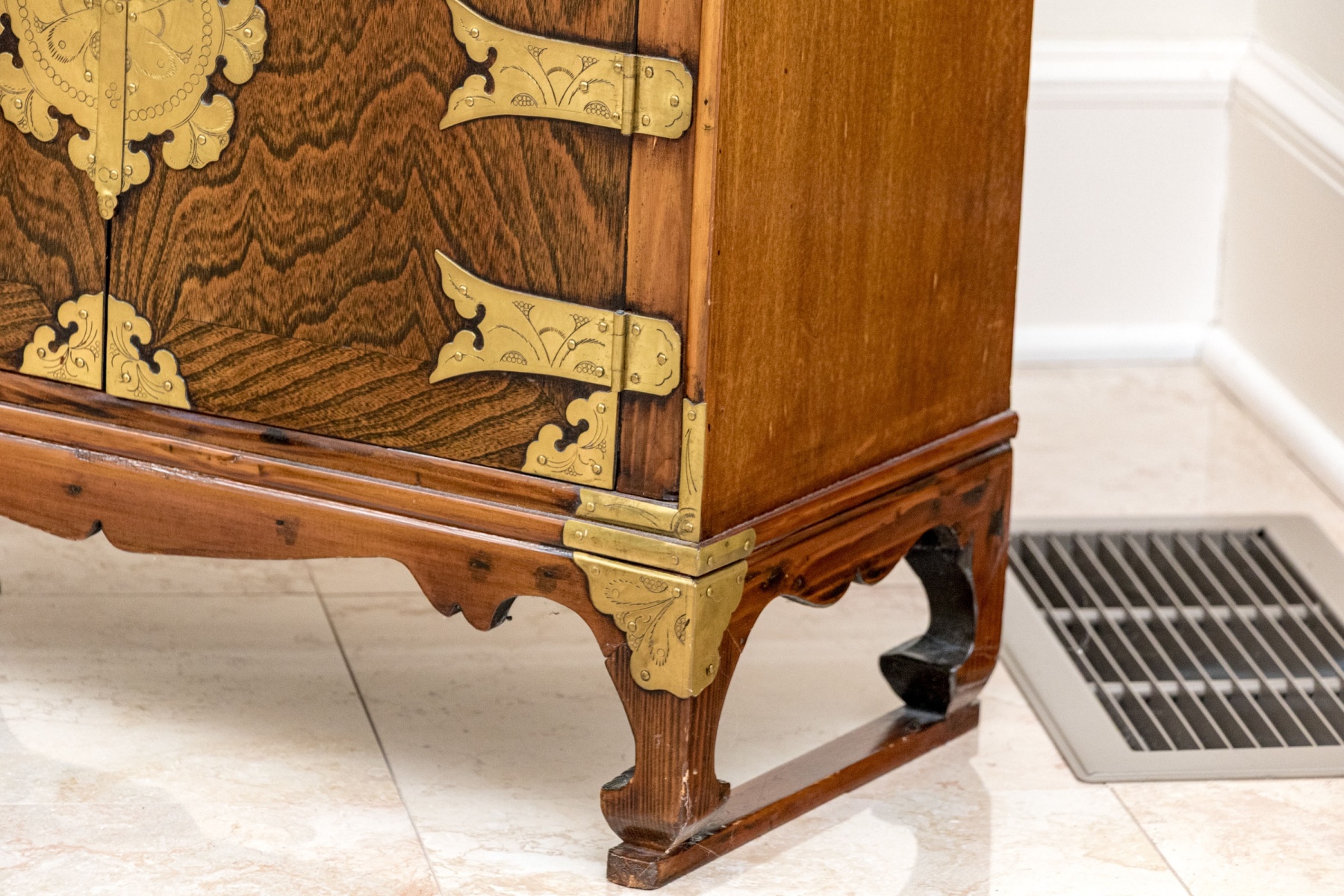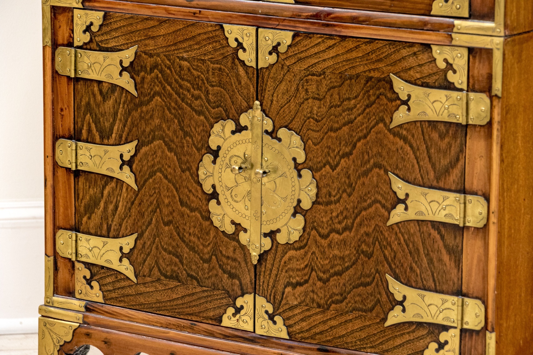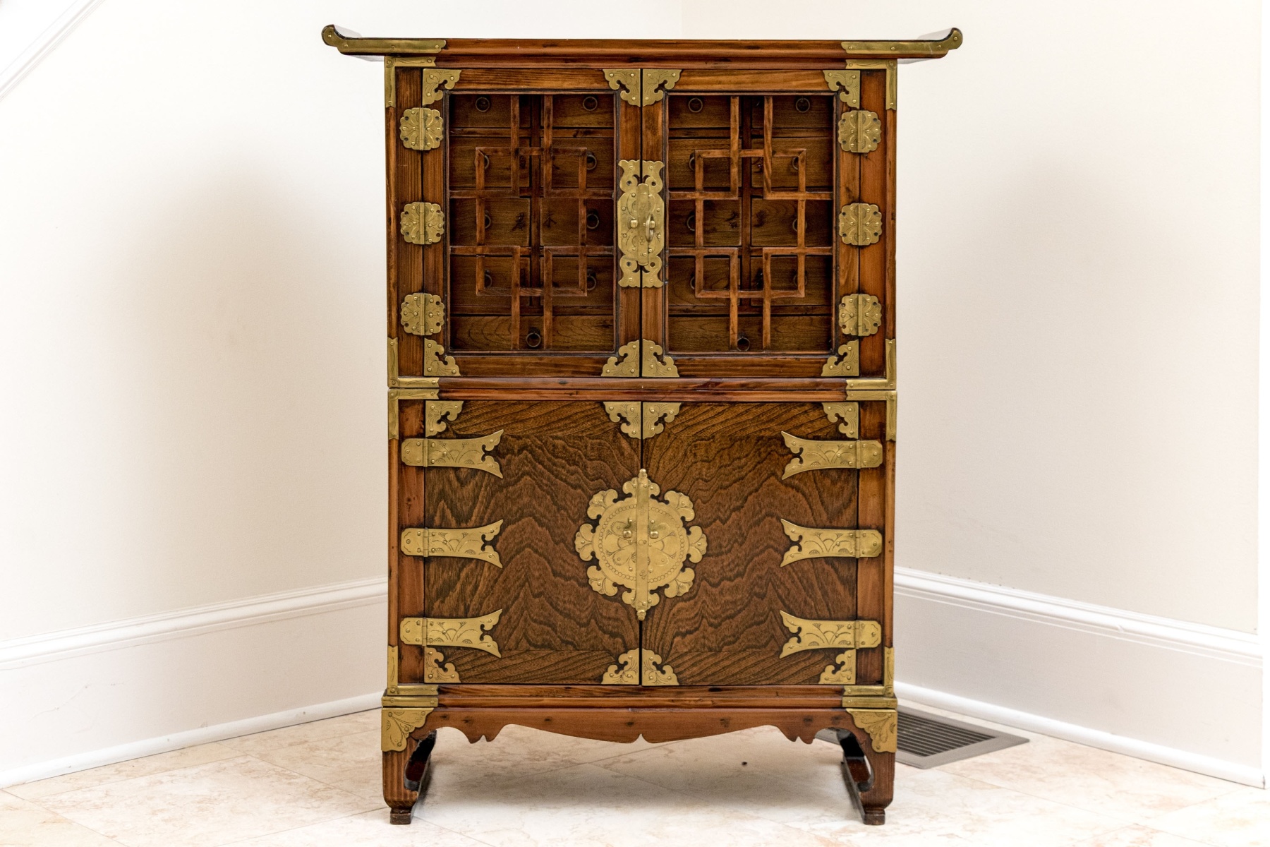 A gorgeous Korean apothecary cabinet well crafted in rich, warm-toned medium brown rosewood. The table top features an upturned pagoda form overhanging a pair of upper openwork hinged doors revealing interior apothecary cabinets and a lower pair of hinged doors opening to storage and all on its stand with brass hardware.