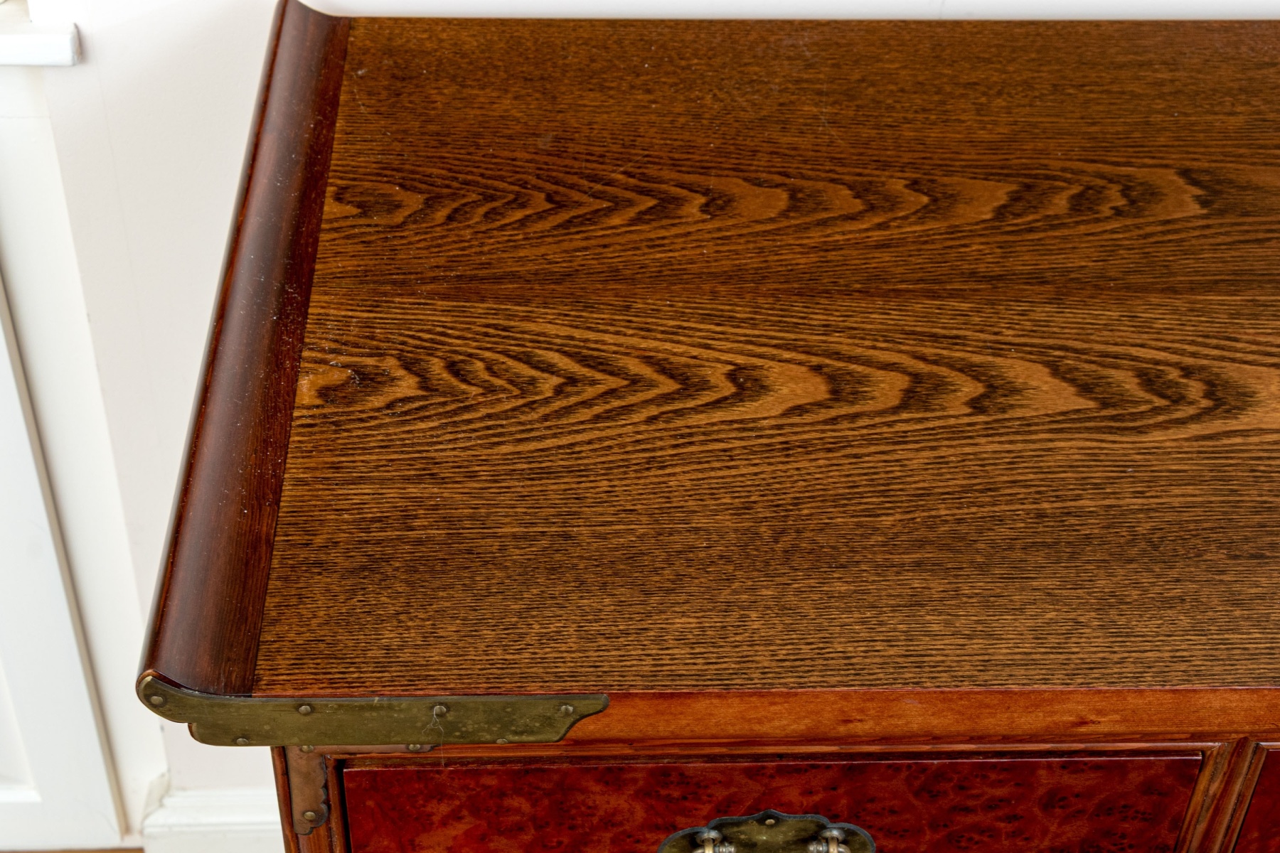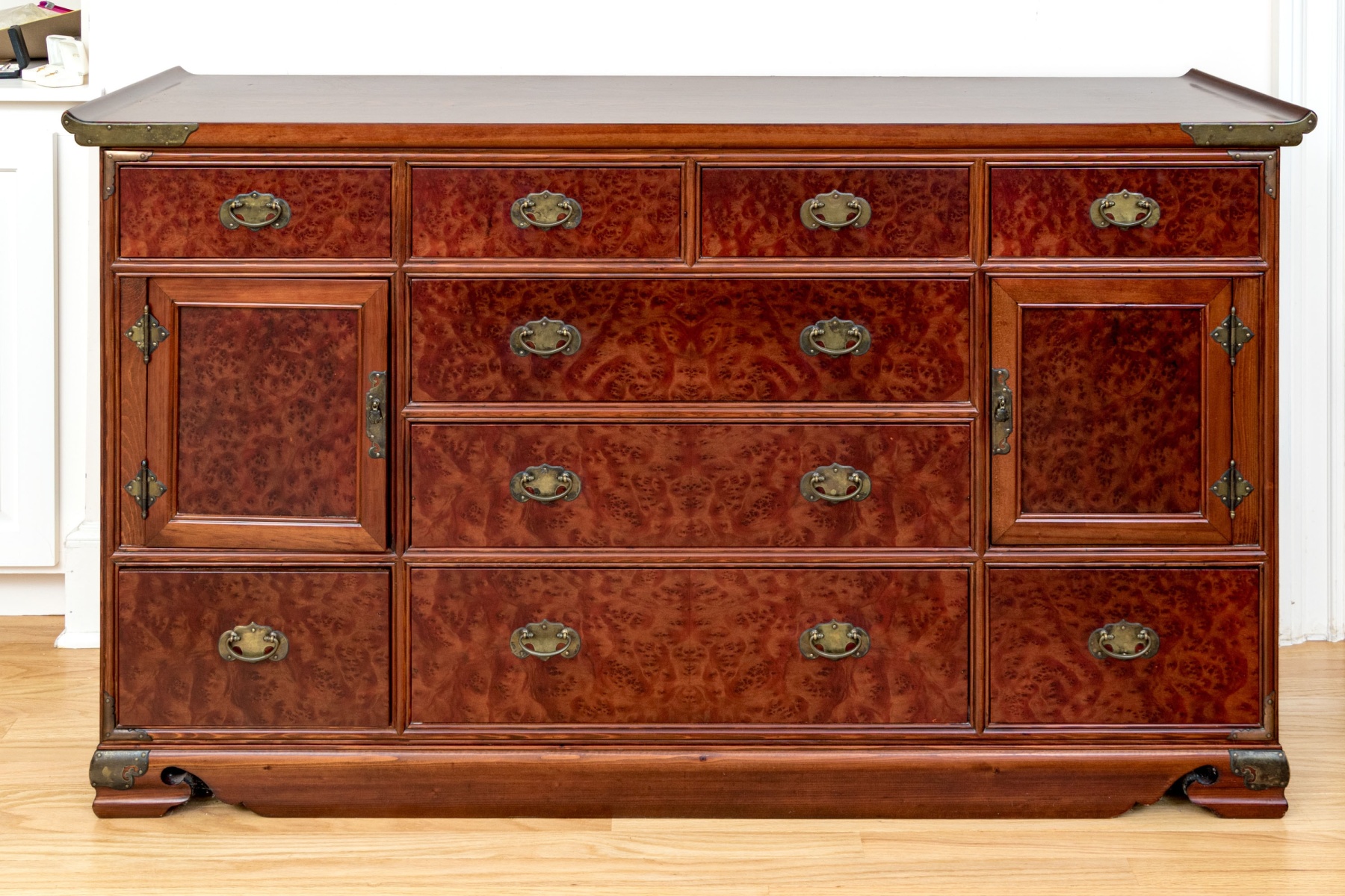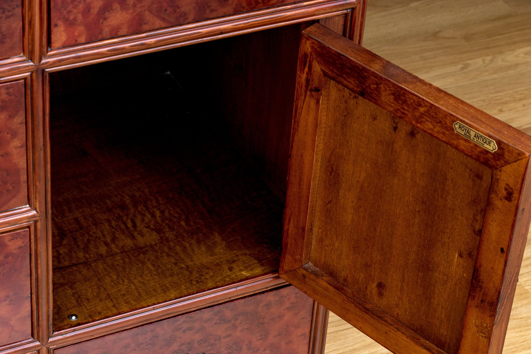 A fabulous vintage Royal Antique dresser chest with great chinoiserie appeal, well crafted with stunning red-brown birdseye maple veneers. The dresser features a pagoda form tabletop on four short feet with central bay of three long drawer and a pair of short drawers, flanked by short drawers over cabinet doors and short drawers below to the ends. All with brass hardware including lingzhi form swing pulls to some drawers.