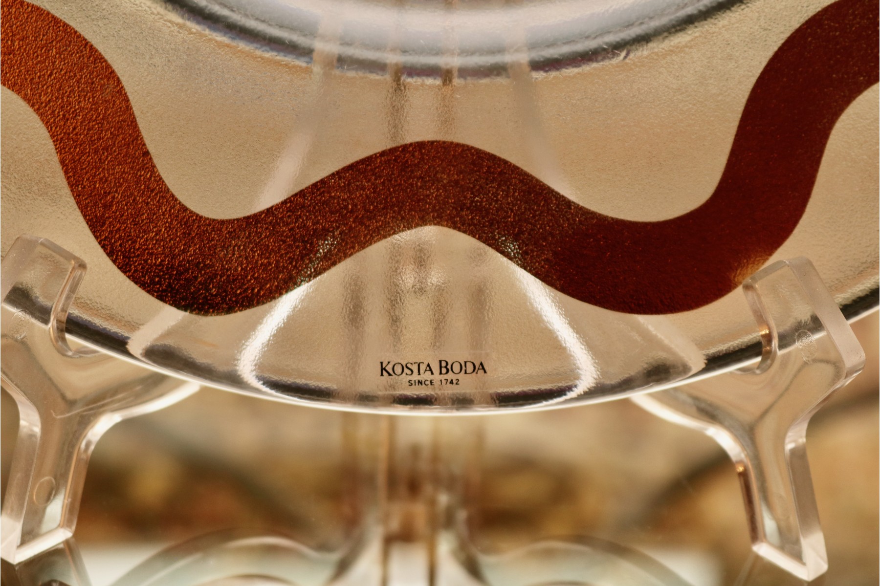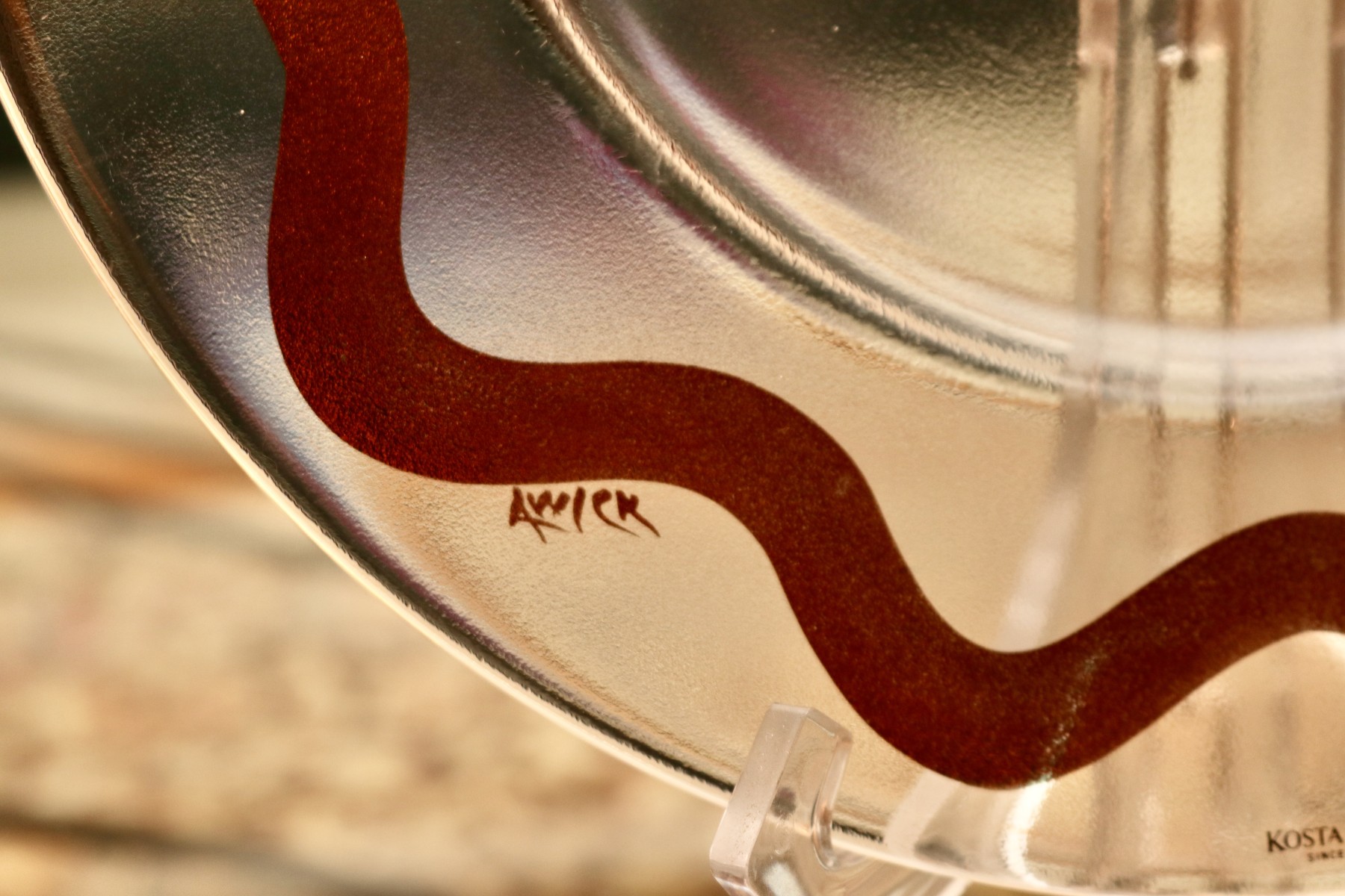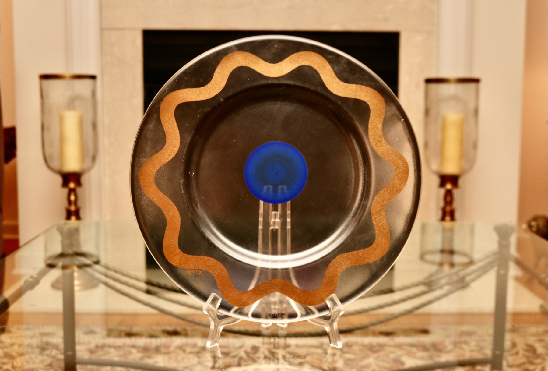 A bold and collectible piece from the renowned Swedish glassworks Kosta Boda, this decorative glass plate was designed by Ann Wärff as part of her celebrated “Cosmos” series. The design features a clear textured glass body with a vibrant royal blue center dot and a striking wavy gold rim, creating a dynamic contrast of color and form. Known for her modern, geometric approach to glass artistry, Wärff’s work reflects Scandinavian minimalism elevated by expressive detailing.