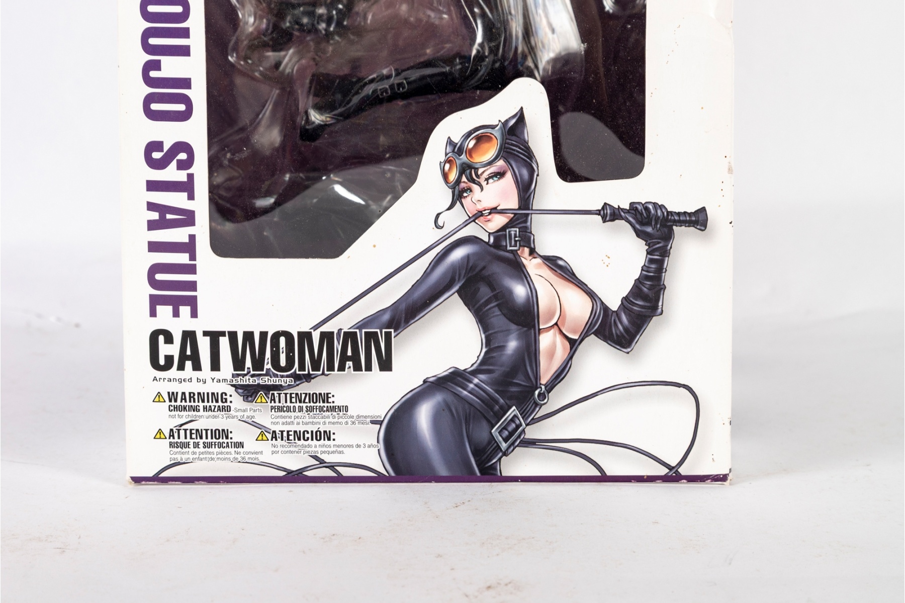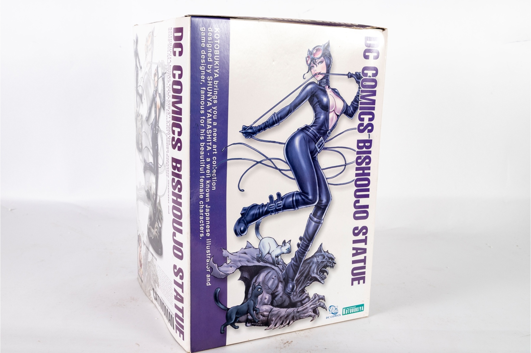 From Kotobukiya’s acclaimed DC Comics Bishoujo Statue line comes this sleek and stylish Catwoman, reimagined by famed Japanese illustrator Shunya Yamashita. The collectible captures Selina Kyle in her signature black catsuit, posed playfully with whip in hand and accompanied by her mischievous feline companion.