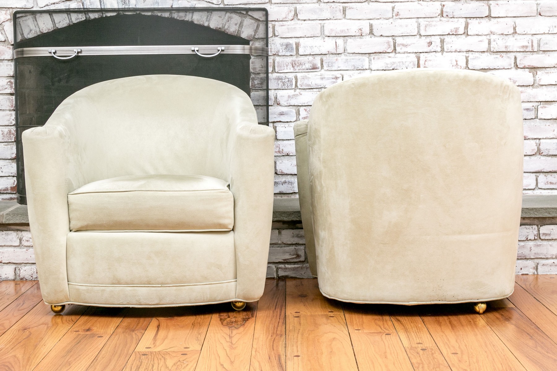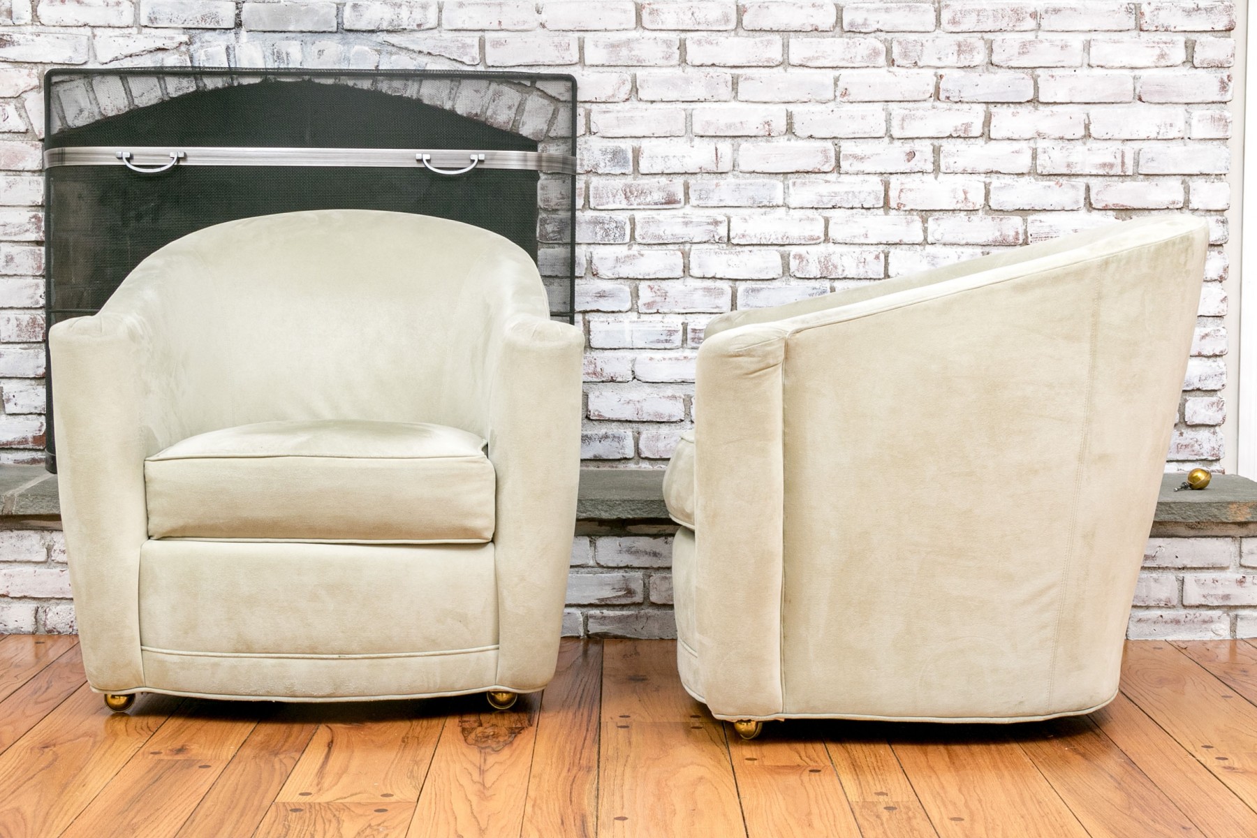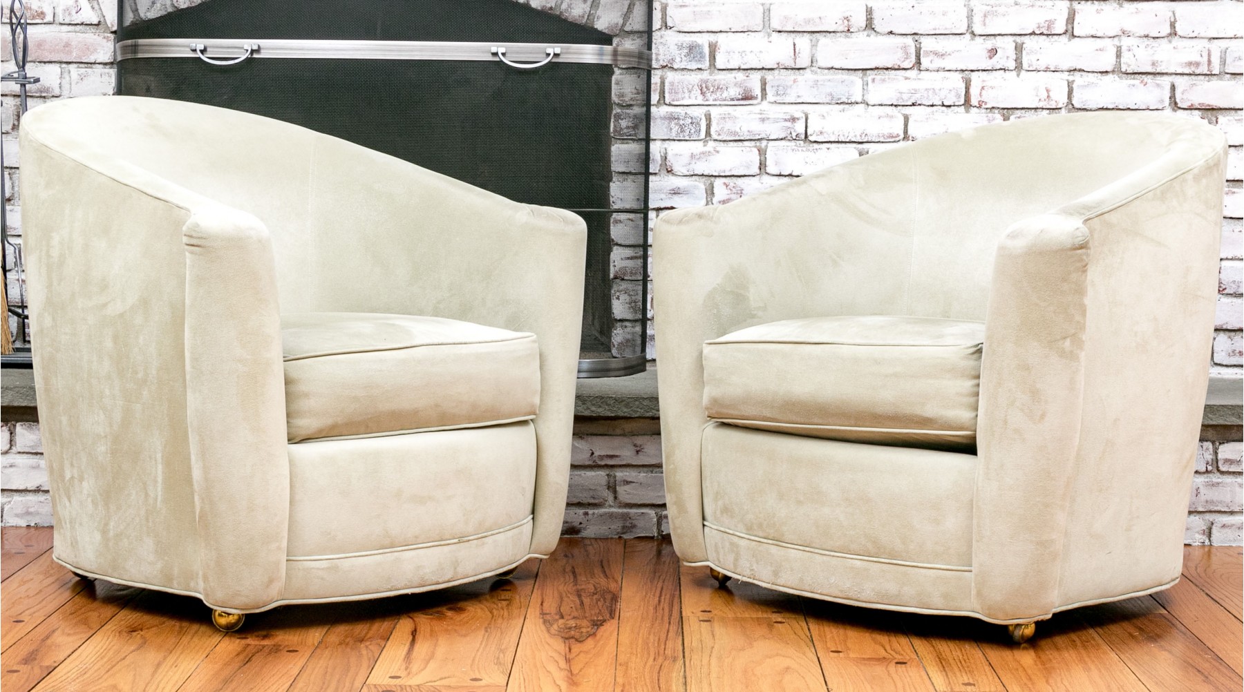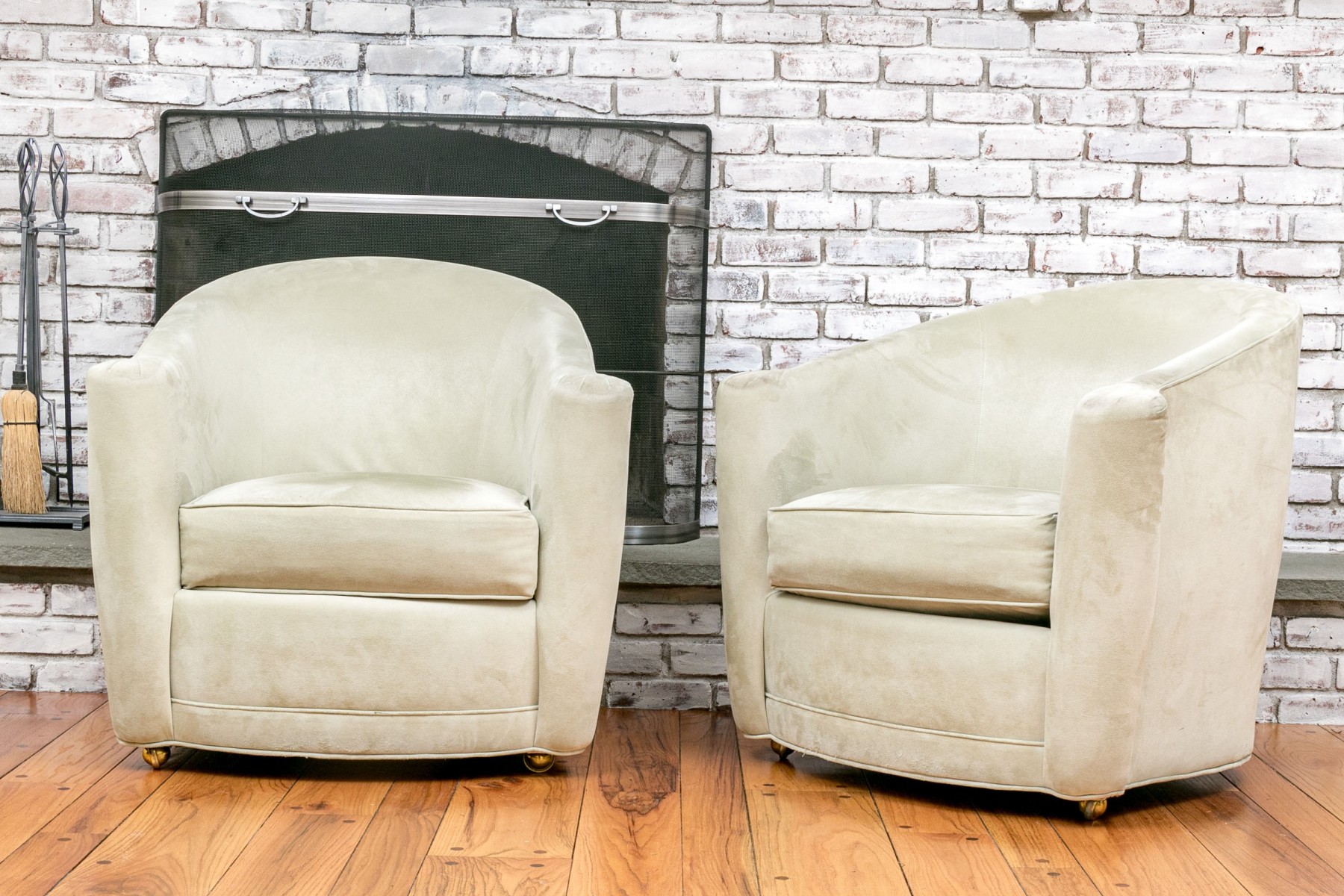 Kravet furniture presents these comfortable and stylish tub-style chairs on casters. With their rounded tub backs, outward-flaring rolled arms, loose seat cushions, and caster feet, these chairs offer both mobility and elegance, making them a versatile addition to your living space.
