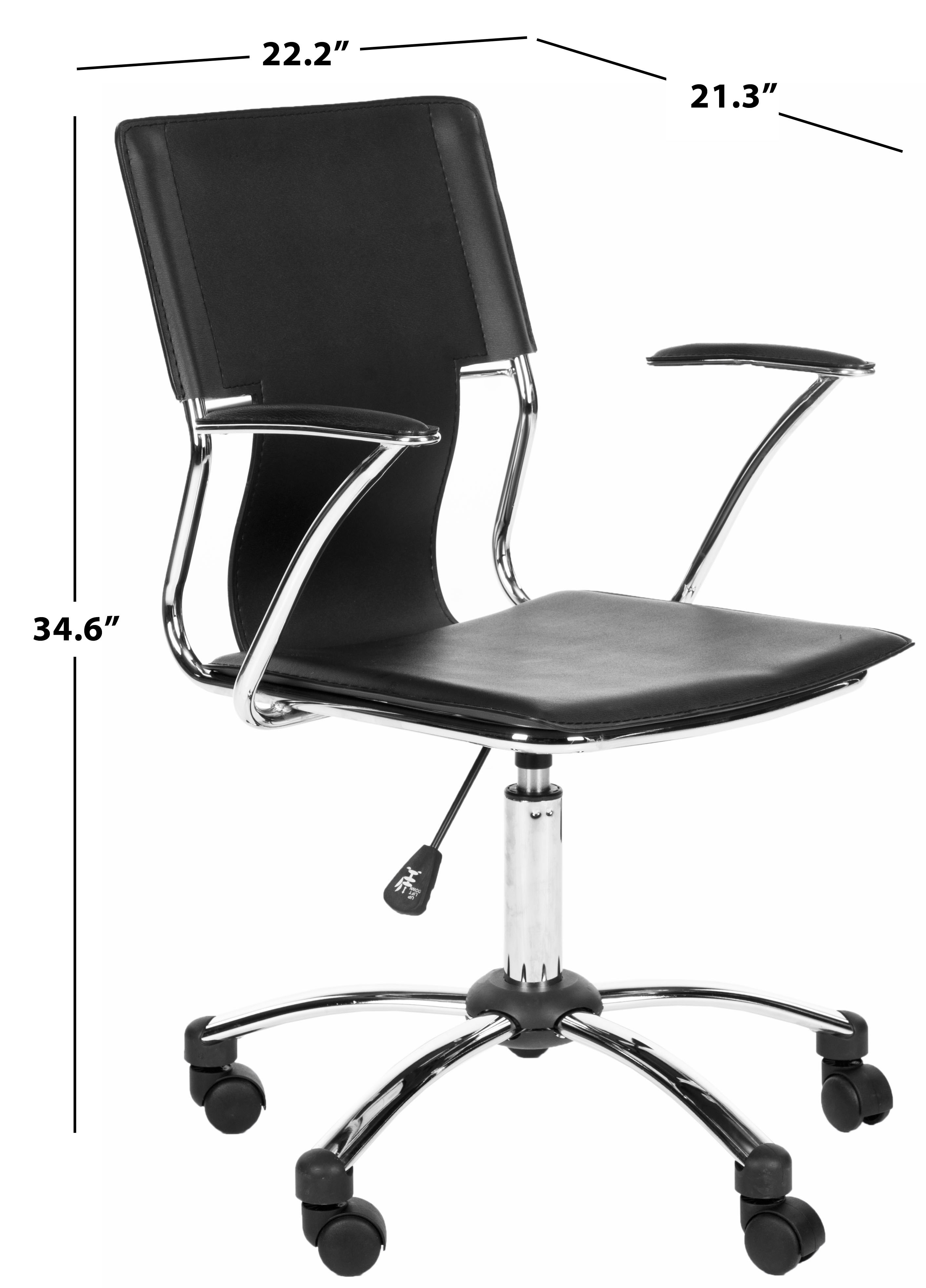 The adjustable Kyler Desk Chair is a posh postmodern spin on the modern office chair. Crafted with metal frame, rubber wheels and black PVC leather, its spare lines and graphic form bring the right angle to any meeting.