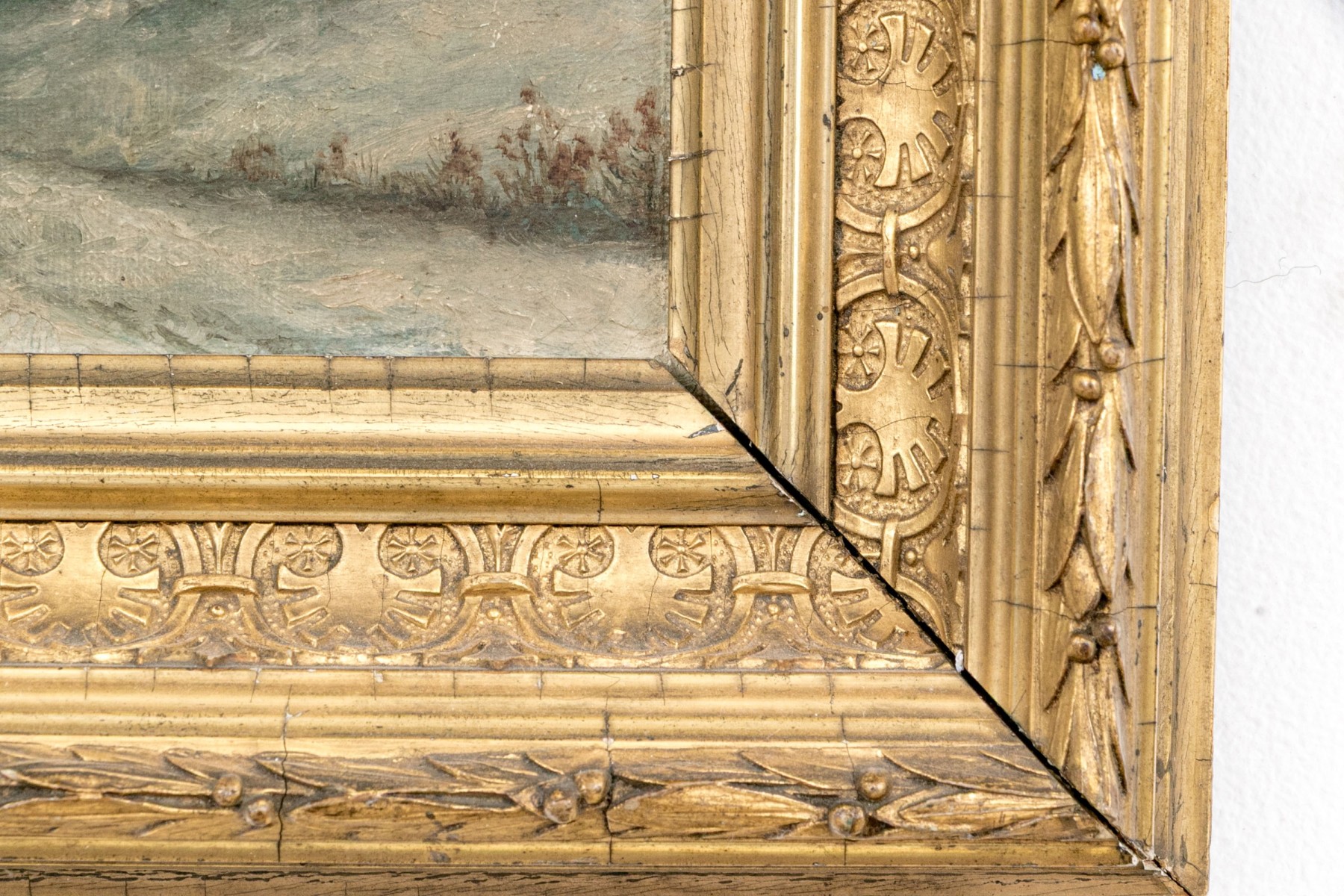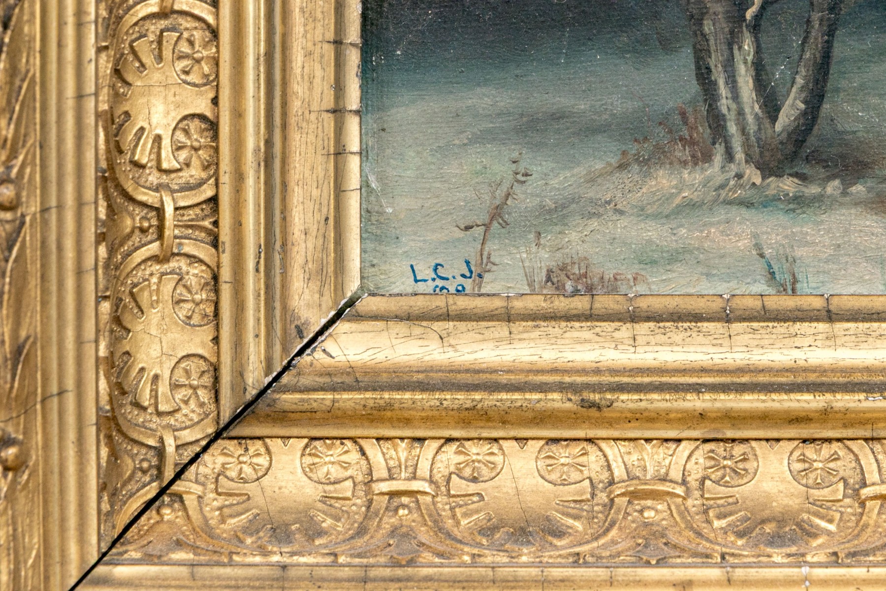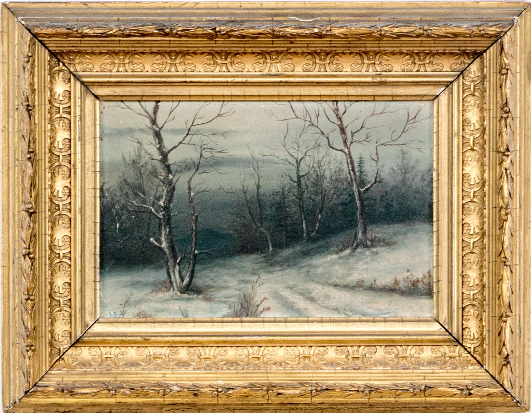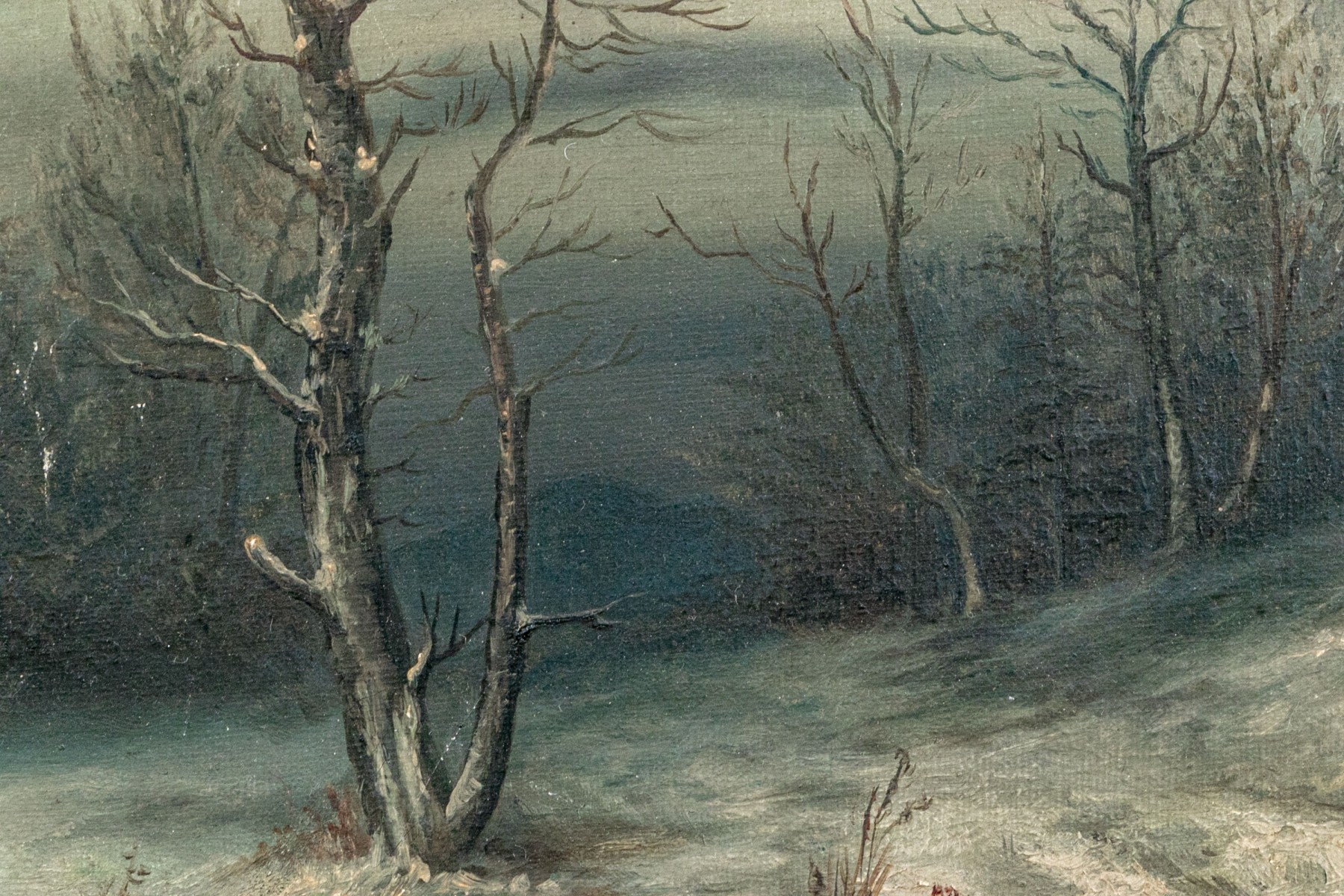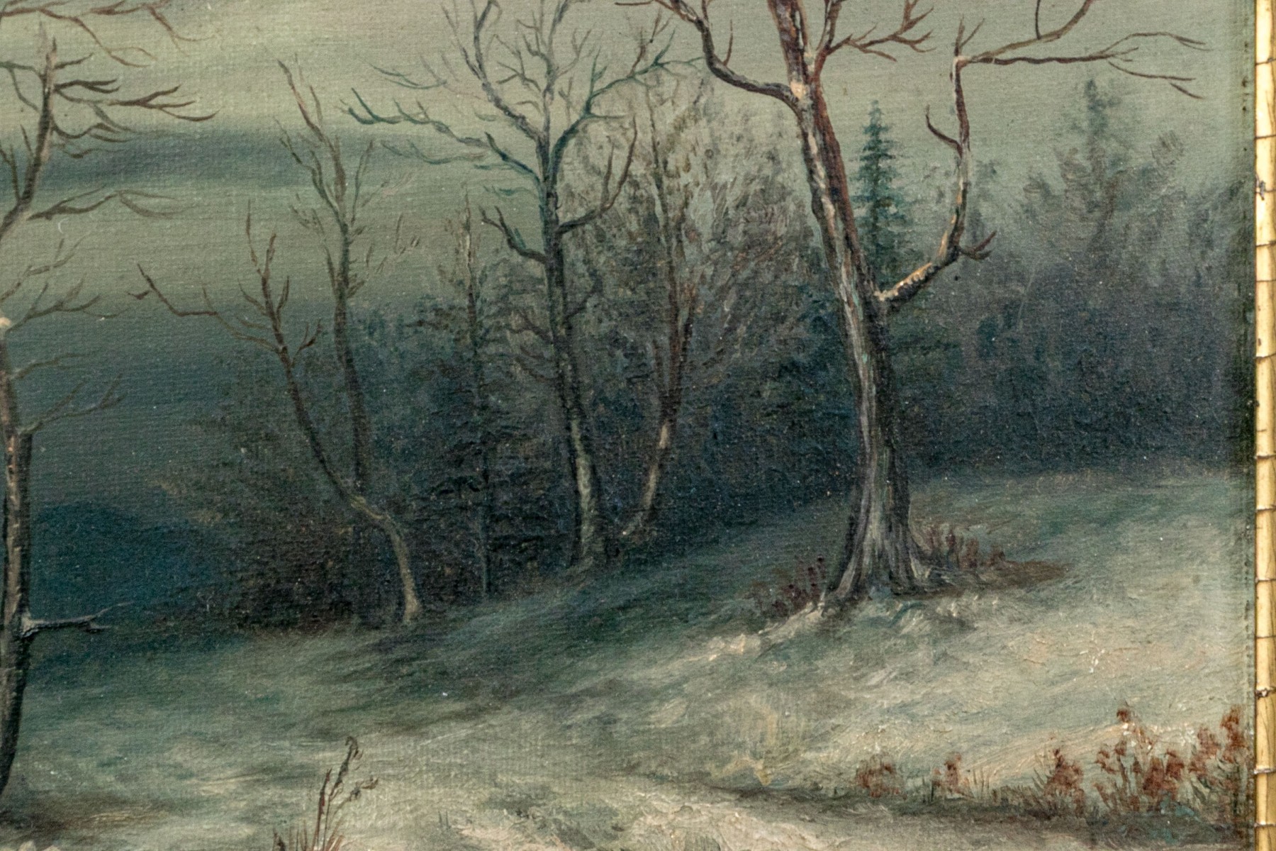 A well rendered oil painting on canvas depicting a winter forest at night, with bare branched trees and pops of subtle red-orange foliage through the snow leading to a dark blue sky on the horizon creating a quiet and foreboding atmosphere. Signed L.C.J. lower left.