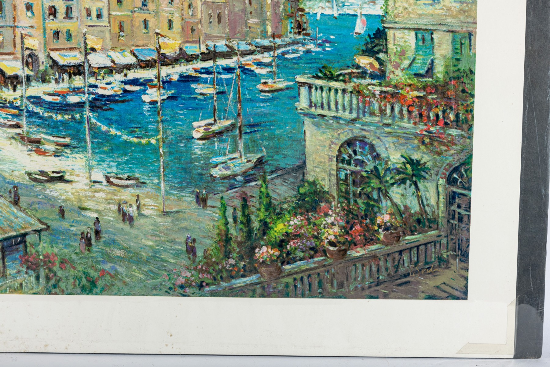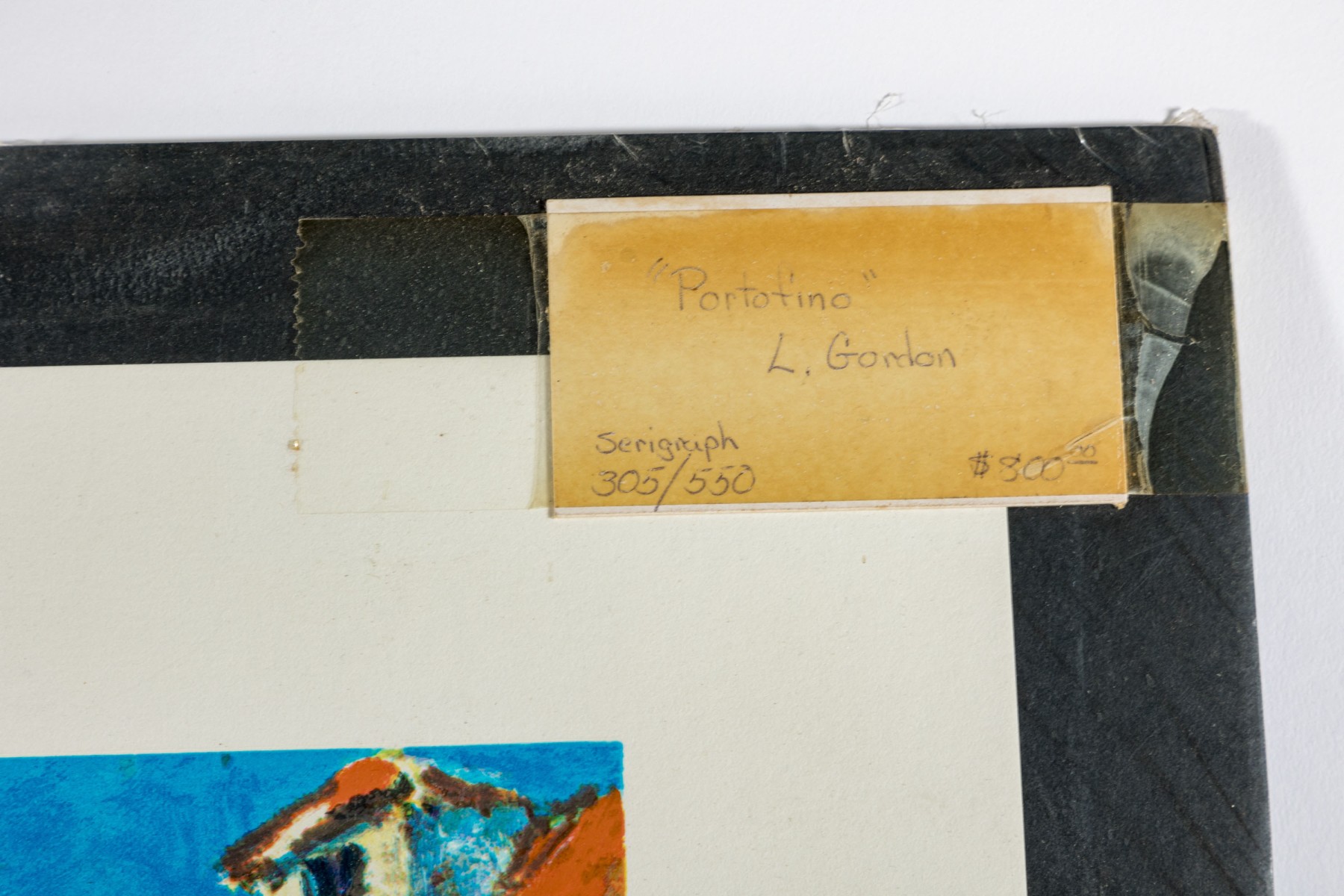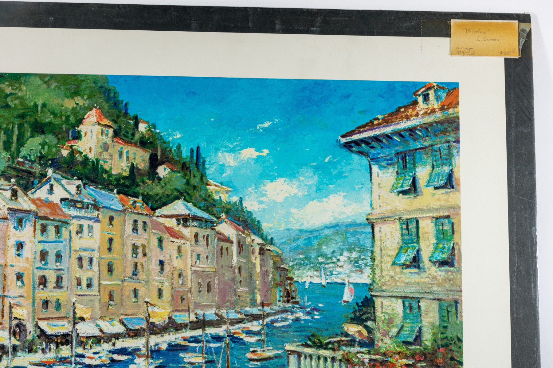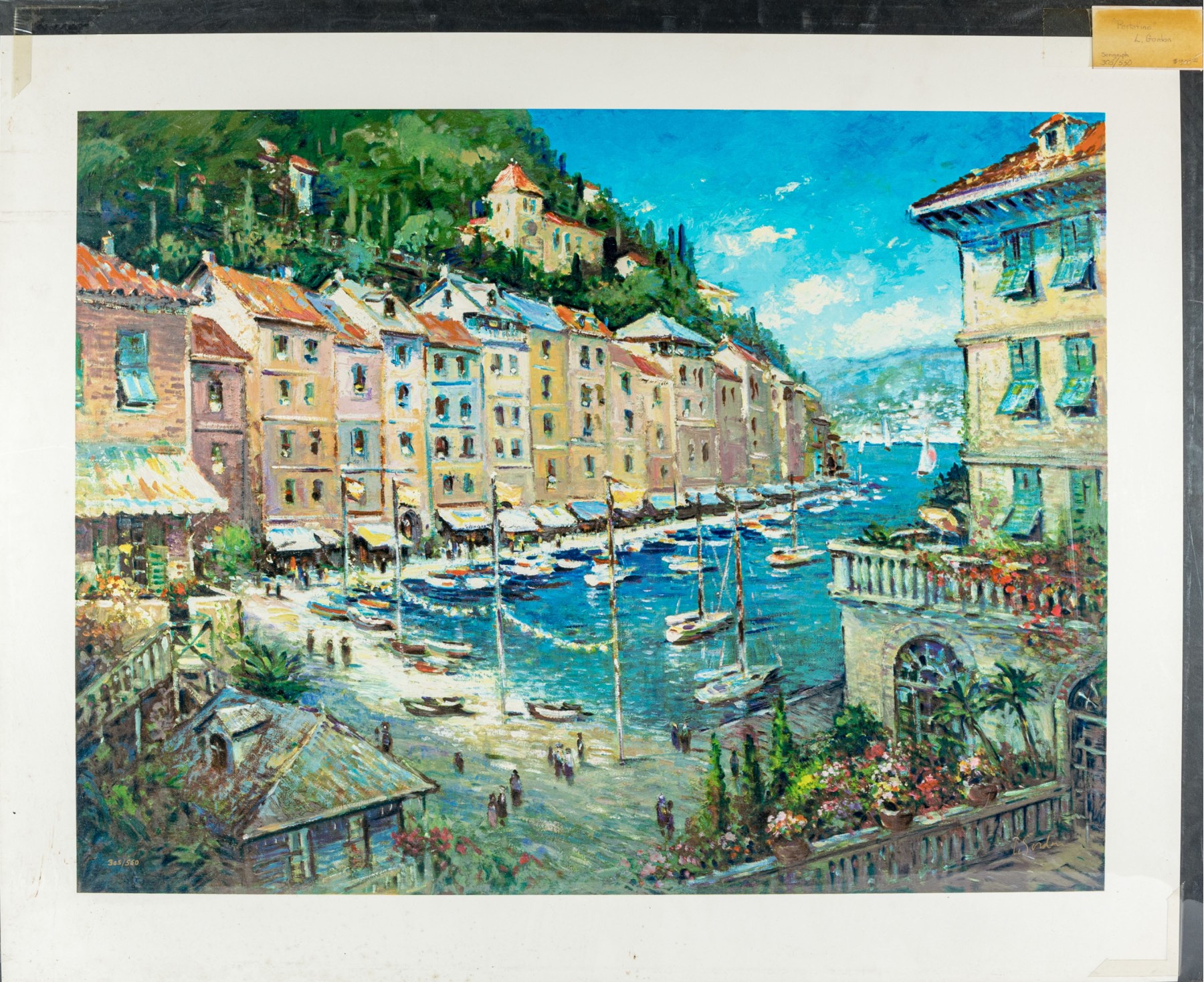 A limited edition serigraph print of impressionist artist L. Gordon's "Portifino", which features a beautiful sightline of Portifino, italy's harbor. Edition 305/550. The print is contained within a protective plastic sleeve.