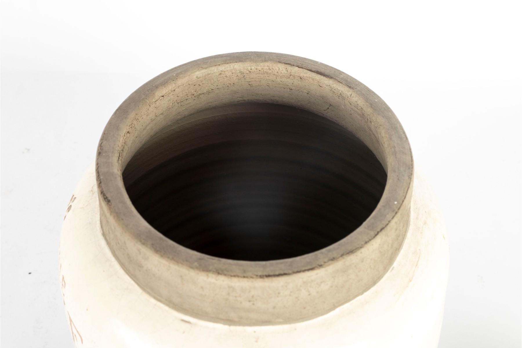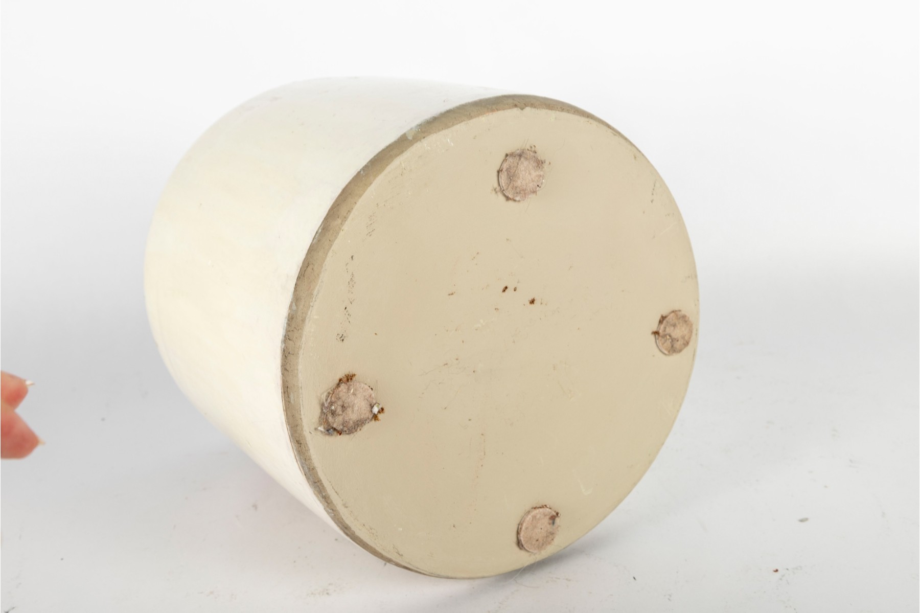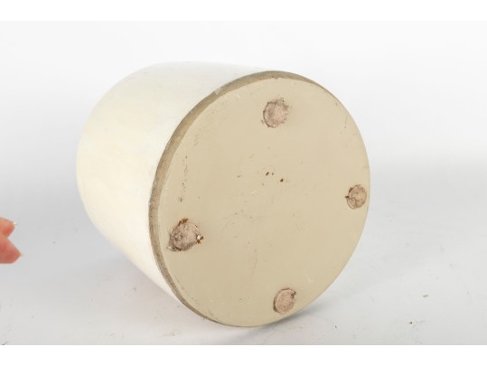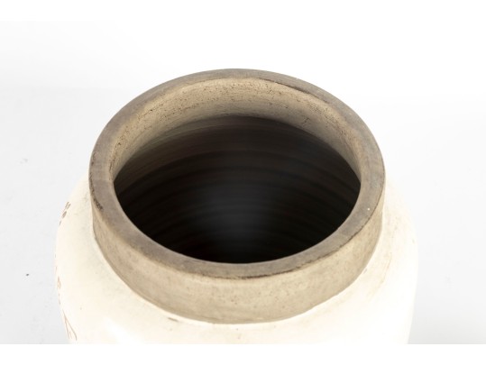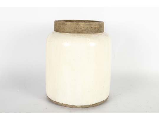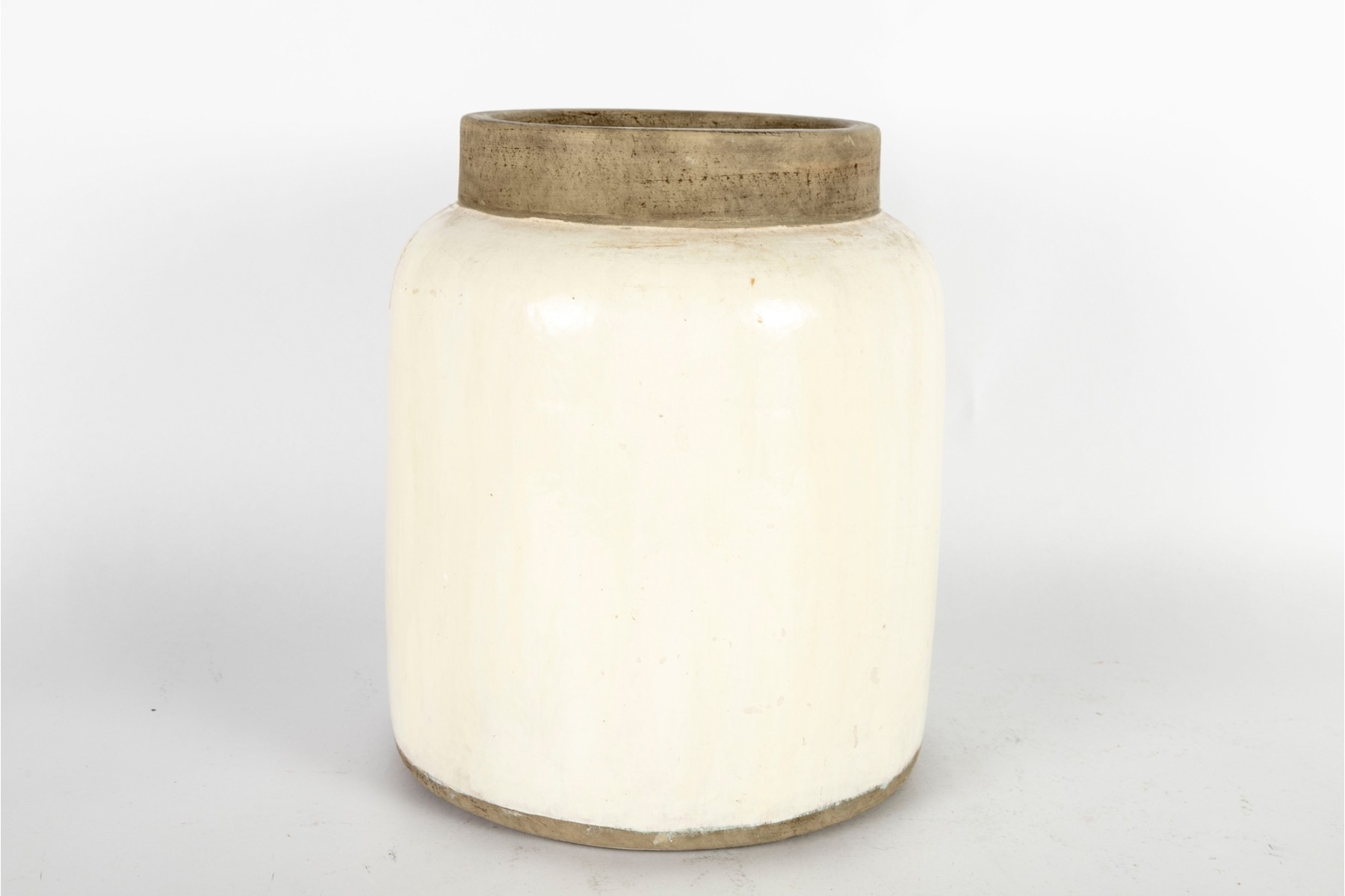 A decorative ceramic pot with an off-white crackle glaze for a distressed look, contrasting with text left matte.