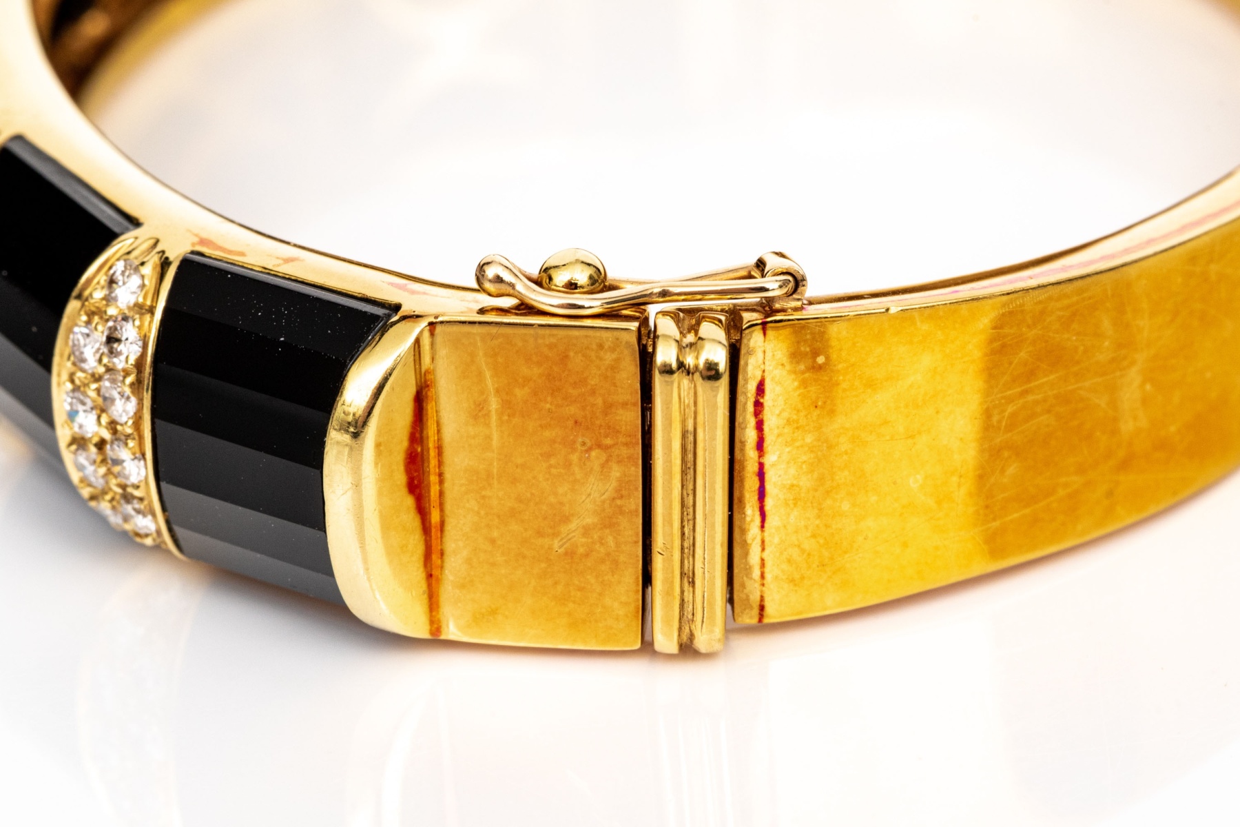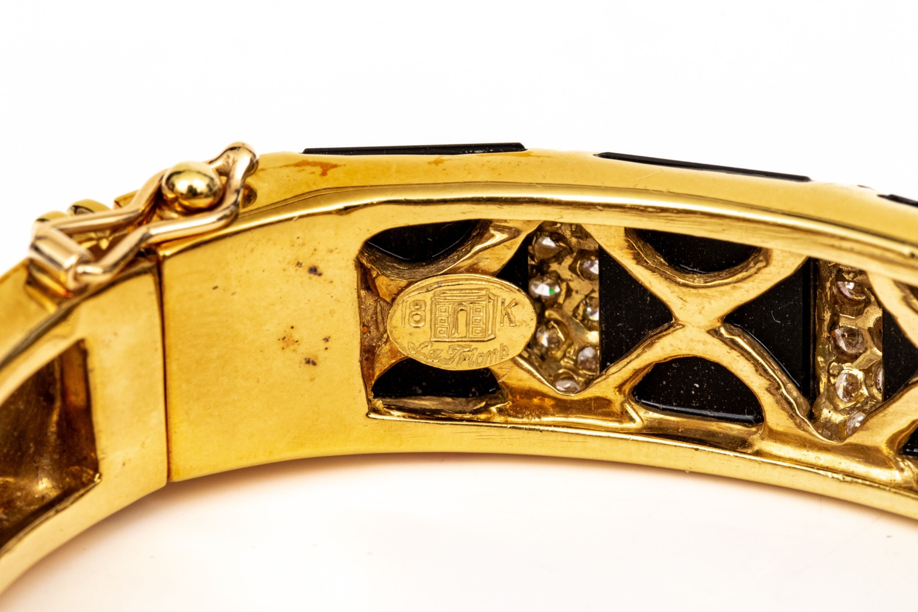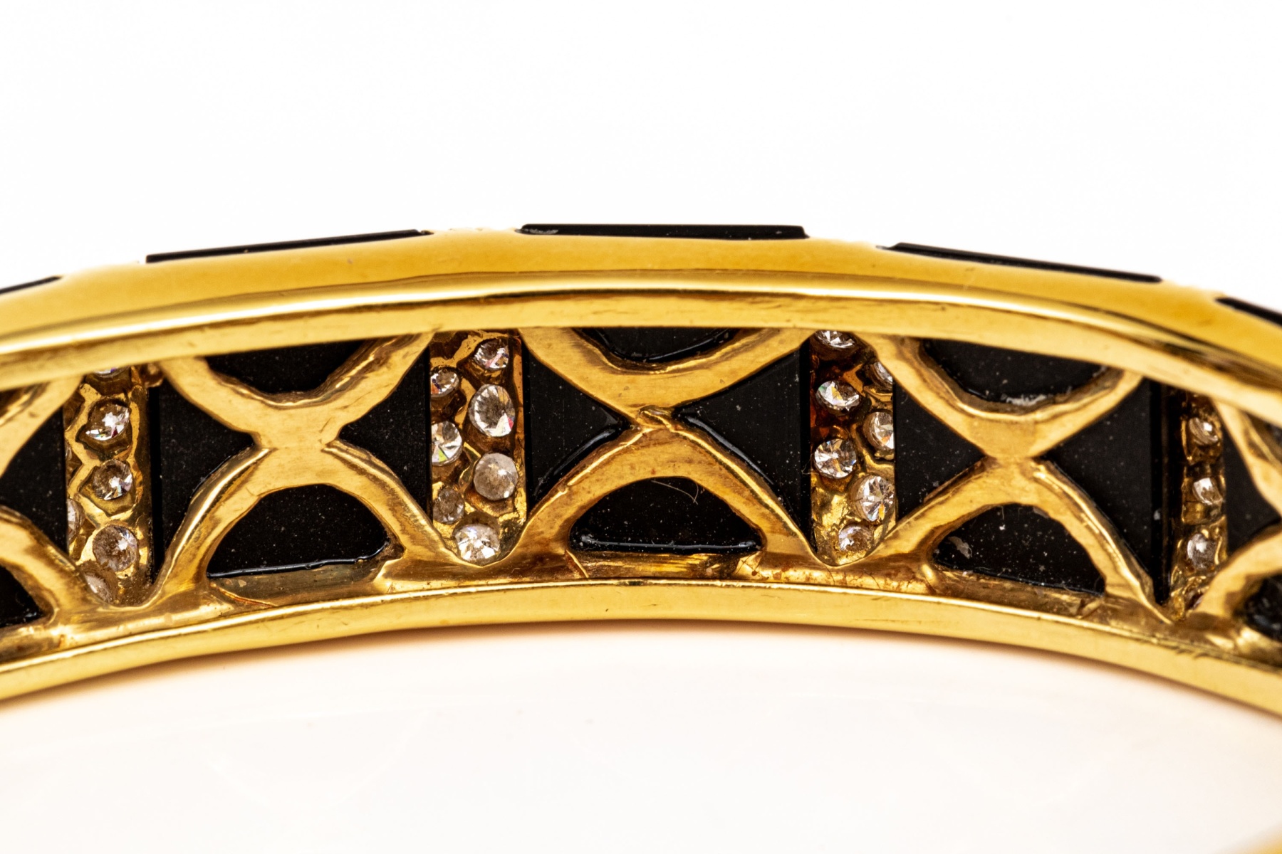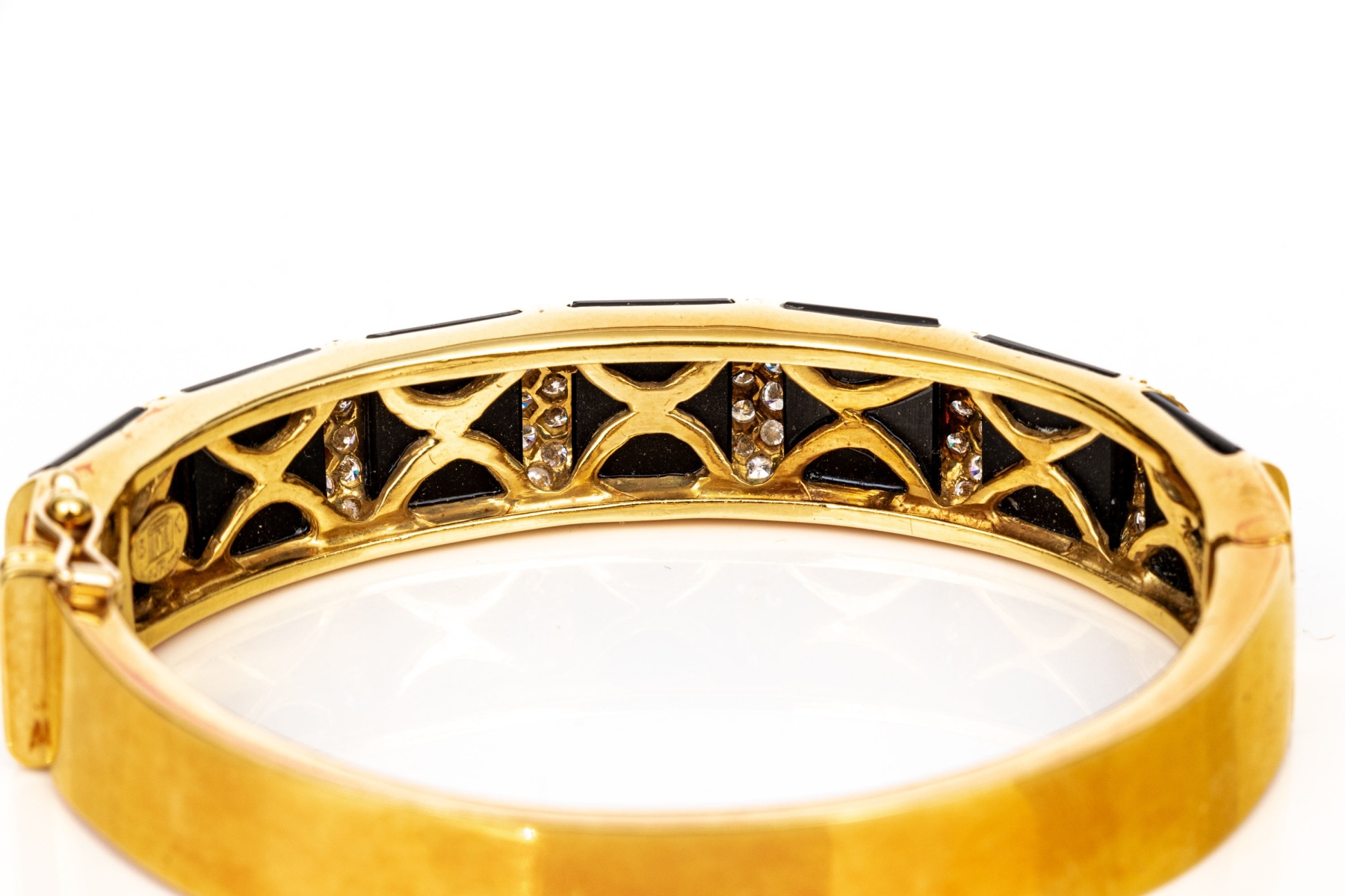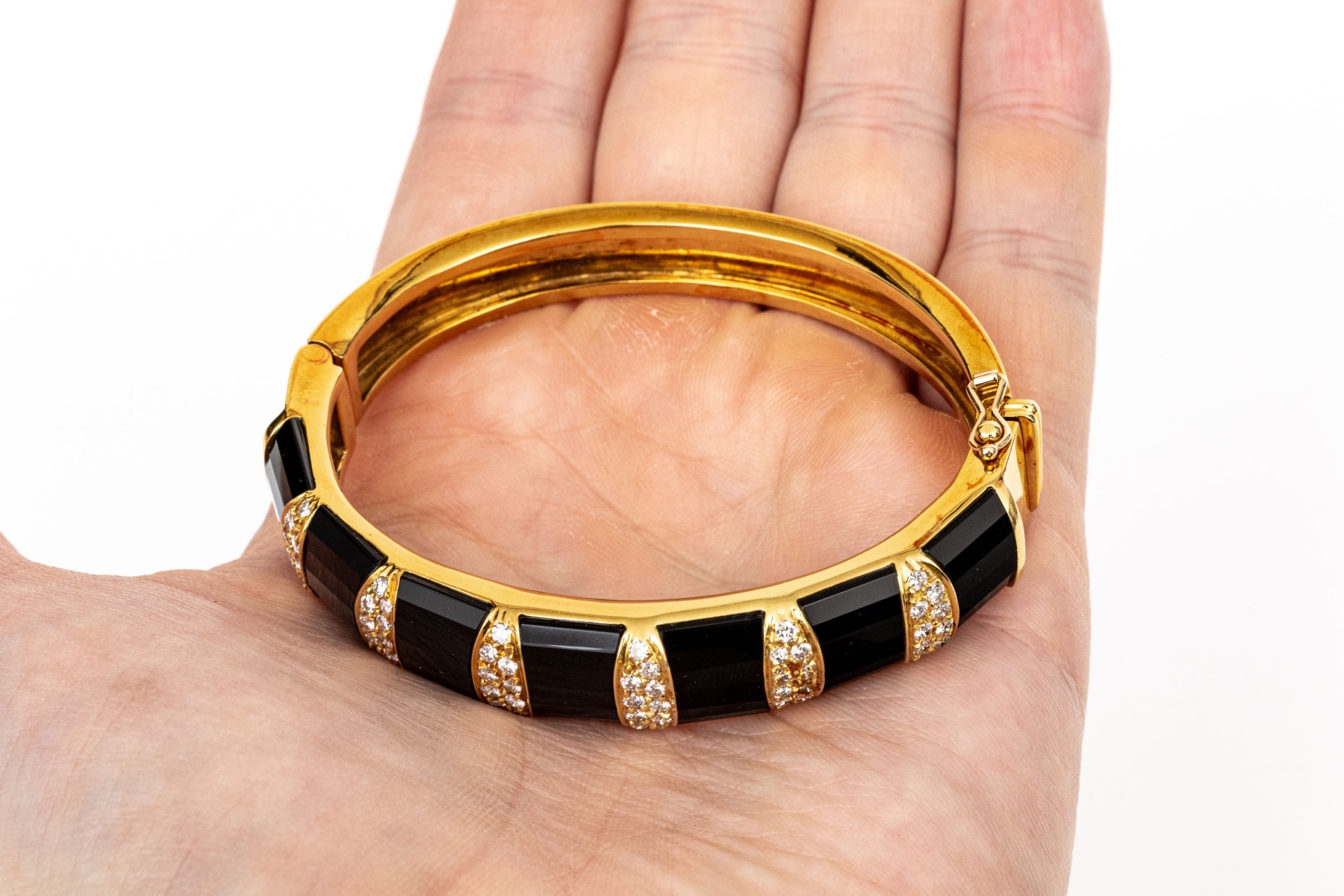 La Triomphe 18k yellow gold stunning vintage black onyx and pave diamond bangle bracelet. This gorgeous hinged bangle bracelet features faceted tiles of black onyx, alternating with pave set round faceted diamonds, app. 1.20 TCW, and is finished with a discreet push button clasp and a figure eight safety.