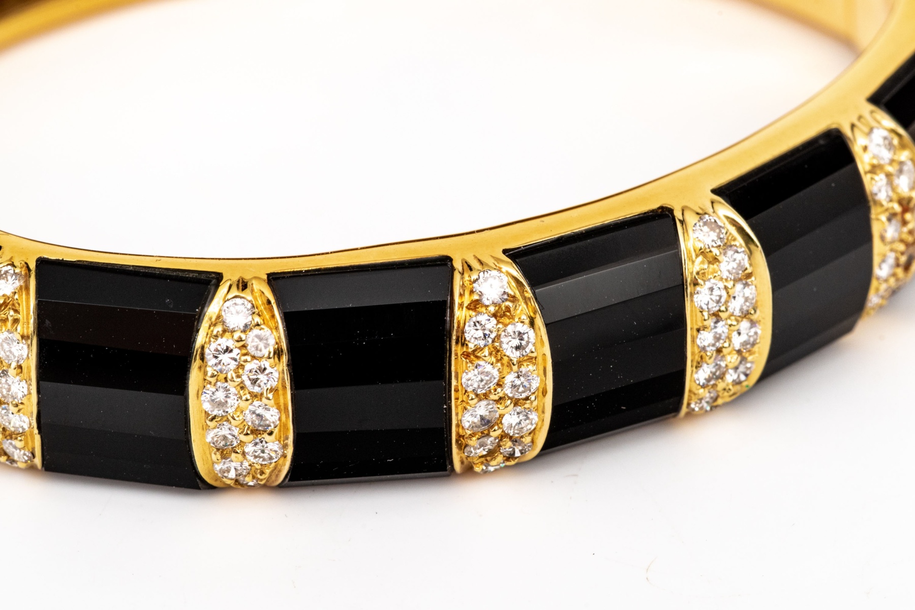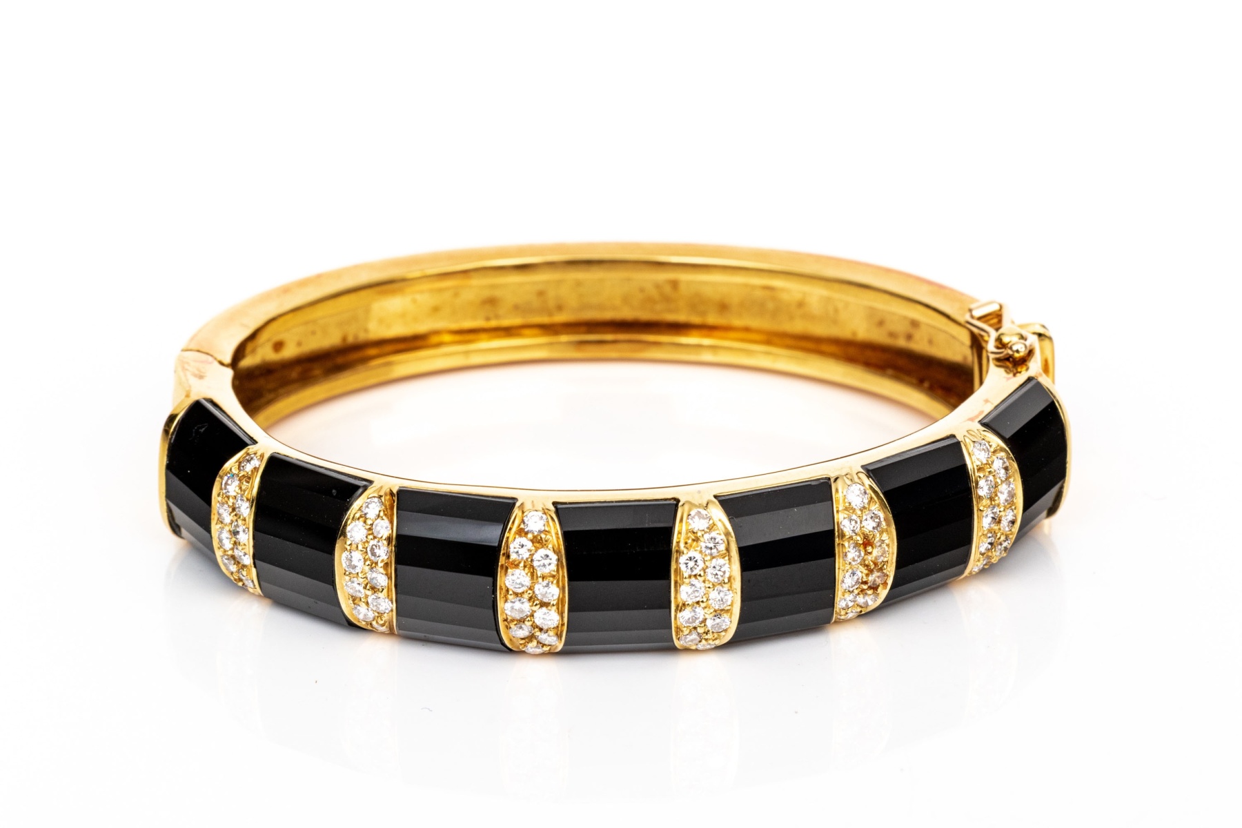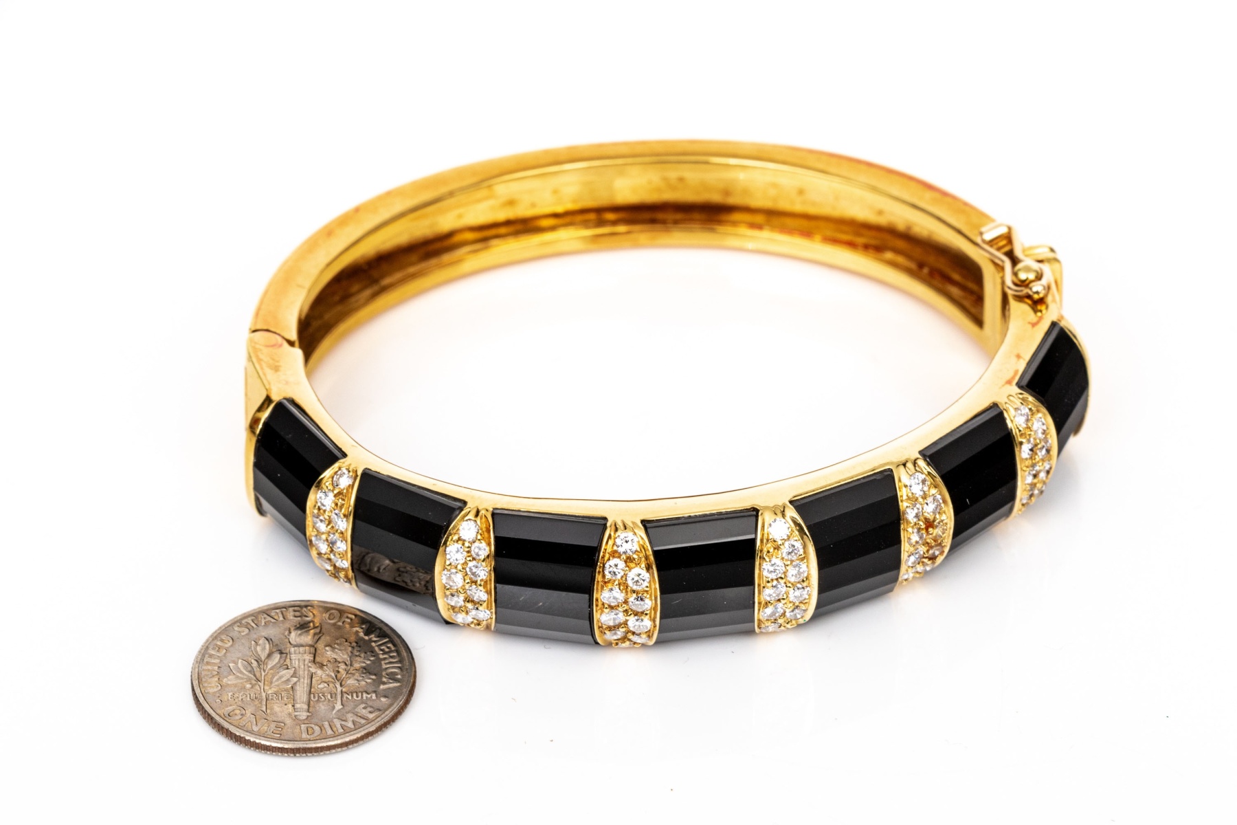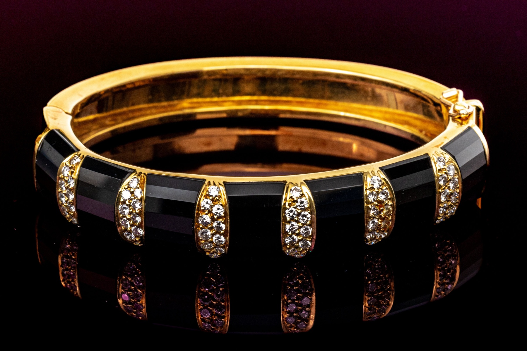 La Triomphe 18k yellow gold stunning vintage black onyx and pave diamond bangle bracelet. This gorgeous hinged bangle bracelet features faceted tiles of black onyx, alternating with pave set round faceted diamonds, app. 1.20 TCW, and is finished with a discreet push button clasp and a figure eight safety.