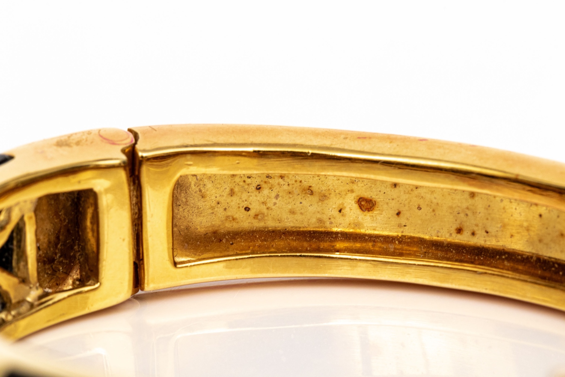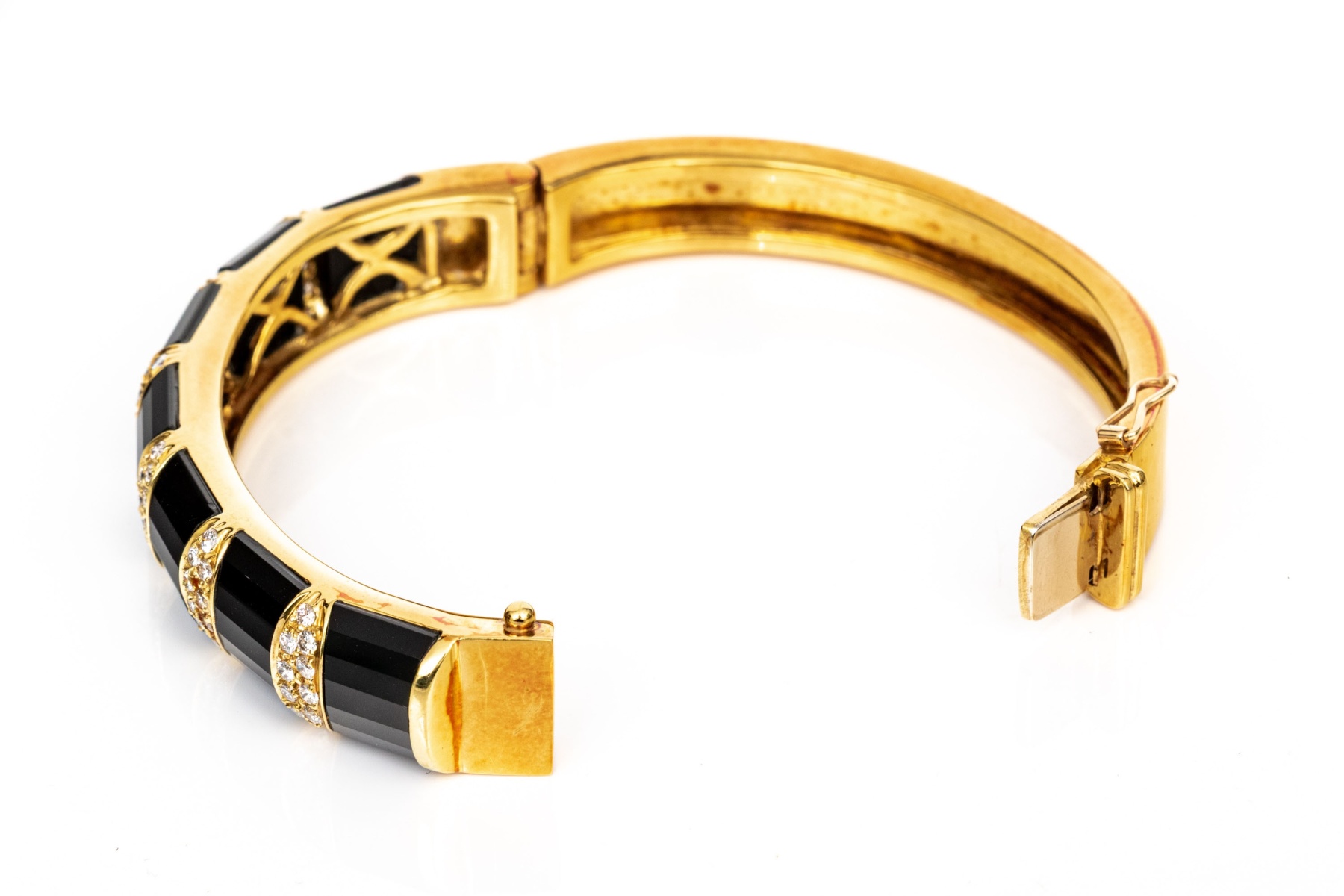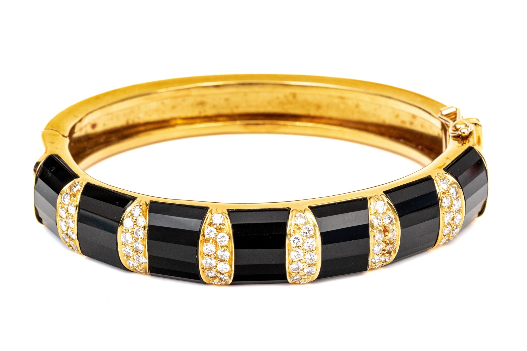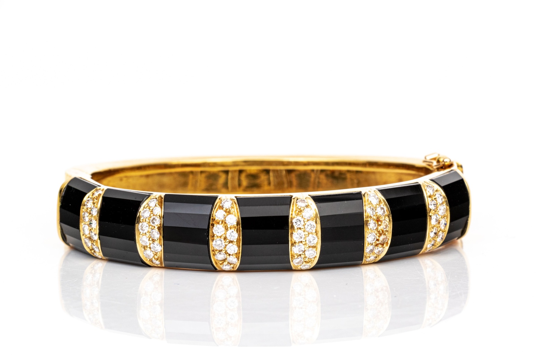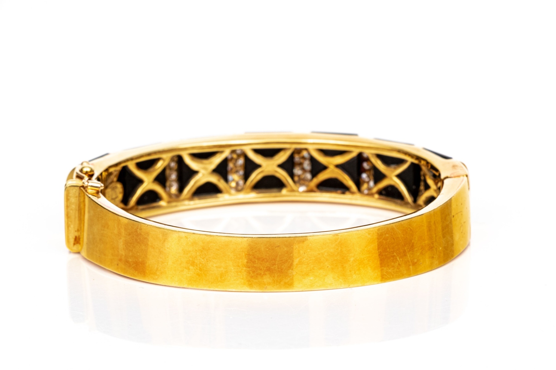 La Triomphe 18k yellow gold stunning vintage black onyx and pave diamond bangle bracelet. This gorgeous hinged bangle bracelet features faceted tiles of black onyx, alternating with pave set round faceted diamonds, app. 1.20 TCW, and is finished with a discreet push button clasp and a figure eight safety.