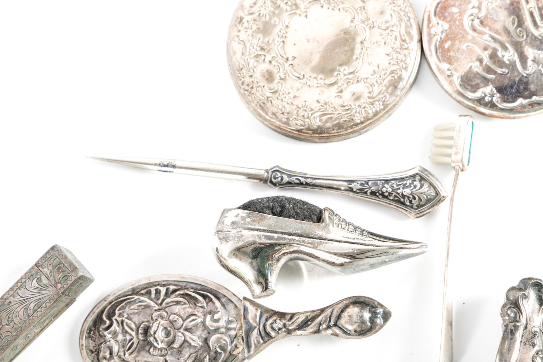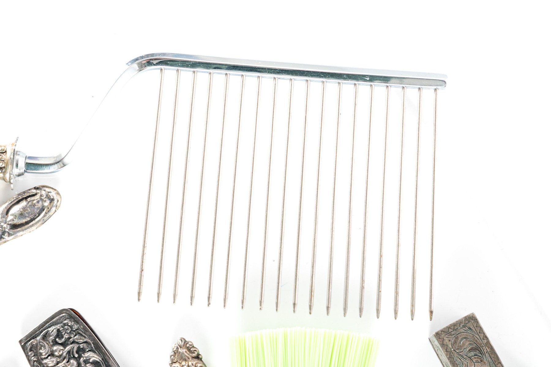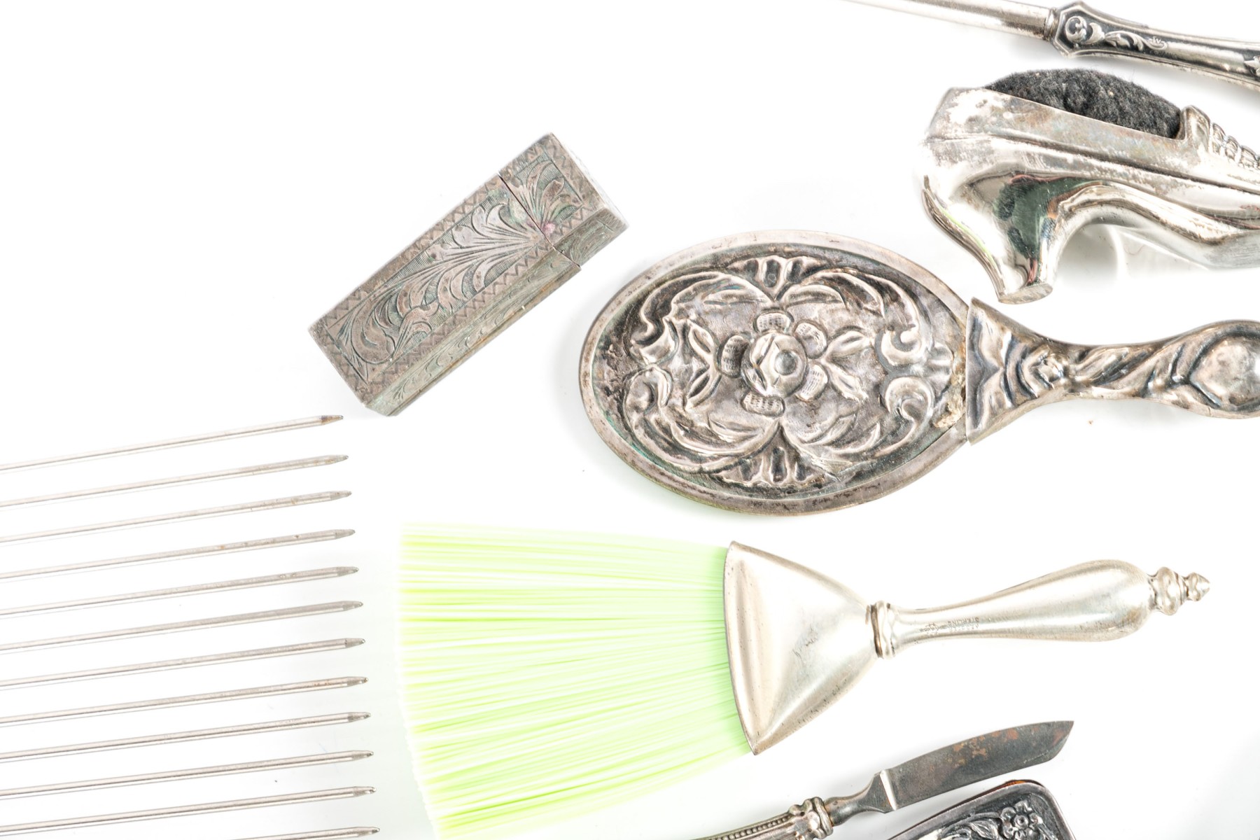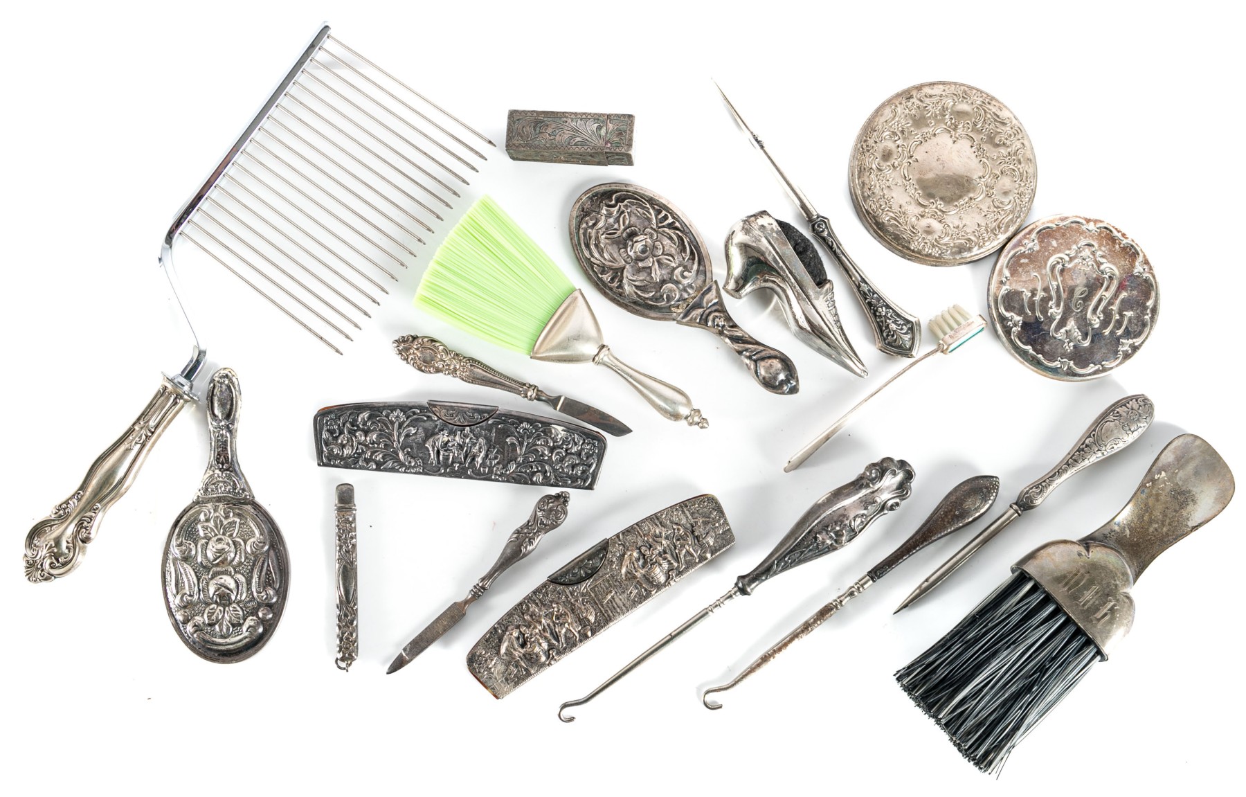 An excellent assortment of vintage and antique ladies' vanity accessories, including a variety of small mirrors, combs, brushes, awls, button hooks, nail files, and shoehorns. Also includes a cake cutter comb, an 800 silver lipstick tube, and a silverplated shoe-form pin cushion.