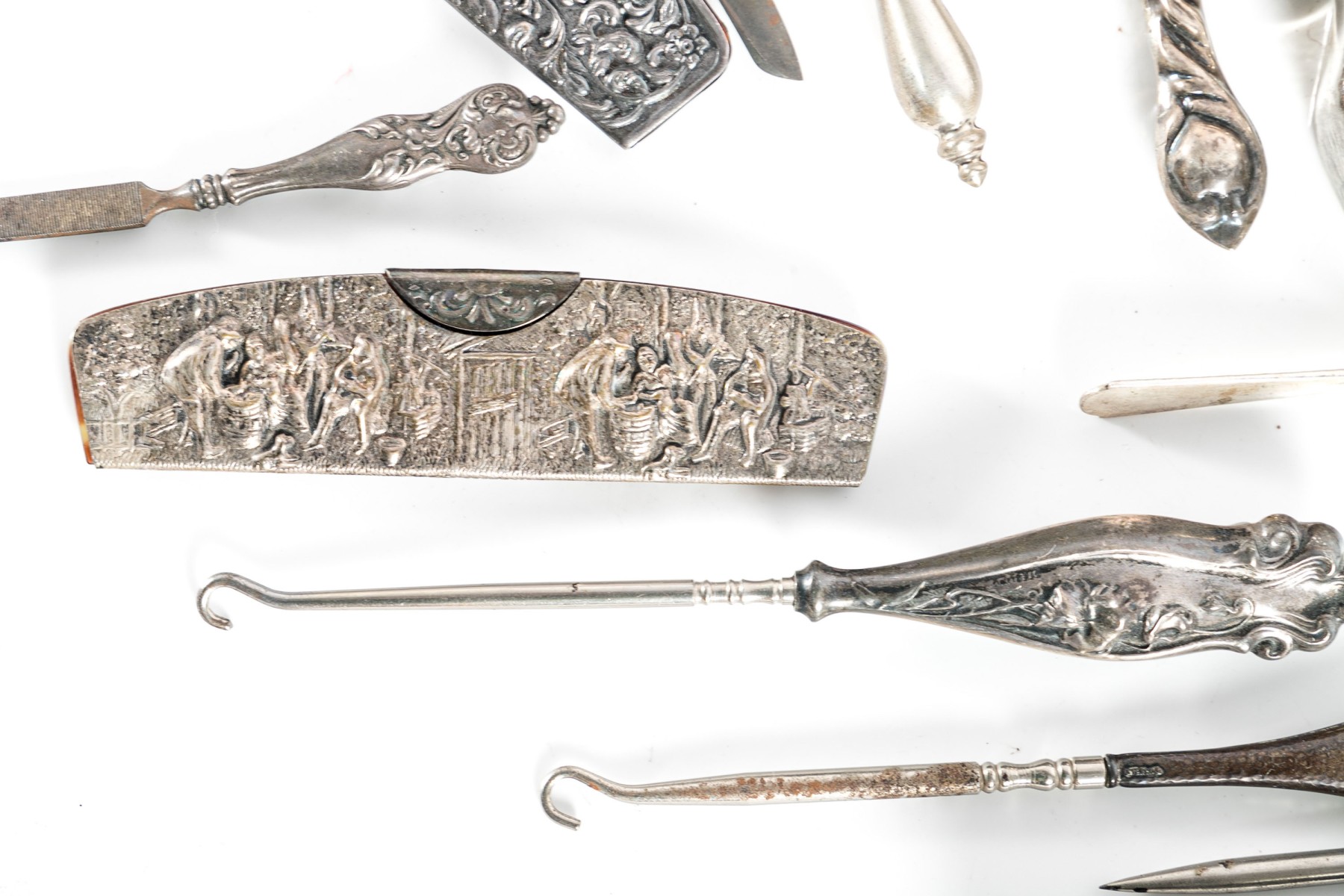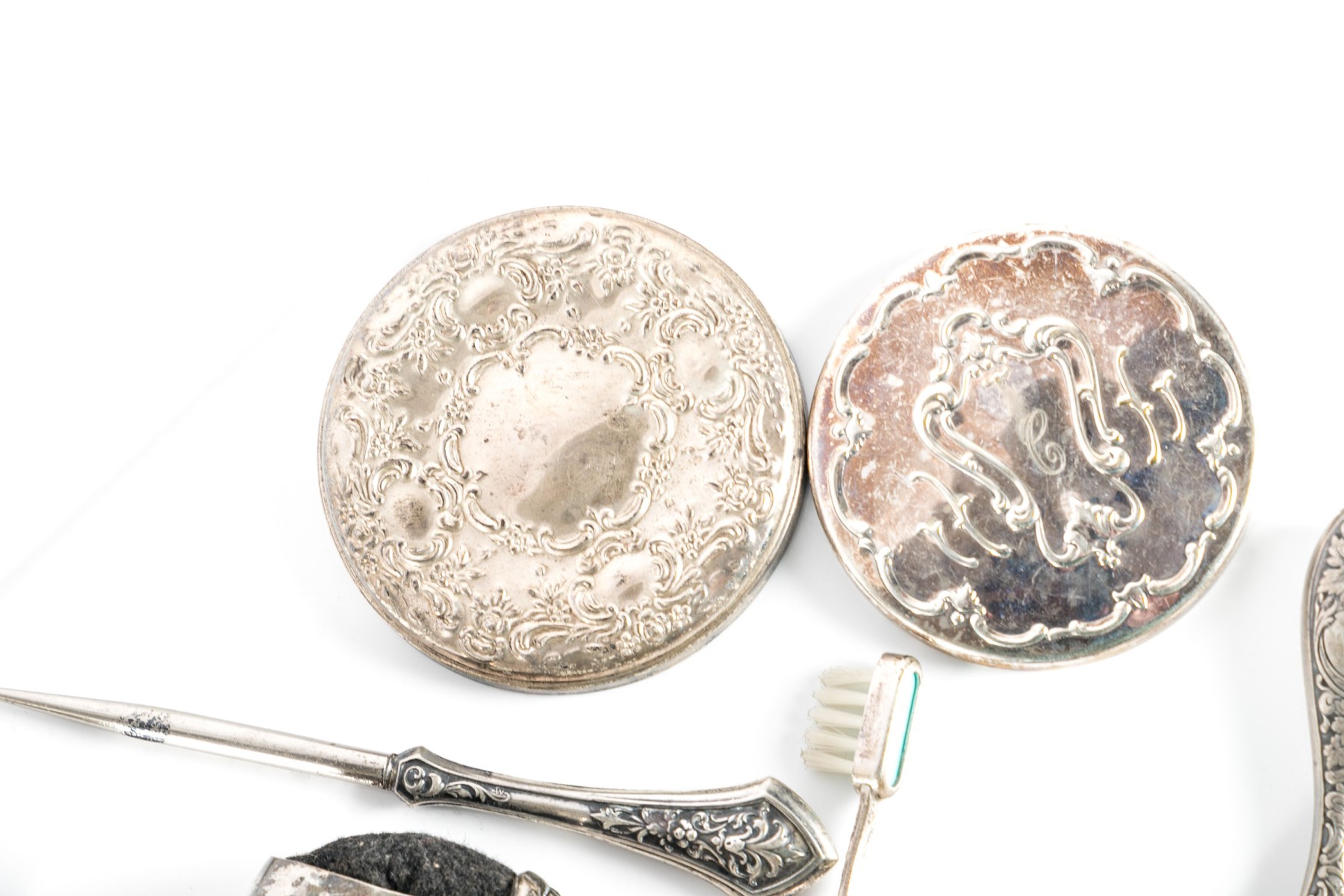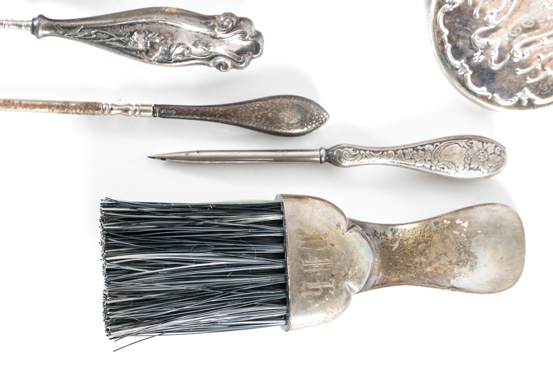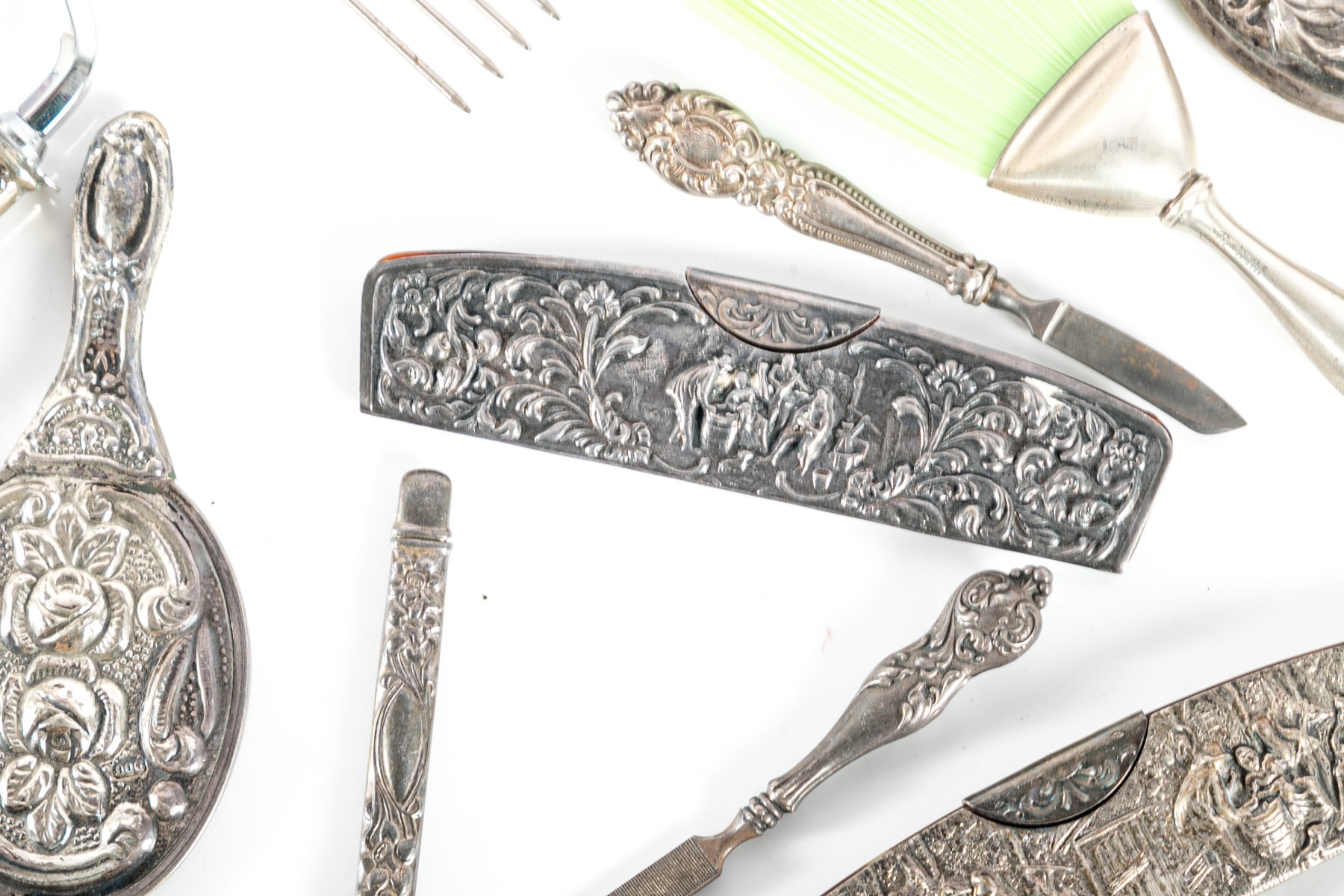 An excellent assortment of vintage and antique ladies' vanity accessories, including a variety of small mirrors, combs, brushes, awls, button hooks, nail files, and shoehorns. Also includes a cake cutter comb, an 800 silver lipstick tube, and a silverplated shoe-form pin cushion.