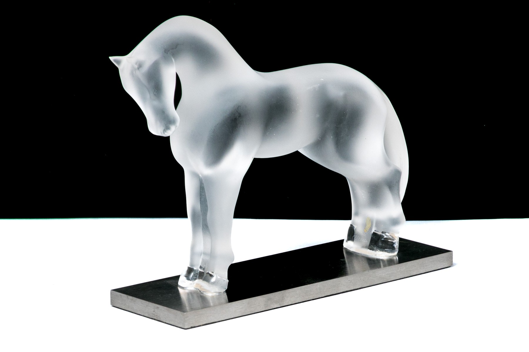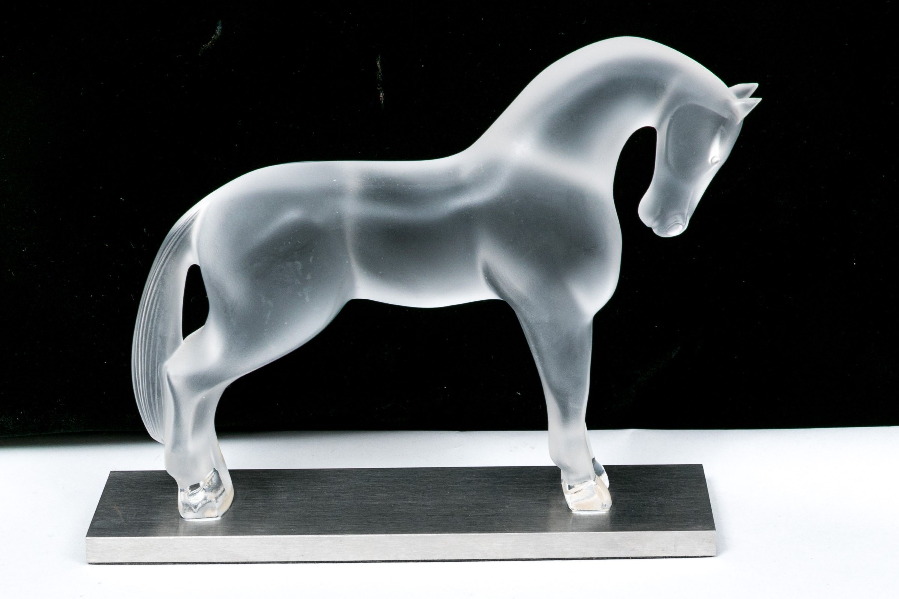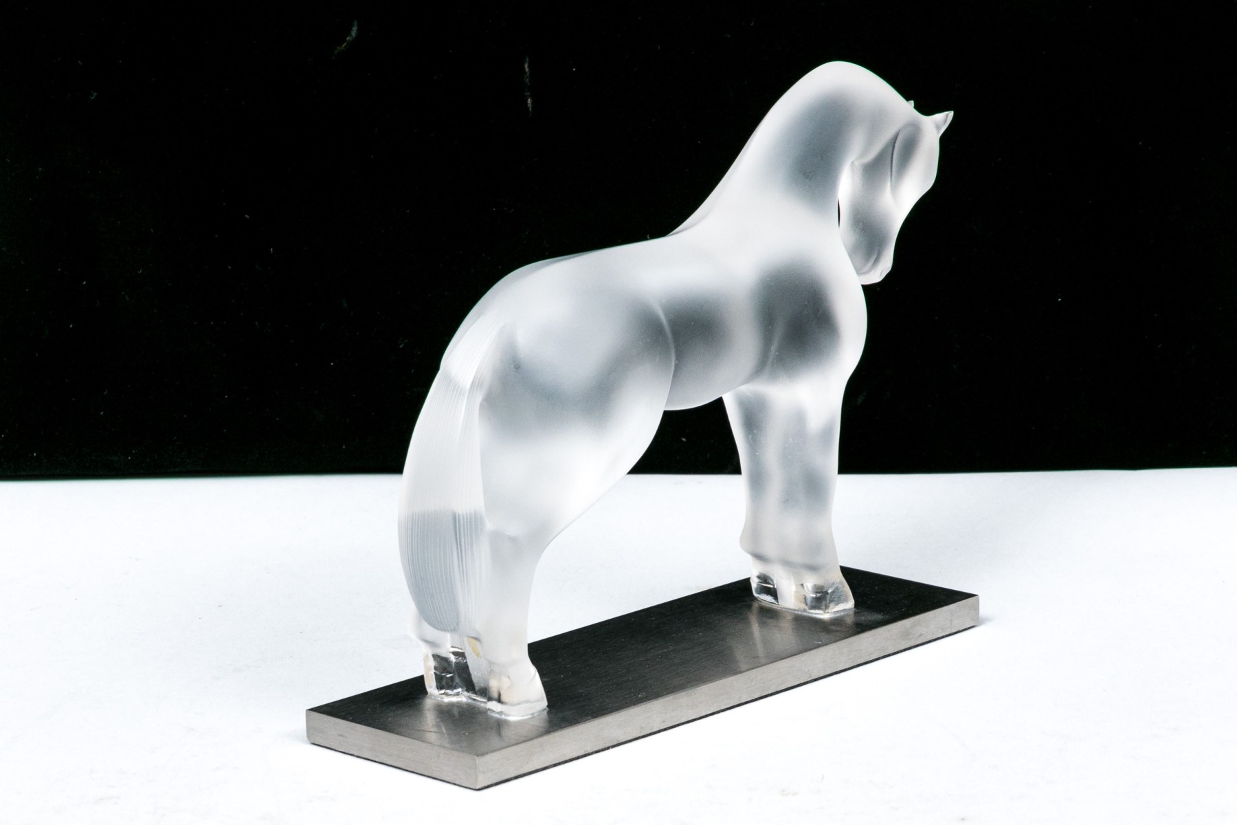 Signed Lalique France, A design by Marc Lalique ca, 1970. An elegant standing horse figure with its head down in frosted and polished glass and mounted on a brushed metal base.