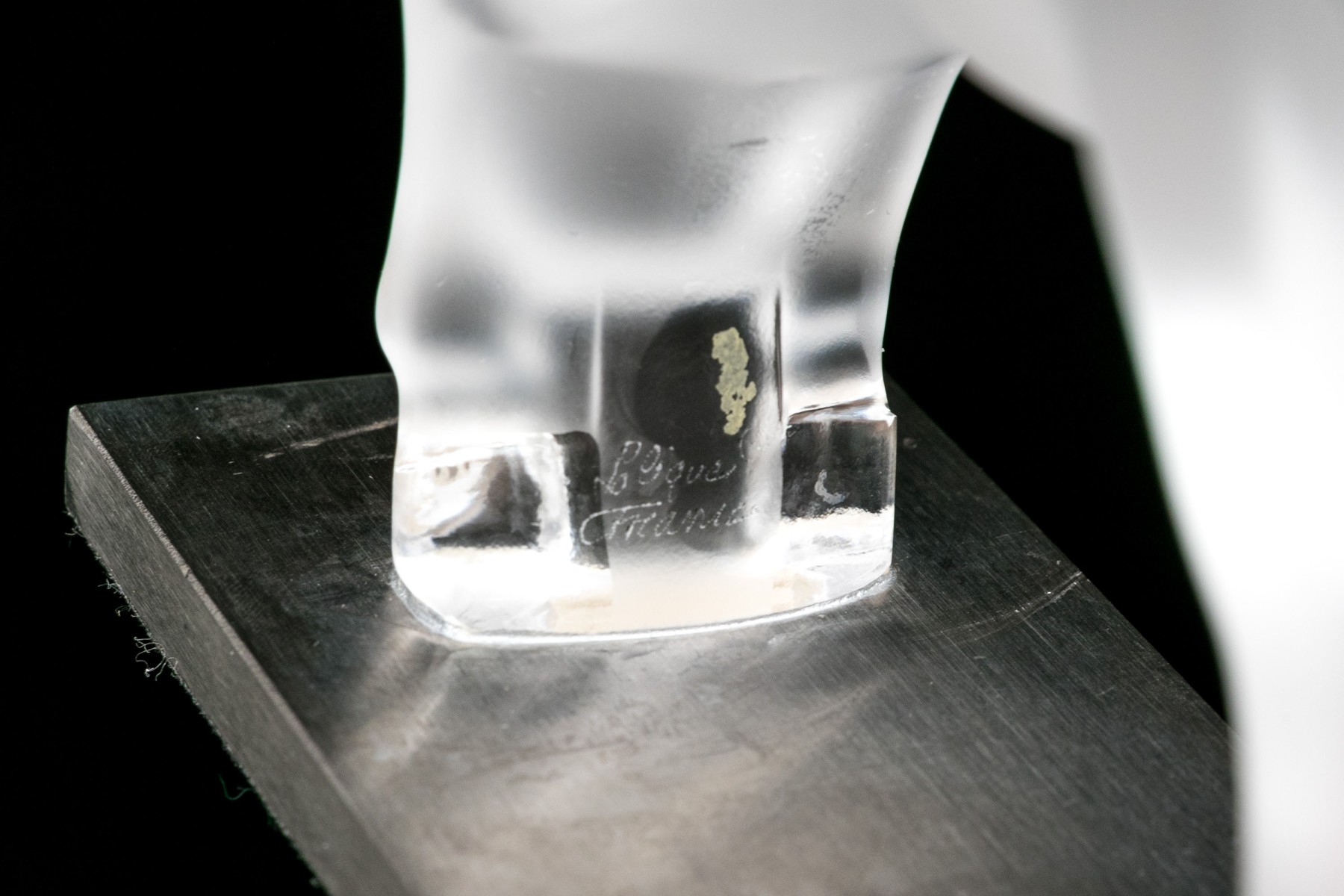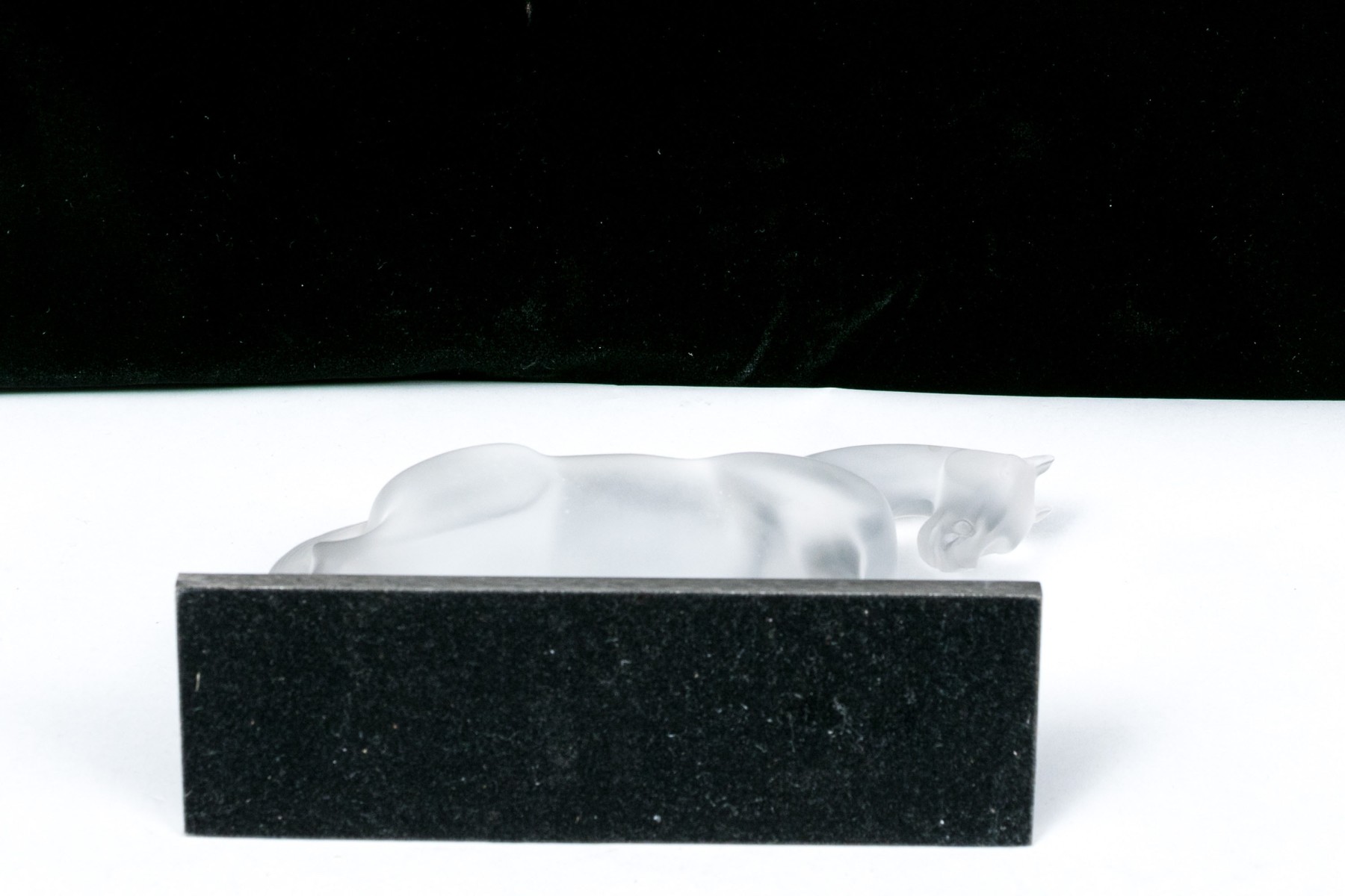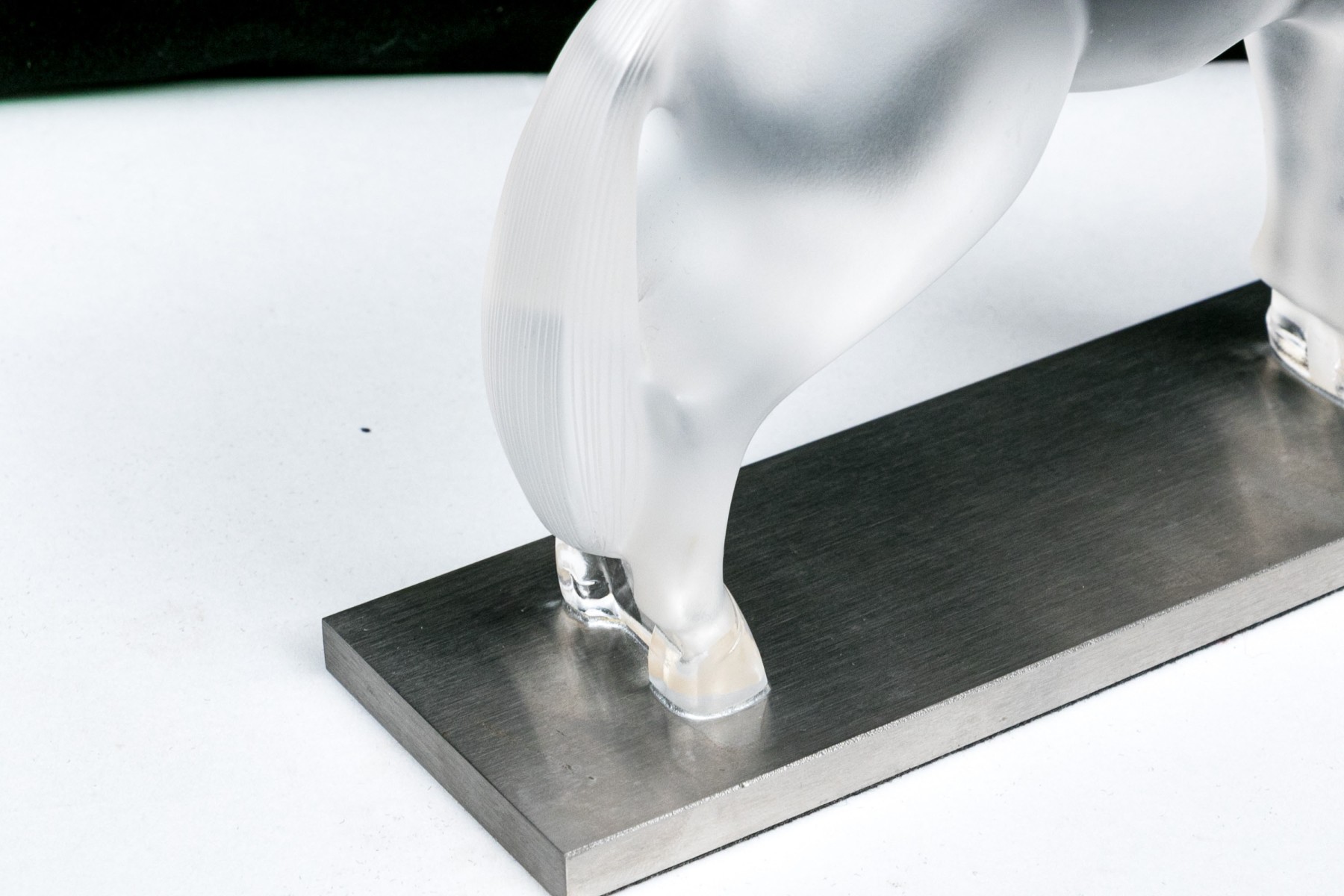 Signed Lalique France, A design by Marc Lalique ca, 1970. An elegant standing horse figure with its head down in frosted and polished glass and mounted on a brushed metal base.