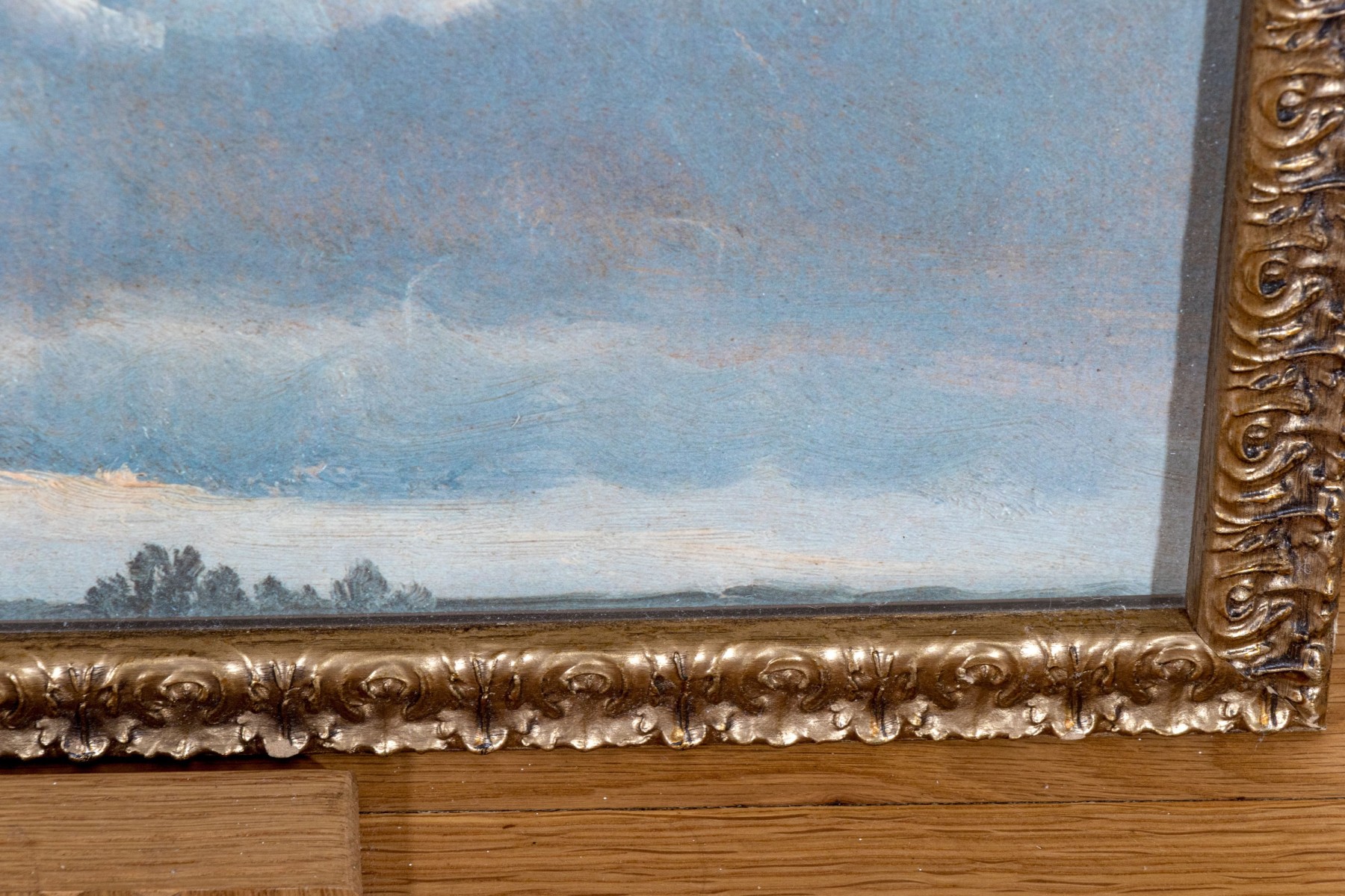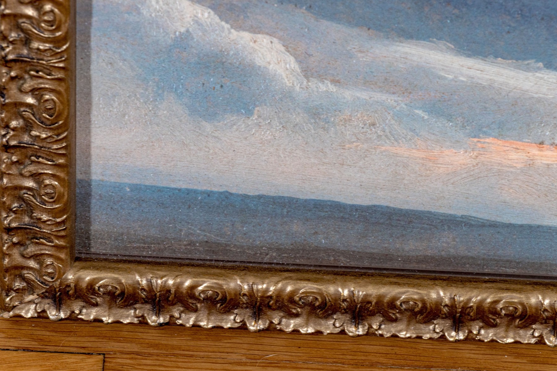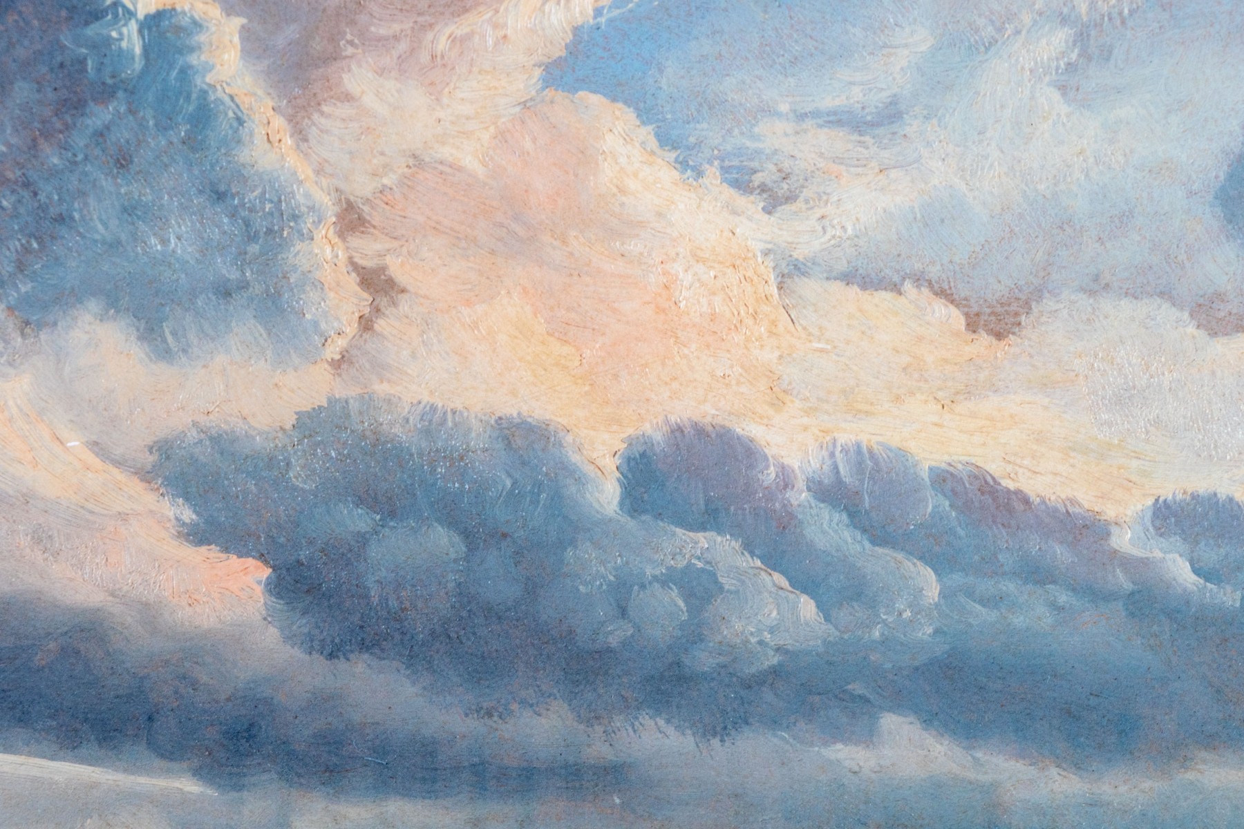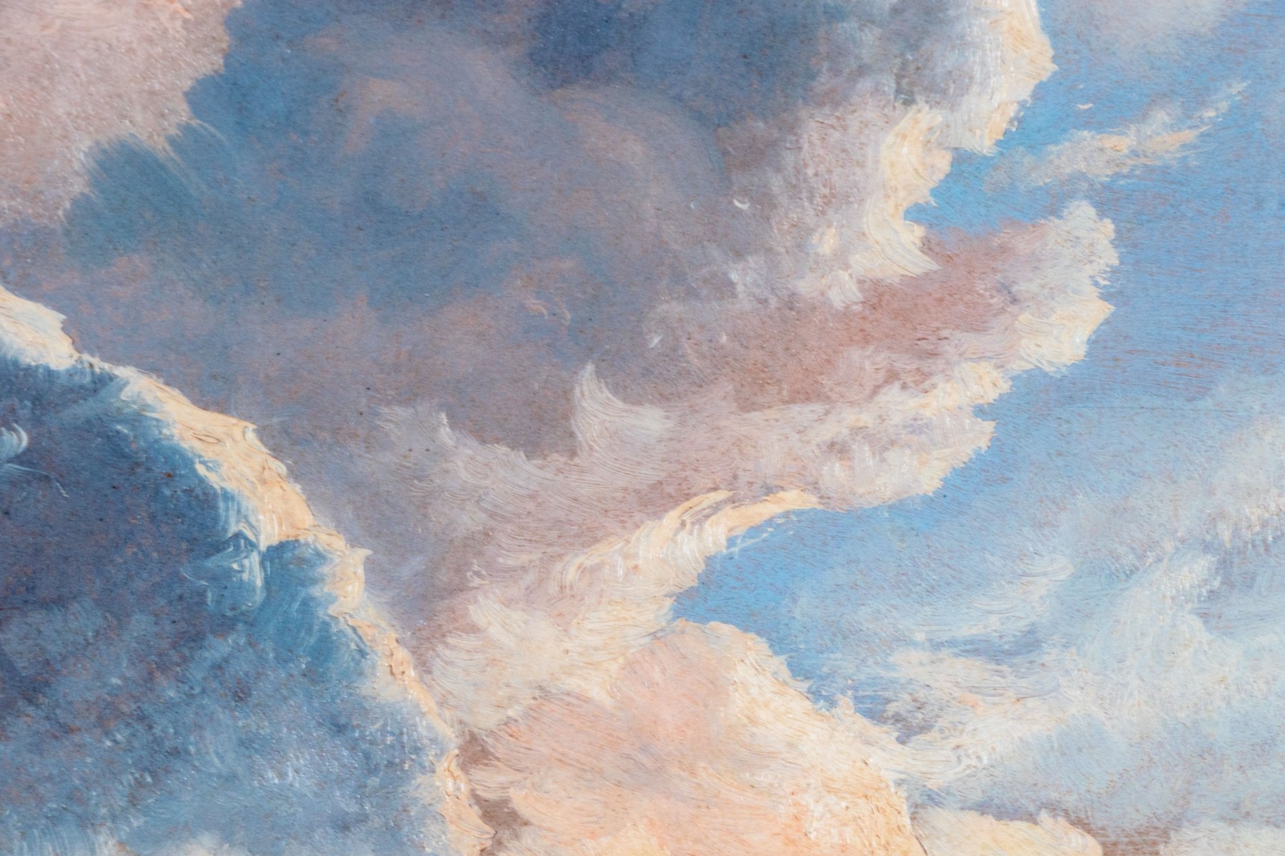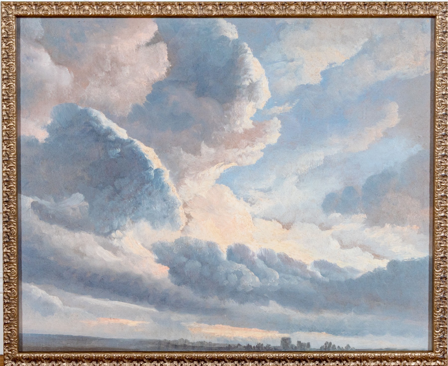 A stunning gouache painting on paper depicting a landscape with a thin band of land dotted with foliage across the bottom scaled by the impressive sky above, beautifully detailed with billowing clouds in soft pink, peach, blue, and white. The clouds conceal the sun beneath, which casts a warm glow at the center of the composition. Appears to to be unsigned.